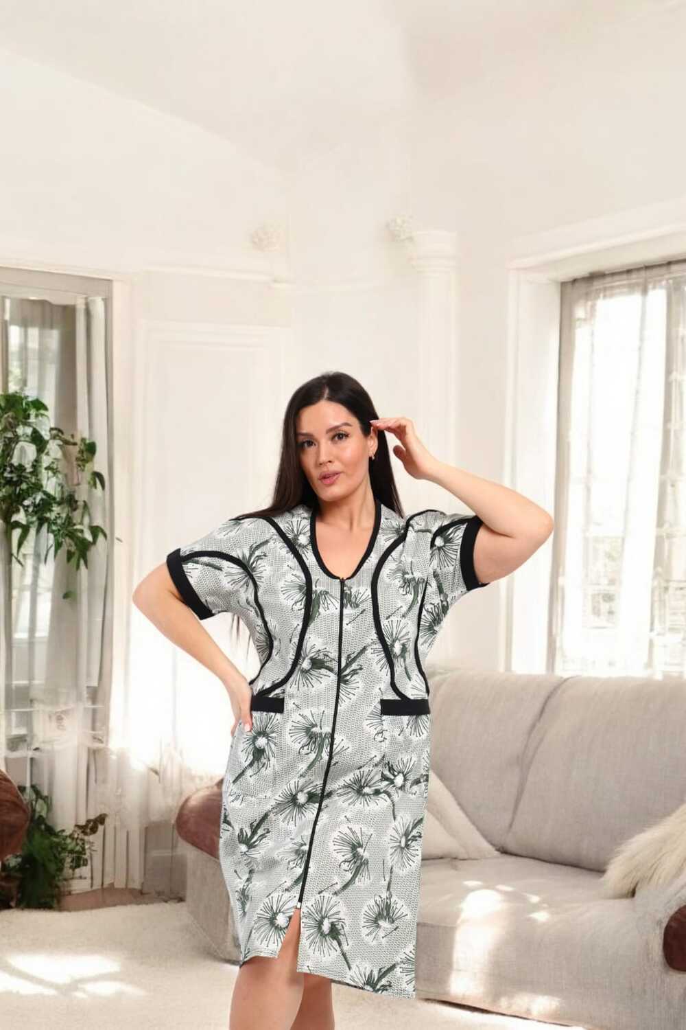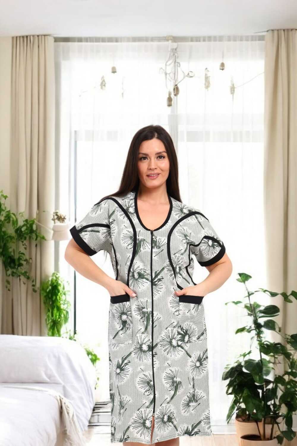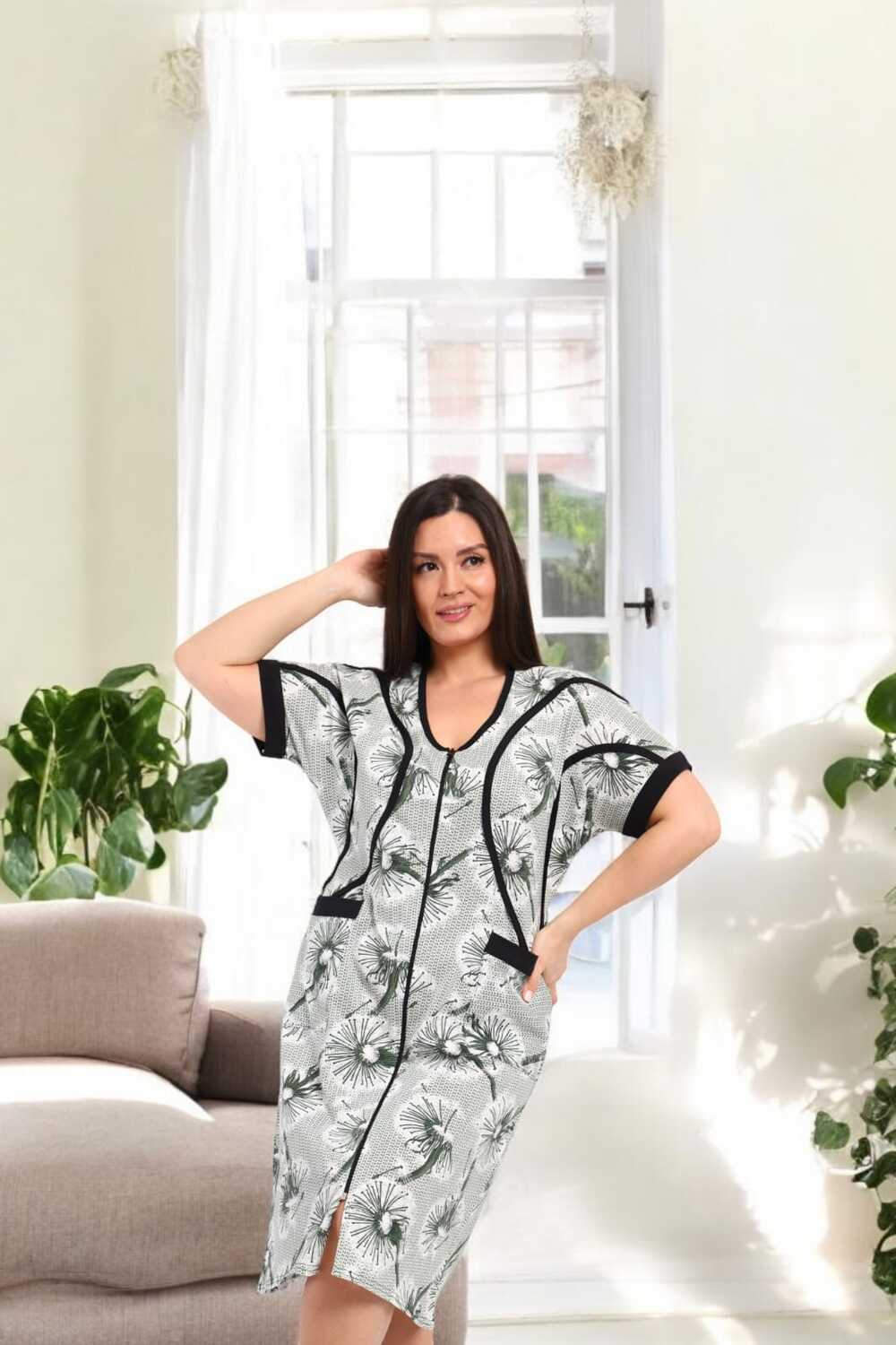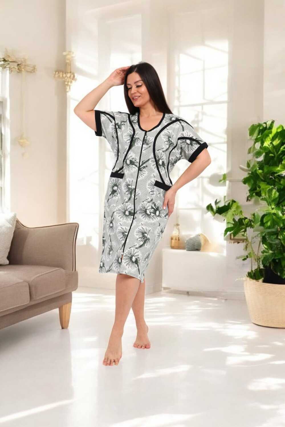 В удобном домашнем халате на молнии с короткими рукавами и длиной до колен. Халат выполнен в светлых тонах с изящным цветочным принтом и дополнен контрастной черной окантовкой, придающей ему стильный вид. Функциональные карманы спереди делают модель практичной для повседневного ношения.