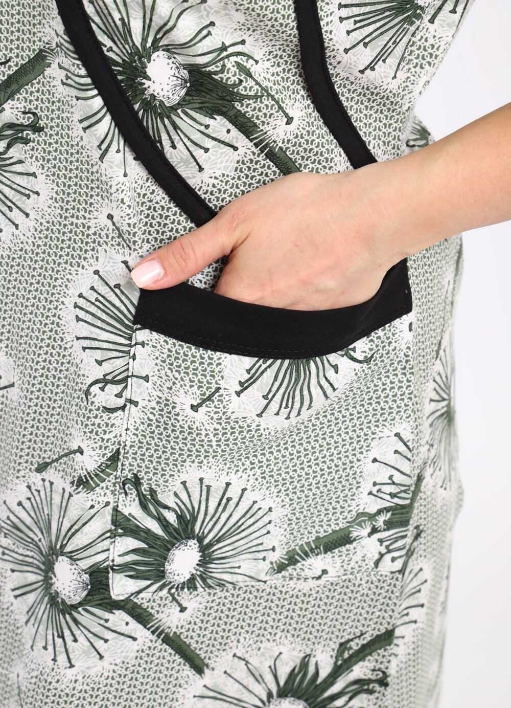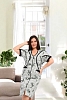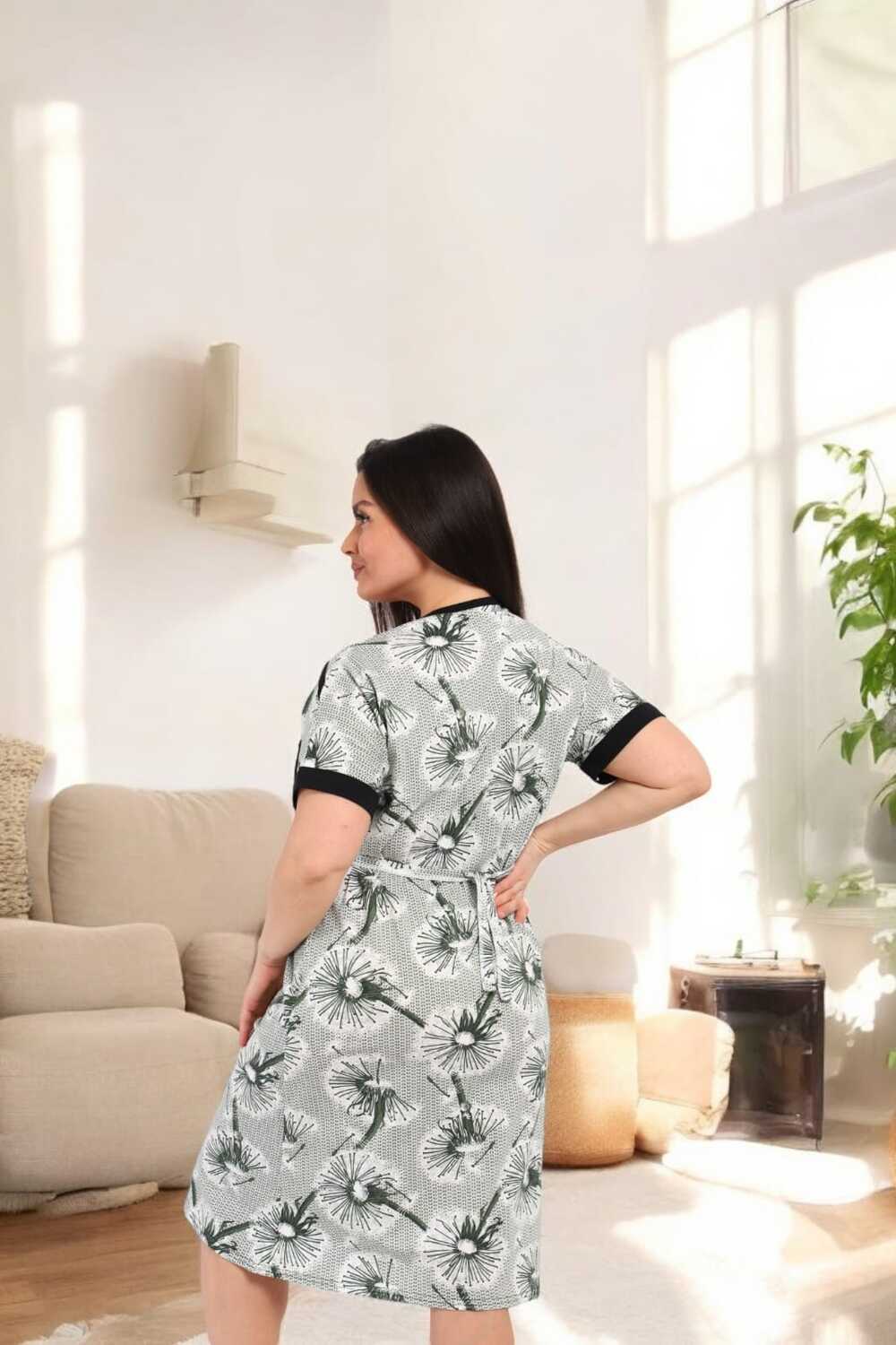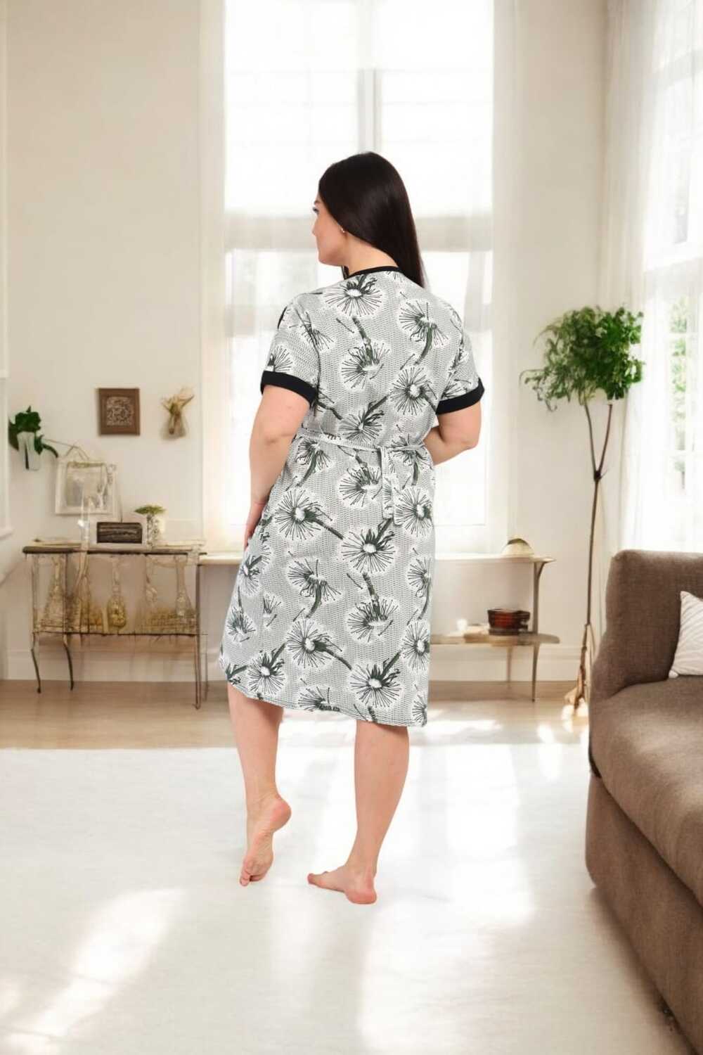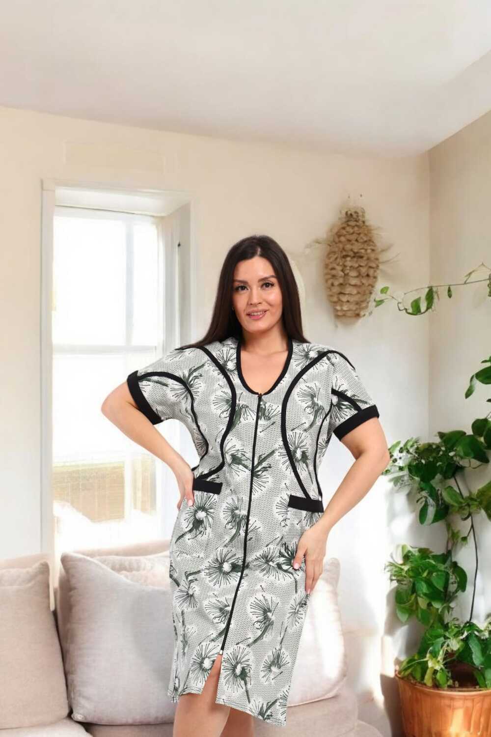 В удобном домашнем халате на молнии с короткими рукавами и длиной до колен. Халат выполнен в светлых тонах с изящным цветочным принтом и дополнен контрастной черной окантовкой, придающей ему стильный вид. Функциональные карманы спереди делают модель практичной для повседневного ношения.