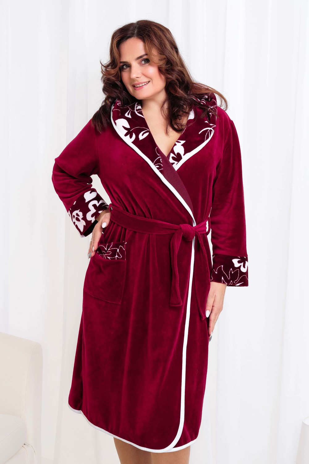 Халат женский на запах из велюра, длиной ниже колена, с капюшоном и накладным карманом, рукав с манжетами. Классическая модель подходит как повседневный вариант домашней одежды. Мягкий, удобный и практичный.