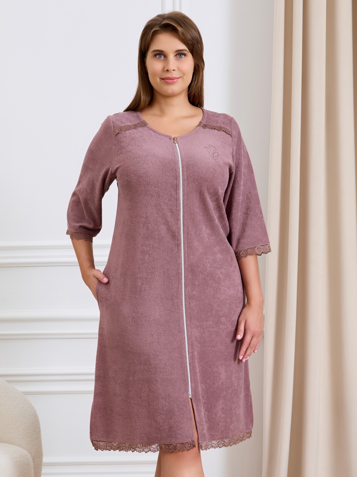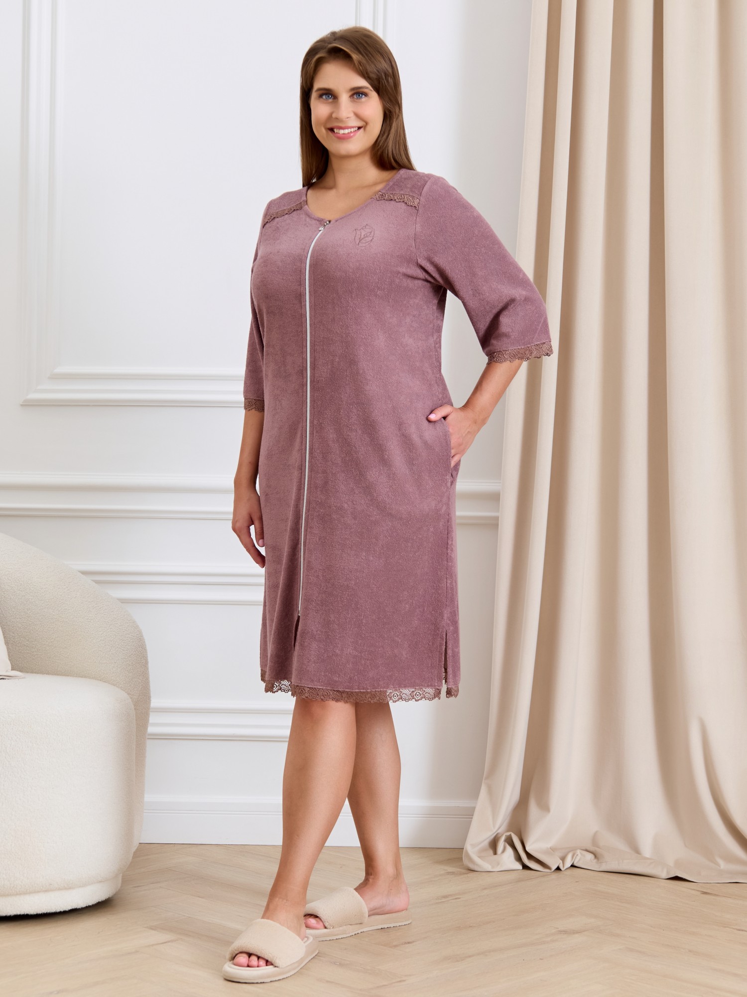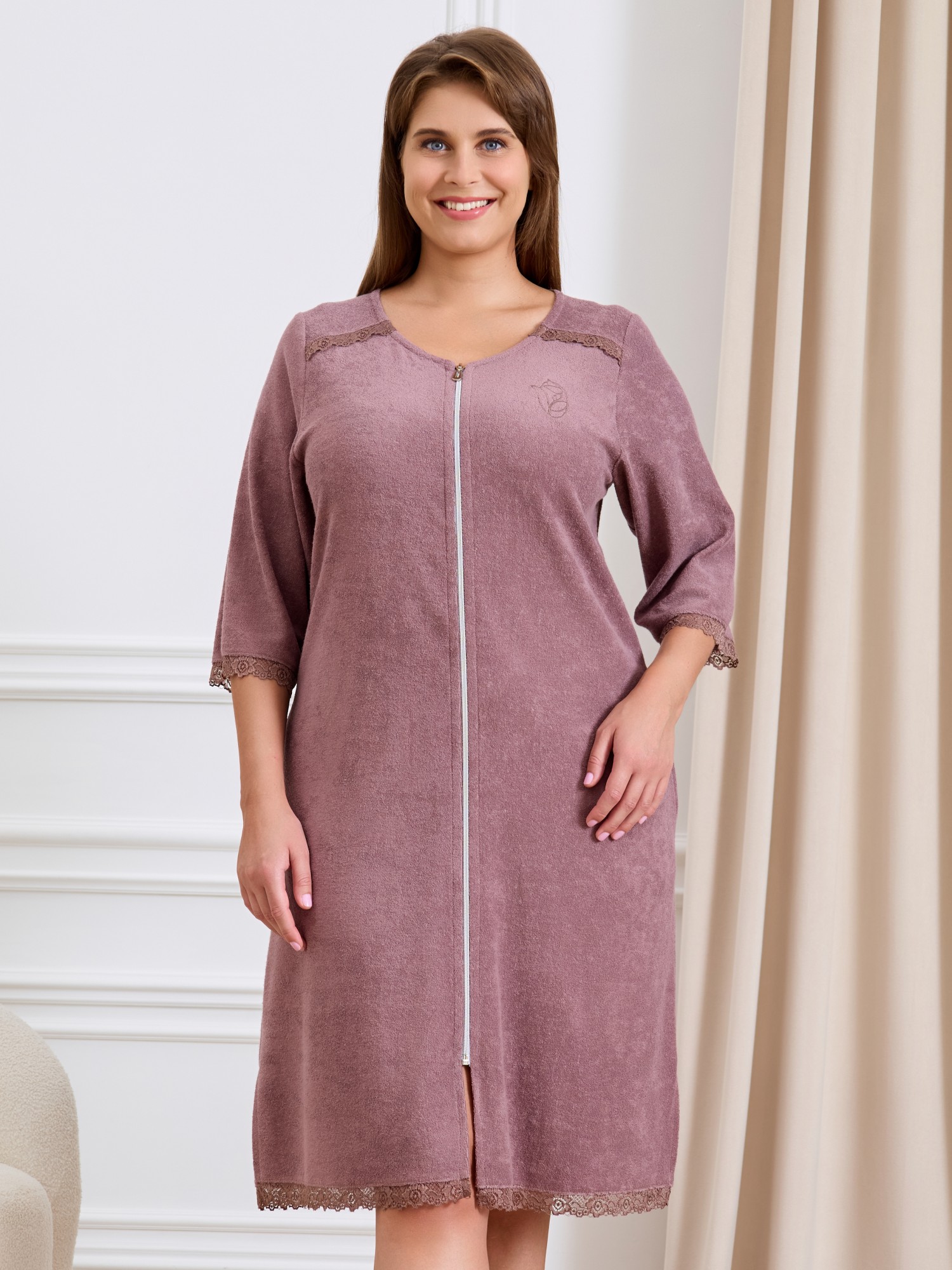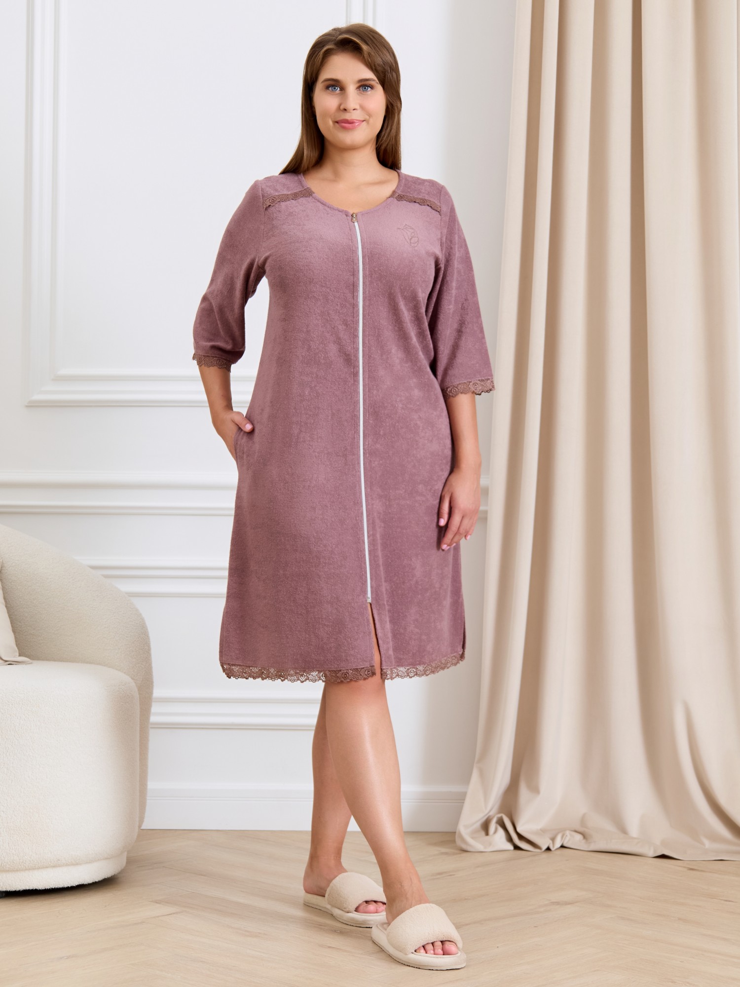 Халат женский из гладкокрашенного трикотажного махрового полотна, прямого силуэта, с горловиной овальной формы, втачными рукавами длиной ¾ длины, карманами в боковых швах и центральной бортовой застежкой на тесьму «молния». Полочка – с двумя небольшими косыми кокетками с кружевом в швах соединения кокеток с основными деталями, на левой полочке выполнена вышивка. Нижние срезы рукавов и нижние срезы изделия обработаны кружевом, в боковых швах разрезы.