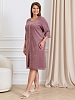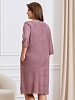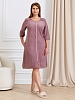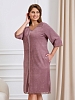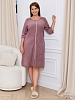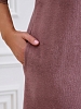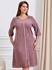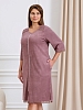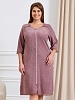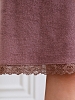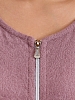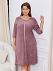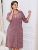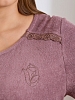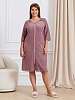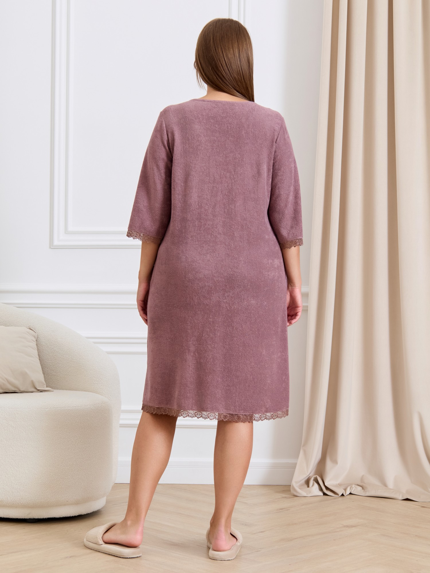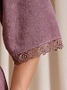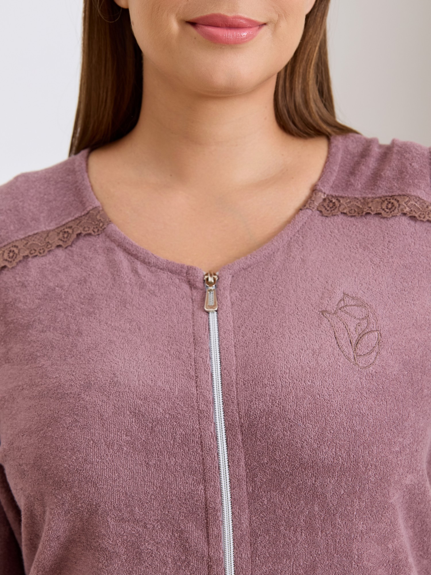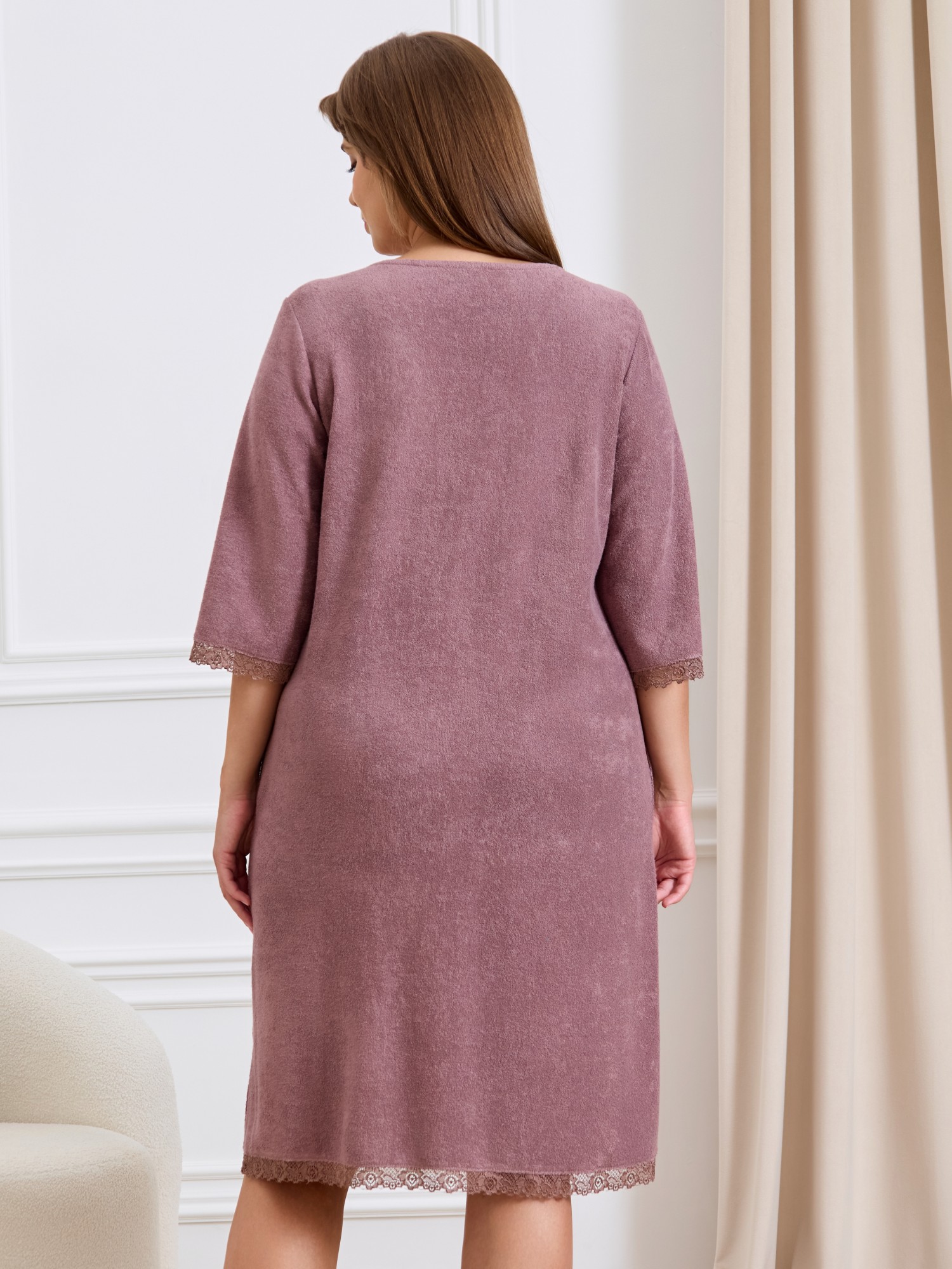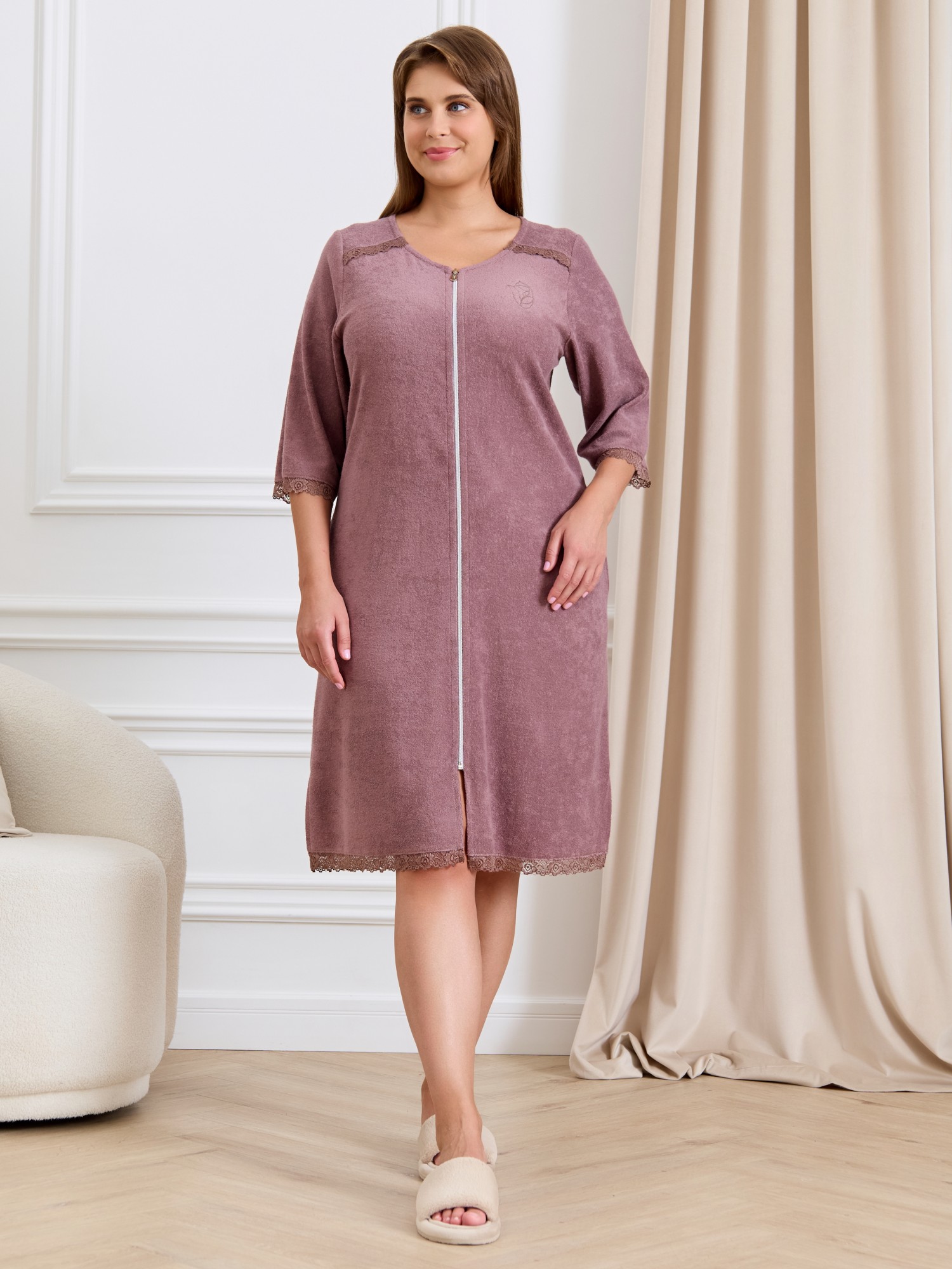 Халат женский из гладкокрашенного трикотажного махрового полотна, прямого силуэта, с горловиной овальной формы, втачными рукавами длиной ¾ длины, карманами в боковых швах и центральной бортовой застежкой на тесьму «молния». Полочка – с двумя небольшими косыми кокетками с кружевом в швах соединения кокеток с основными деталями, на левой полочке выполнена вышивка. Нижние срезы рукавов и нижние срезы изделия обработаны кружевом, в боковых швах разрезы.