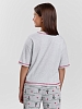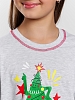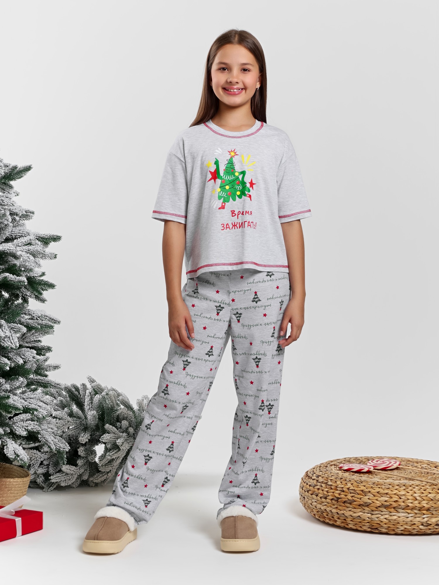 Костюм для девочки из трикотажного полотна в комбинации двух видов: полотна "кулирка-кармеланж" и полотна "кулирка"с набивным тематическим рисунком , состоящий из футболки и брюк. Футболка - модного силуэта, слегка укороченная свободного покроя, с приспущенным плечом, с втачными рукавами длиной до локтя, горловиной овальной формы, обработанной втачной планкой и принтом в центре переда. По шву втачивани я планки настрочена декоративная (5-ниточная) отделочная строчка нитками контрастного цвета Подгибка низа рукавов и изделия так же выполнена с применением декоративной отделочной строчки. Брюки выполнены из полотна с набивным тематическим рисунком, длинные, умеренной ширины, прямые, с эластичной тесьмой по талии.