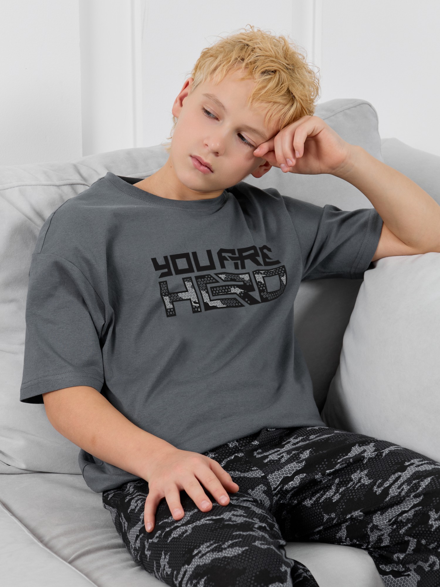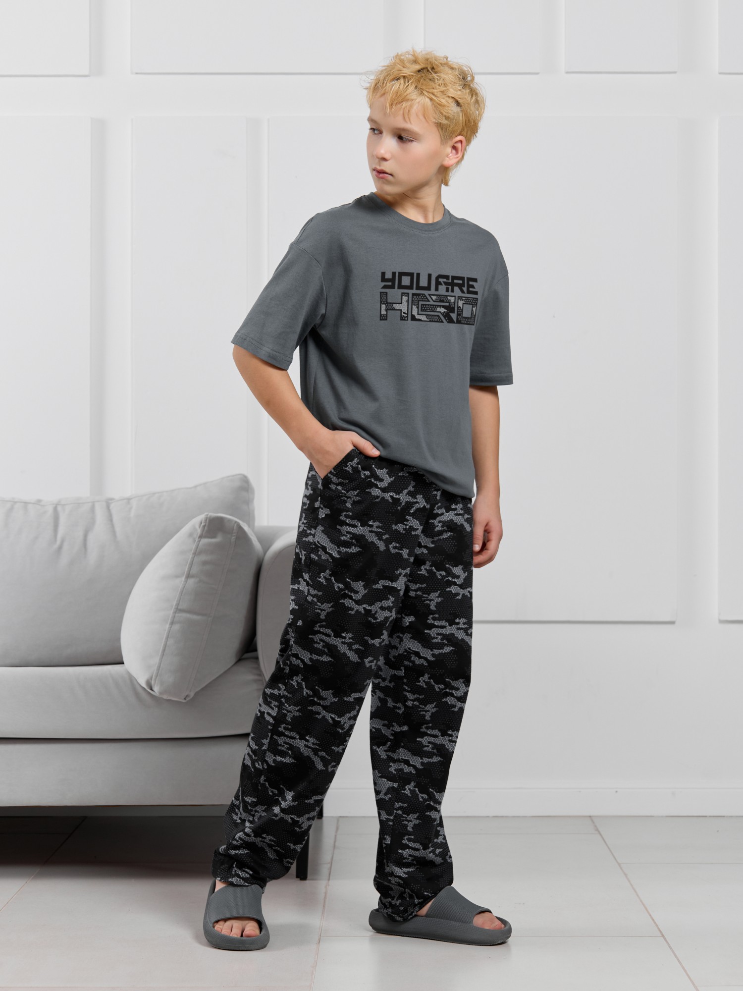 Костюмдля мальчика, состоящий из футболки и брюк. Футболка однотонная с принтом на груди; модель свободная, со спущенной линией плеч, овальным вырезом горловины. Брюки из полотна с набивным рисунком эксклюзивного дизайна, прямые, с боковыми карманами с обтачными входами, на притачном поясе с отстроченной эластичной тесьмой.
