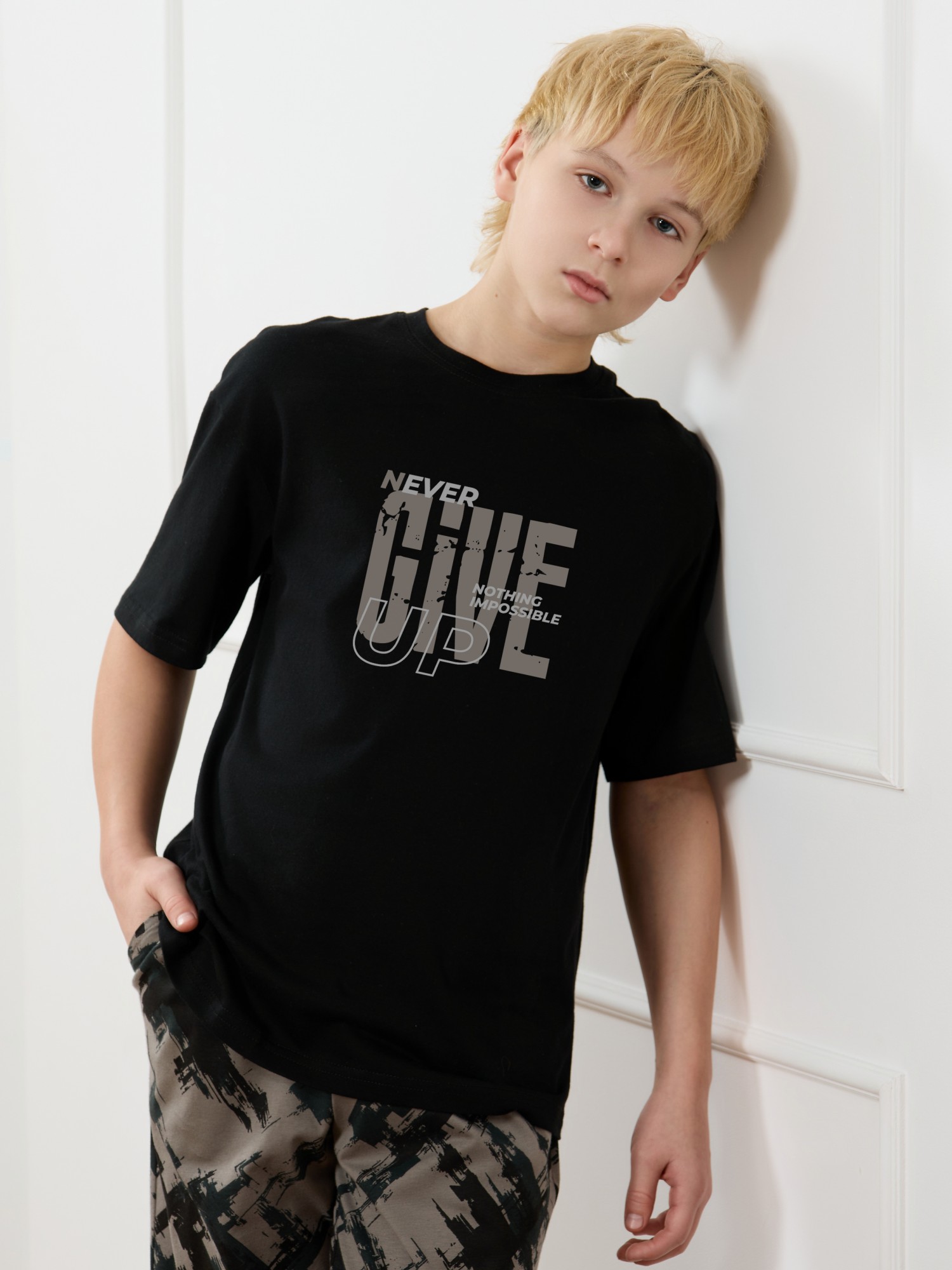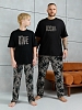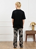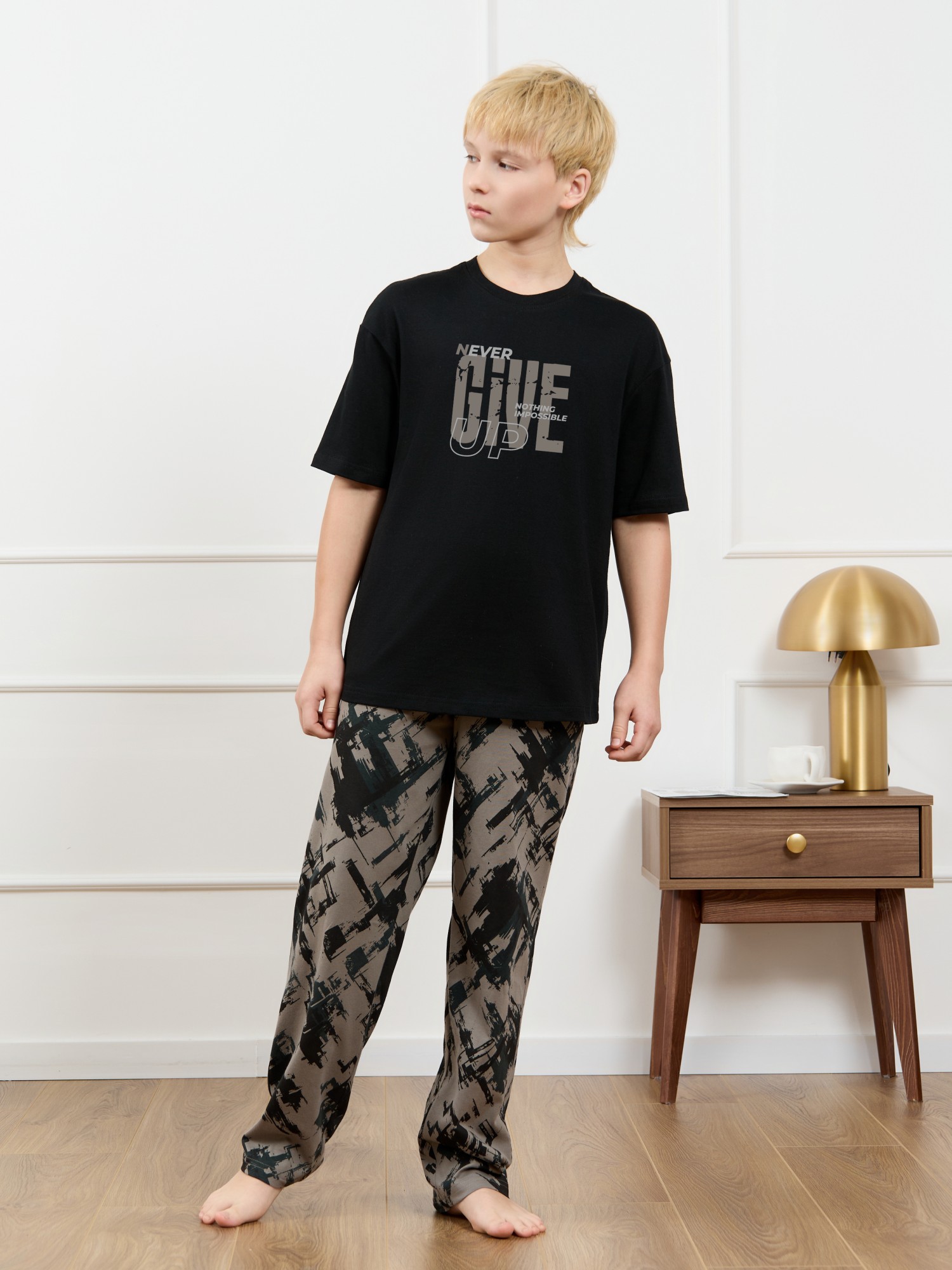 Костюм для мальчика, состоящий из футболки и брюк. Футболка однотонная с принтом на груди; модель свободная, со спущенной линией плеч, овальным вырезом горловины. Брюки из полотна с набивным рисунком эксклюзивного дизайна, прямые, с боковыми карманами с обтачными входами, на притачном поясе с отстроченной эластичной тесьмой.