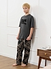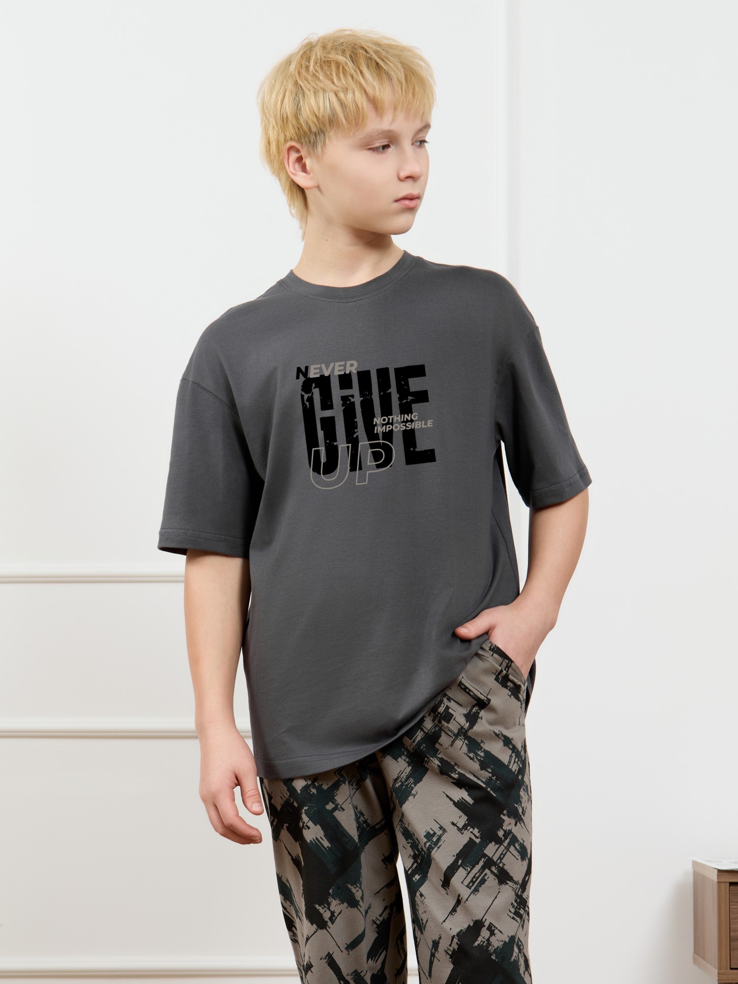 Костюм для мальчика, состоящий из футболки и брюк. Футболка однотонная с принтом на груди; модель свободная, со спущенной линией плеч, овальным вырезом горловины. Брюки из полотна с набивным рисунком эксклюзивного дизайна, прямые, с боковыми карманами с обтачными входами, на притачном поясе с отстроченной эластичной тесьмой.