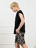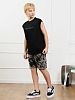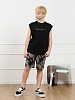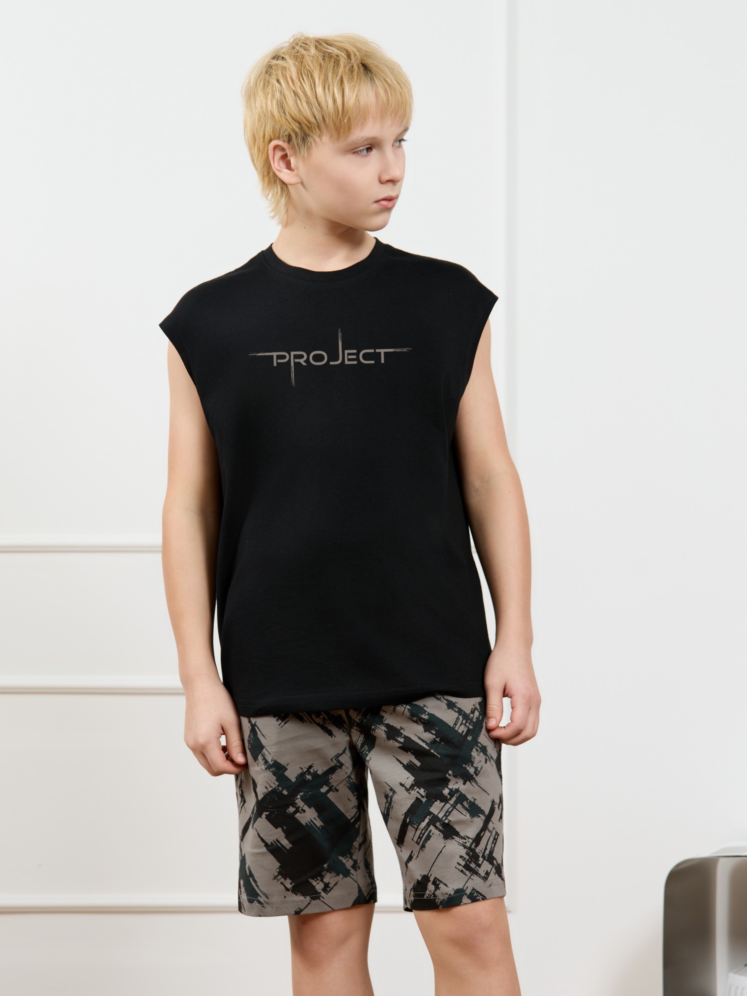 Костюм для мальчика, состоящий из майки и шорт. Майка однотонная с принтом на груди; модель свободная, со спущенной линией плеч и углубленной проймой. Шорты из полотна с набивным рисунком эксклюзивного дизайна, с боковыми карманами с обтачными входами, на притачном поясе с отстроченной эластичной тесьмой.