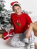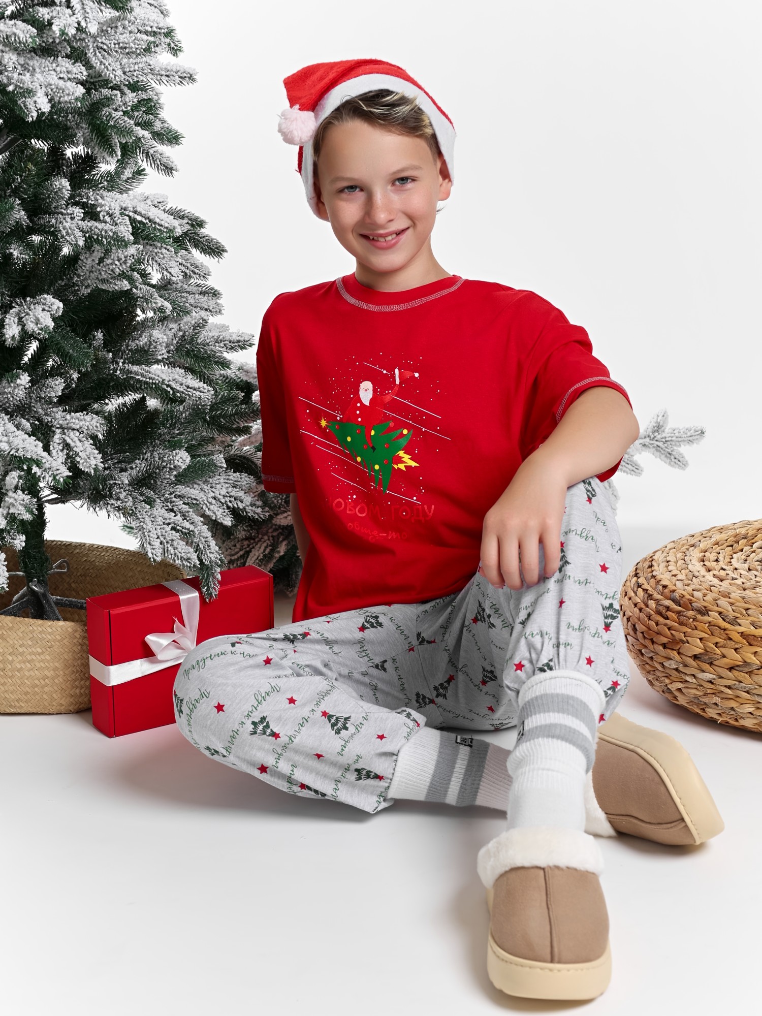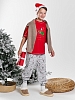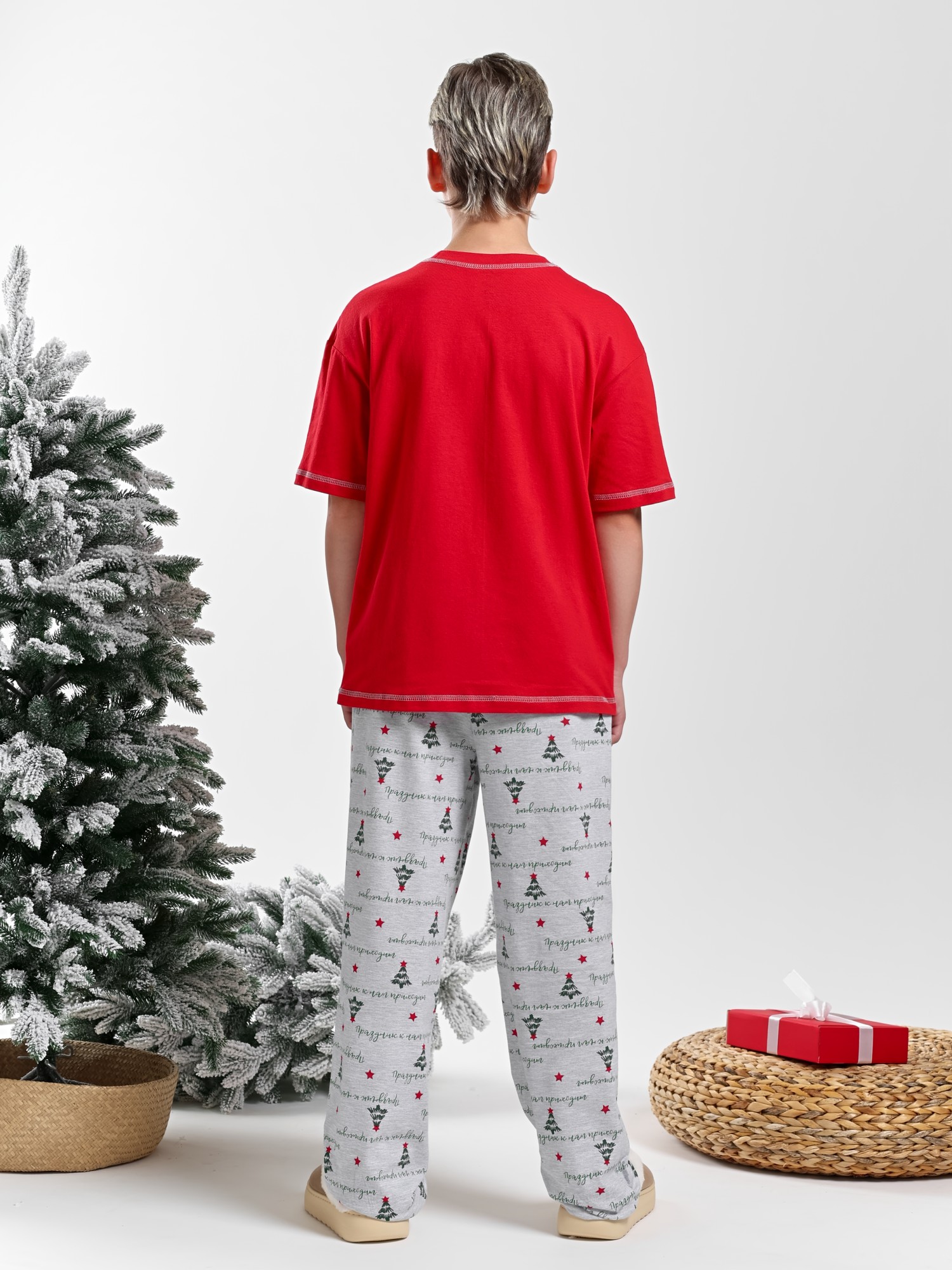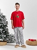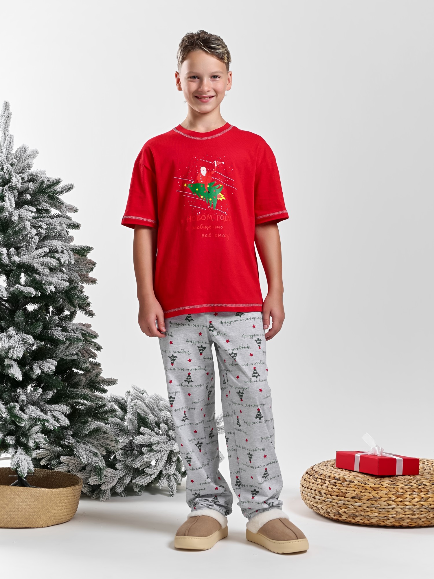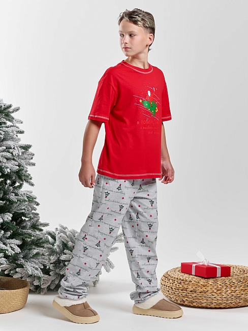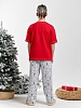 Костюм для мальчика из трикотажного полотна "кулирка" в комбинации двух видов: гладкокрашенного красного цвета и с набивным тематическим рисунком на сером фоне , состоящий из футболки и брюк. Футболка - классического силуэта, свободного покроя, с приспущенным плечом, с втачными рукавами длиной до локтя, горловиной овальной формы, обработанной втачной планкой и принтом в центре переда. По шву втачивани я планки настрочена декоративная (5-ниточная) отделочная строчка нитками контрастного цвета Подгибка низа рукавов и изделия так же выполнена с применением декоративной отделочной строчки. Брюки выполнены из полотна с набивным темкатическим рисунком, длинные, умеренной ширины, прямые, с эластичной тесьмой по талии.