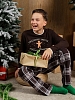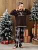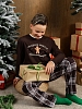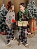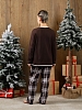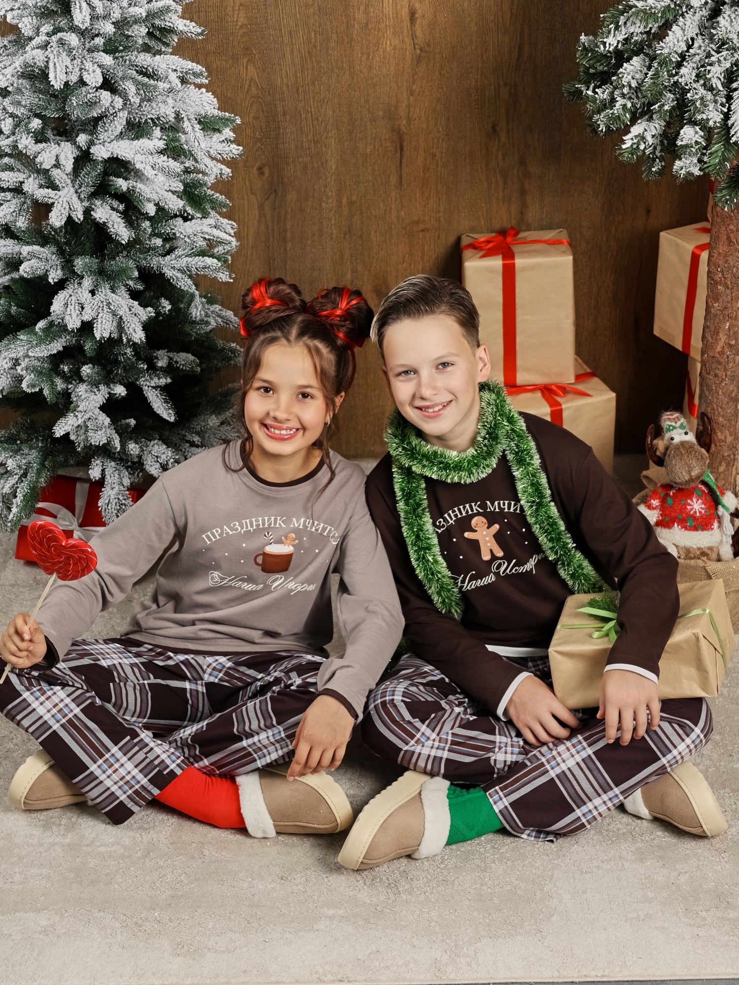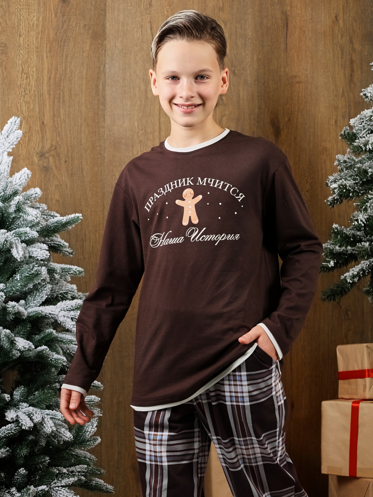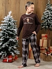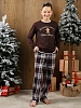 Костюм для мальчика из трикотажного полотна "кулирка" в комбинации двух видов: гладкокрашенного и с рисунком в крупную клетку, сочетающихся между собой по цвету, состоящий из джемпера и брюк. Джемпер - из гладкокрашеного полотна, свободного покроя, с длинными втачными рукавами и приспущенными плечами, с горловиной овальной формы и тематическим принтом, выполненным в технике шелкографии. Горловина, нижние срезы рукавов и низ изделия обработаны подгибкой с отделочным широким кантом контрастного цвета. Брюки - из полотна в клетку, свободного покроя, прямые, на притачном поясе с эластичной тесьмой внутри, с карманами в боковых швах. Нижние срезы обработаны подгибкой.