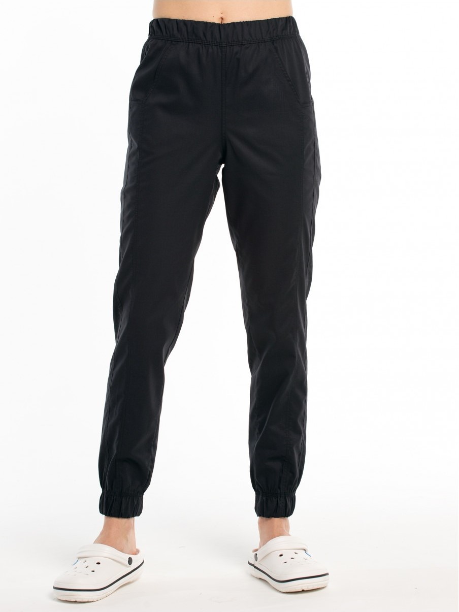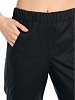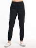Брюки классического покроя с притачным поясом на резинке и резинками по низу. На передних половинках выполнены вертикальные подрезы и боковые карманы с фигурным входом. На правой задней половинке расположен карман с притачным лейблом.