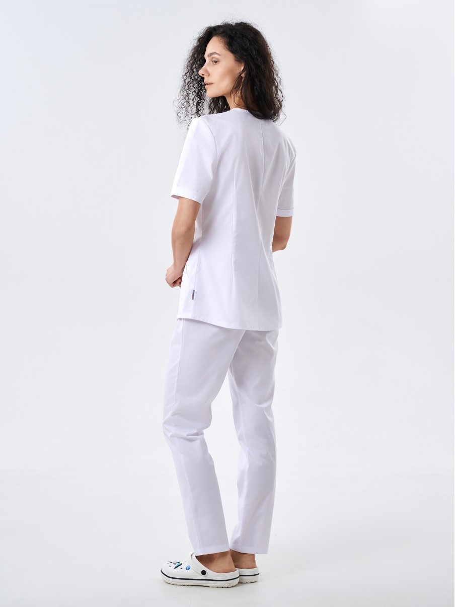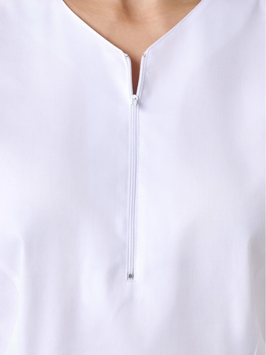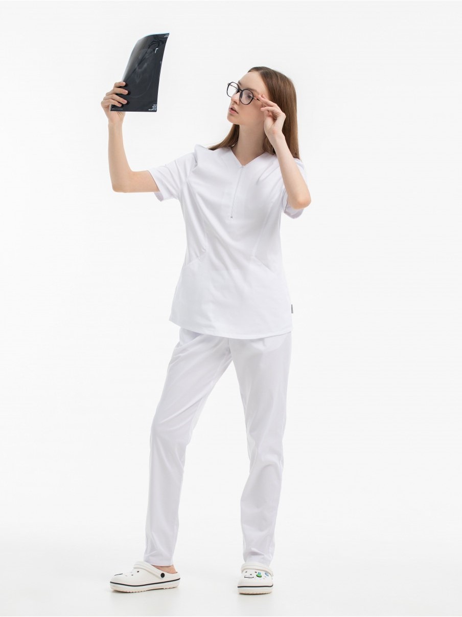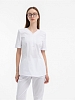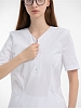 Блуза полуприлегающего силуэта с застежкой на тесьму - молнию. Вырез горловины овальной формы. На полочке расположены фигурные рельефы с проймы, в них обработаны боковые карманы. Спинка со средним швом и талевыми вытачками. Рукава короткие с отворотом.