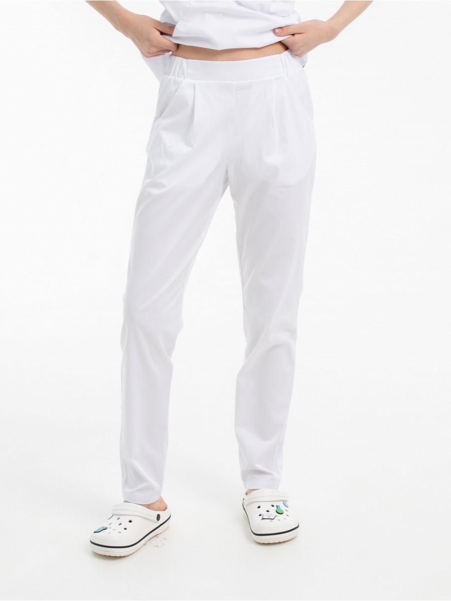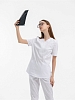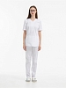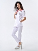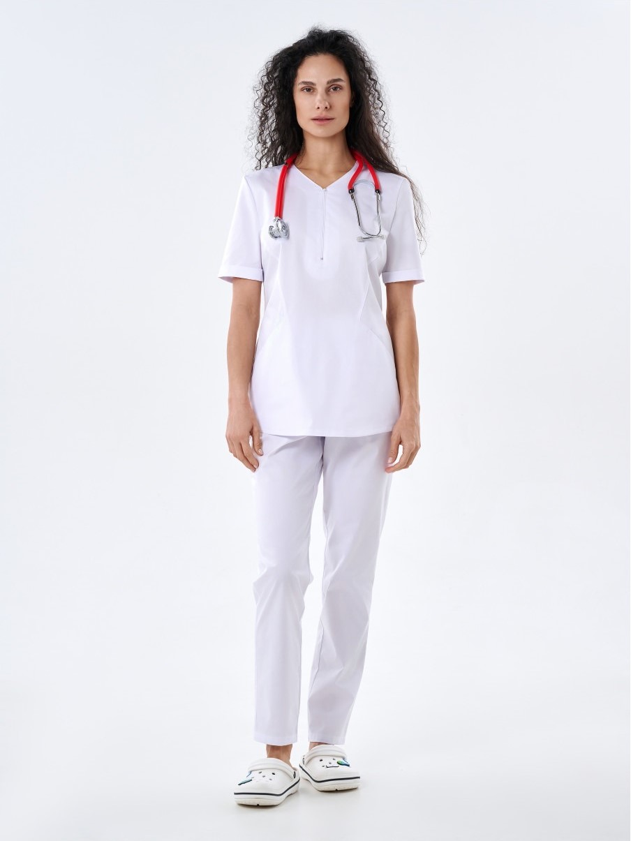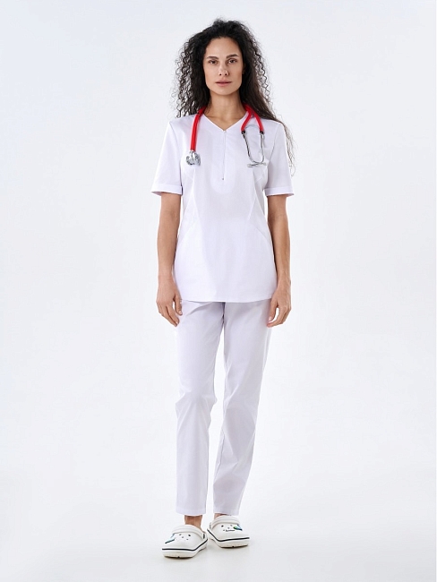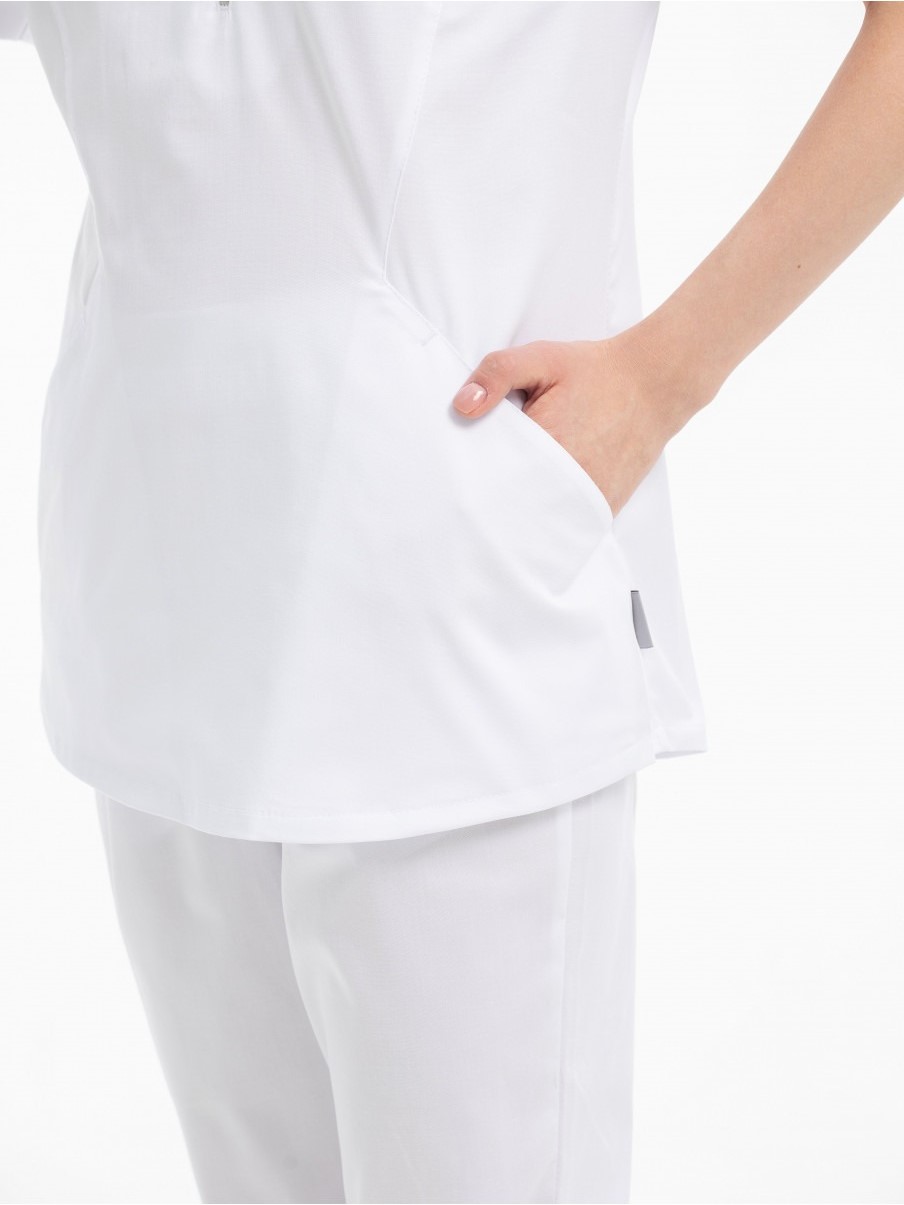Блуза полуприлегающего силуэта с застежкой на тесьму - молнию. Вырез горловины овальной формы. На полочке расположены фигурные рельефы с проймы, в них обработаны боковые карманы. Спинка со средним швом и талевыми вытачками. Рукава короткие с отворотом.