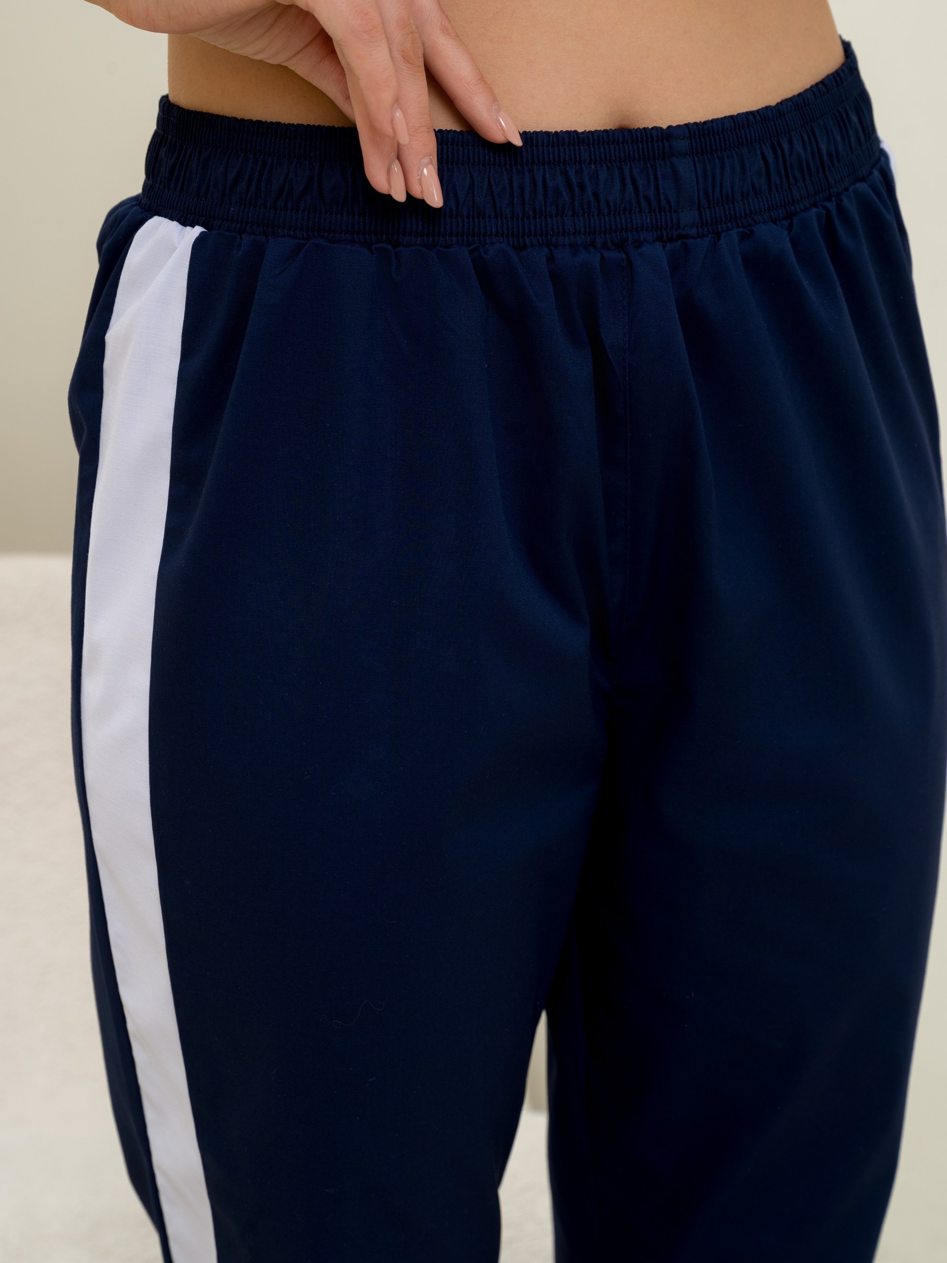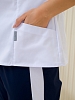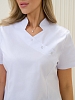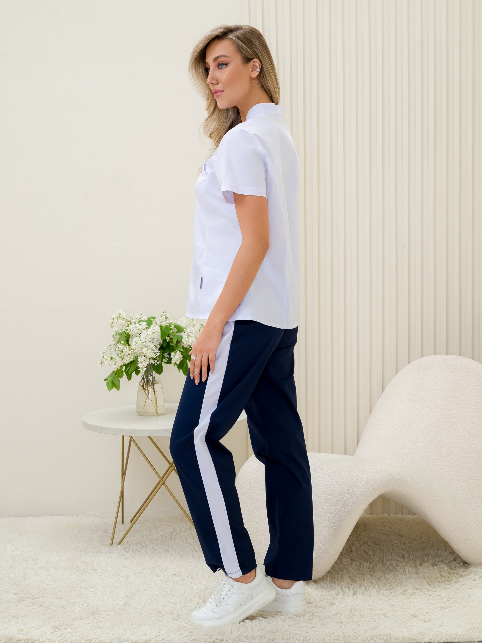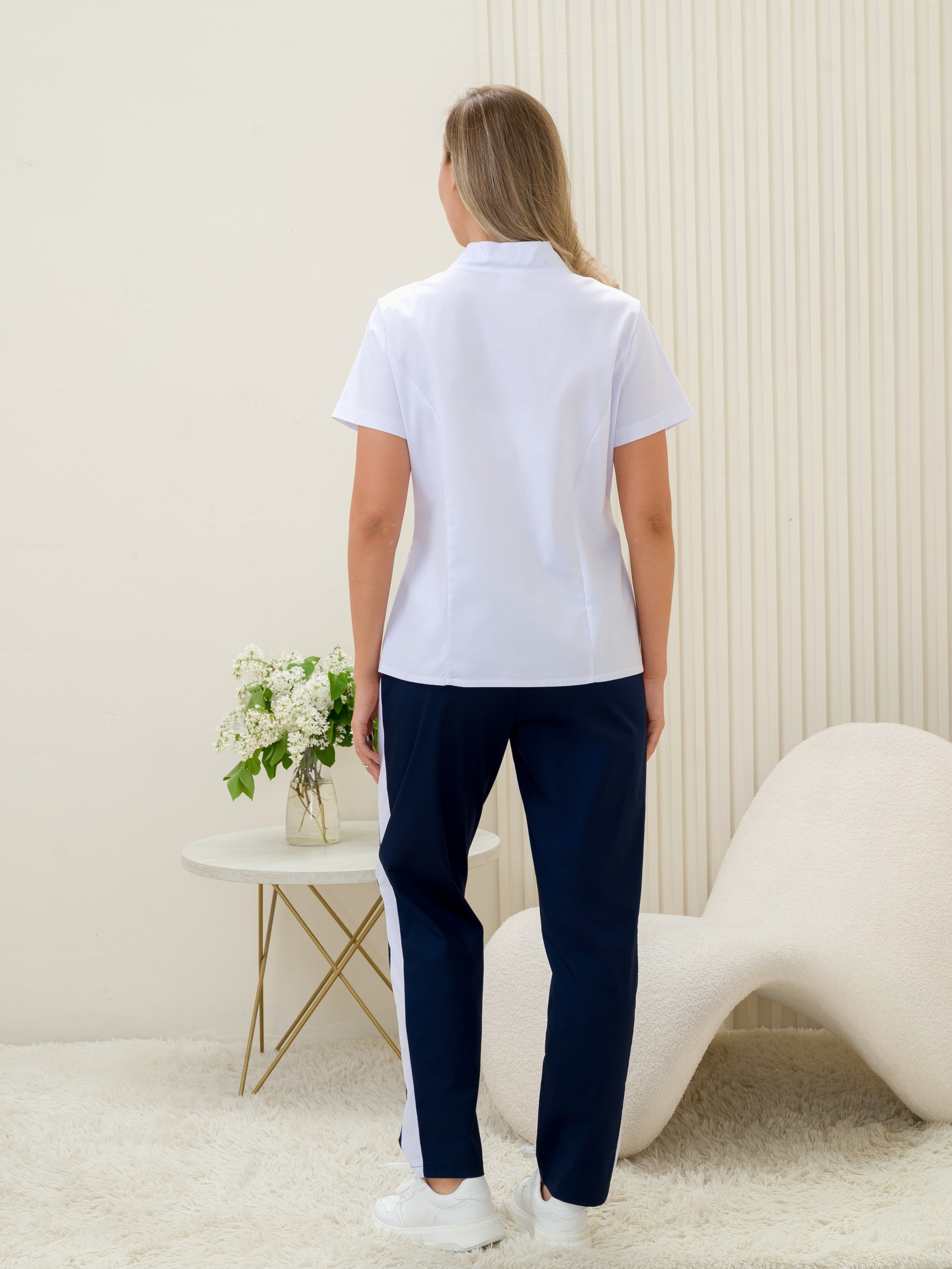Костюм медицинский женский прилегающего силуэта, застежка кнопки, воротник стойка, рукав короткий, два втачных кармана, брюки классические с широкой резинкой по бокам лампасы.