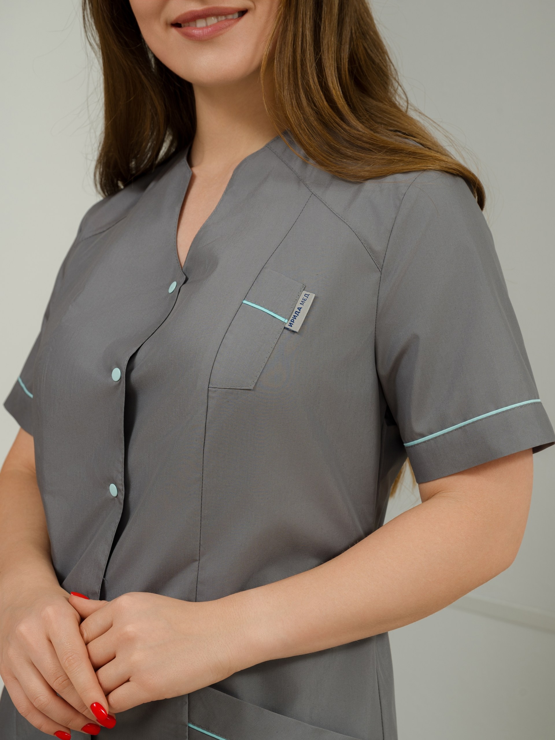 Костюм медицинский женский. Ткань тиси, состав 35% хлопок 65%п/э. Рукав короткий с отделочным кантом на манжете контрастного цвета, отделка такого же цвета присутствует и на карманах. Вырез V образный, фигурный, кнопки в тон отделки. Сзади из бокового шва идет пояс фиксируемый кнопкой. Брюки на резинки зауженные к низу со стрелками.