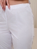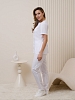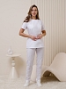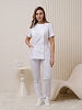 Костюм медицинский женский полуприталенного силуэта, без воротника, застежка кнопки, 3 накладных кармана, рукав короткий. Из боковых швов имеется завязывающийся пояс. Брюки классические, со стрелками.