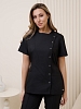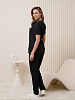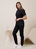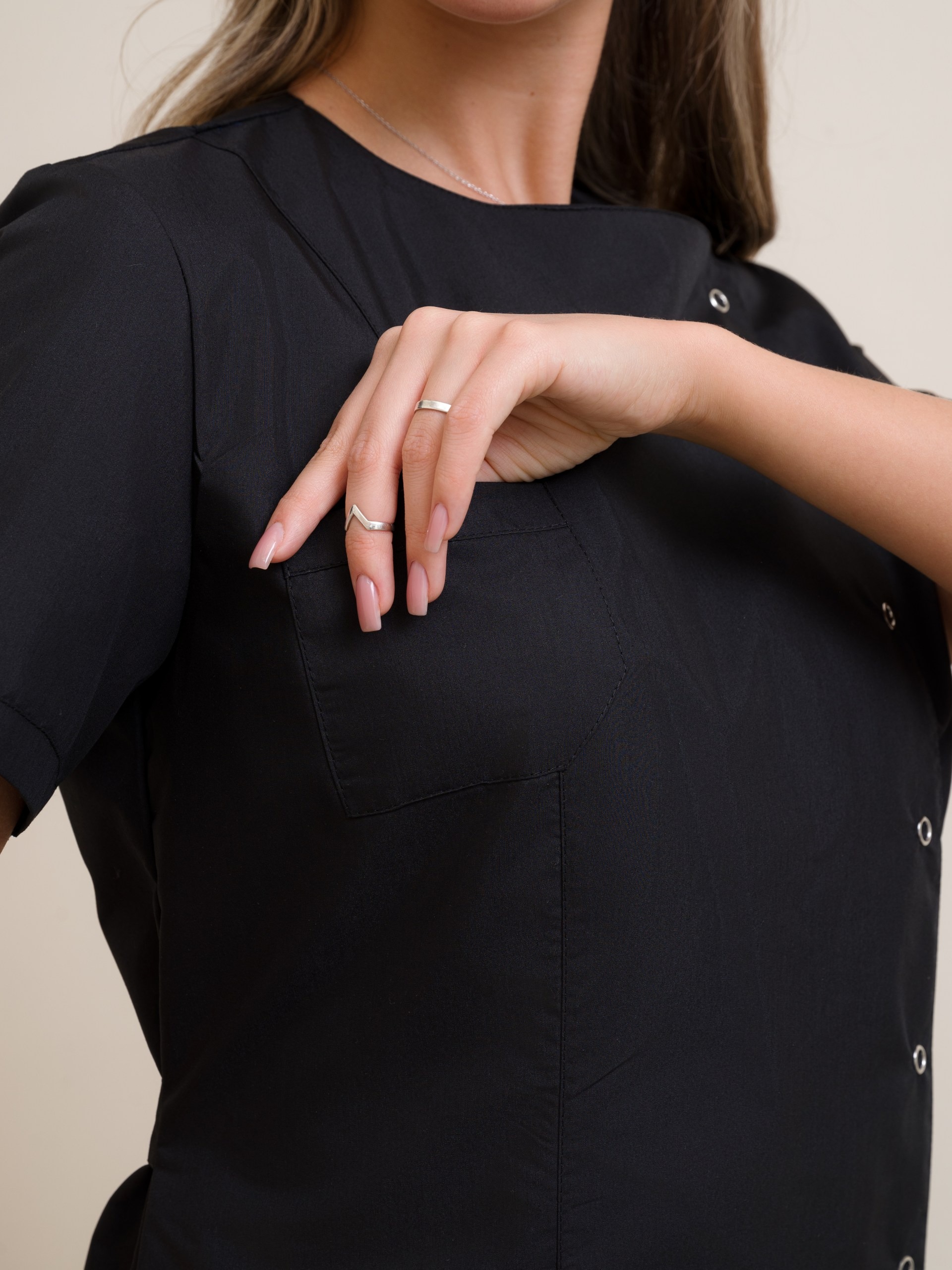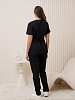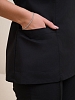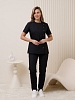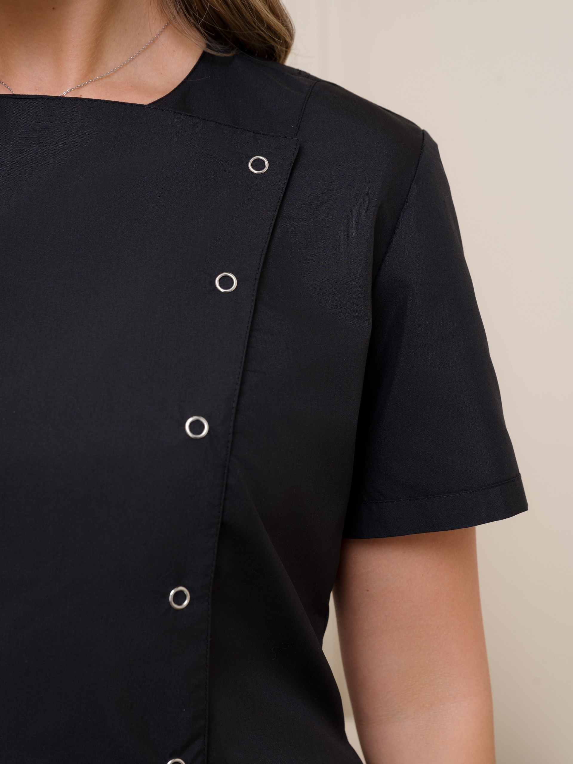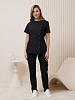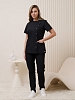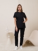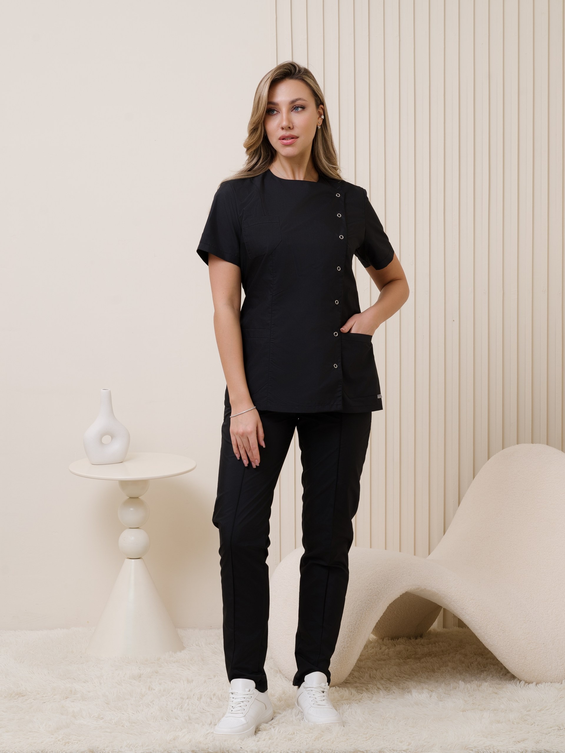 Костюм медицинский женский полуприталенного силуэта, без воротника, застежка кнопки, 3 накладных кармана, рукав короткий. Из боковых швов имеется завязывающийся пояс. Брюки классические, со стрелками.