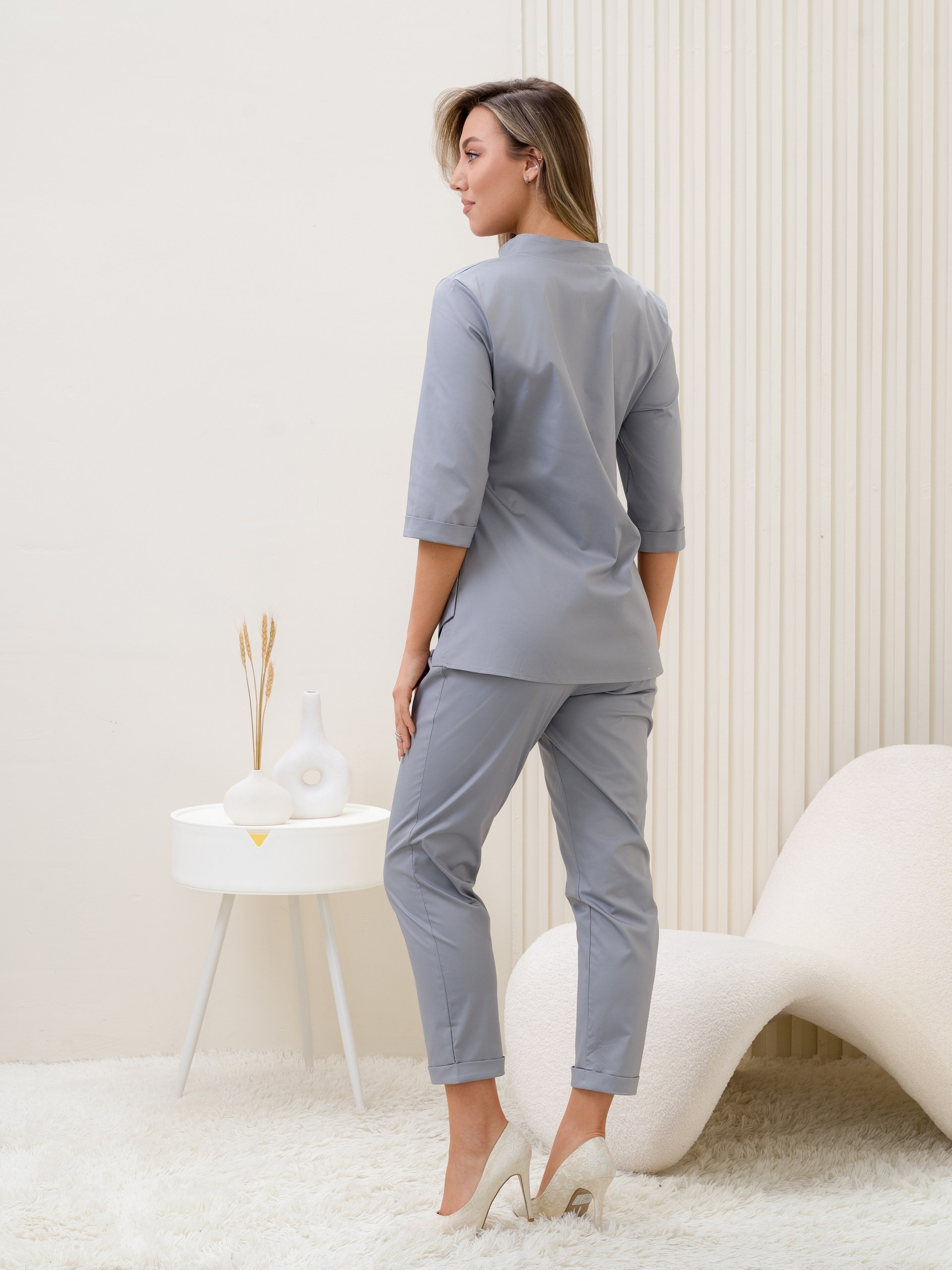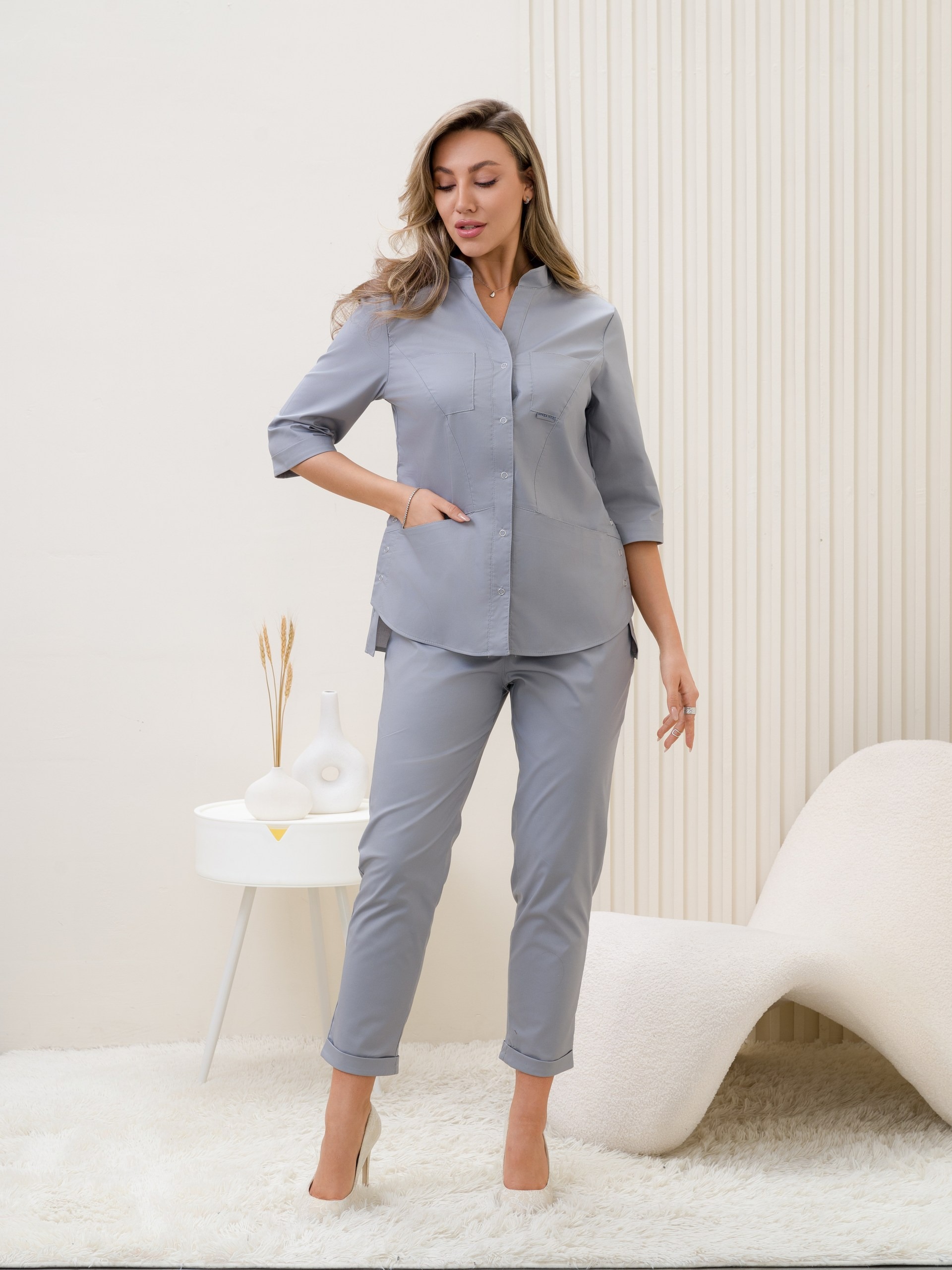 Костюм предоставлен широким размерным рядом: 42 - 64. Стильный женский костюм, чье высокое качество и удобная посадка гарантированы со стороны производителя. В основе изделия - 35% хл, 62% п/э, 3% спандекс. Спецодежда свободного кроя, обеспечит легкость и непринужденность в движениях. Униформа состоит из блузы и брюк. Верх с рукавом 3/4 и стильным воротником. Имеет боковые и нагрудные, накладные карманы, которые непременно пригодятся в процессе работы. Застегивается на кнопки. Зауженные брюки 7/8, на удобной резинке в зоне талии. Спецодежда выглядит очень выдержано и эстетично, создаст элегантный и женственный образ. Грамотное сочетание цветовой гаммы с интересным дизайном сделает ваш рабочий образ по-настоящему достойным и стильным. Изделие подойдет для разных возрастов и с разным типом фигуры.