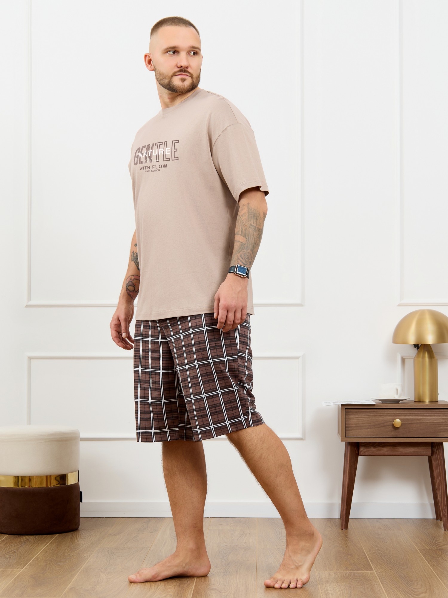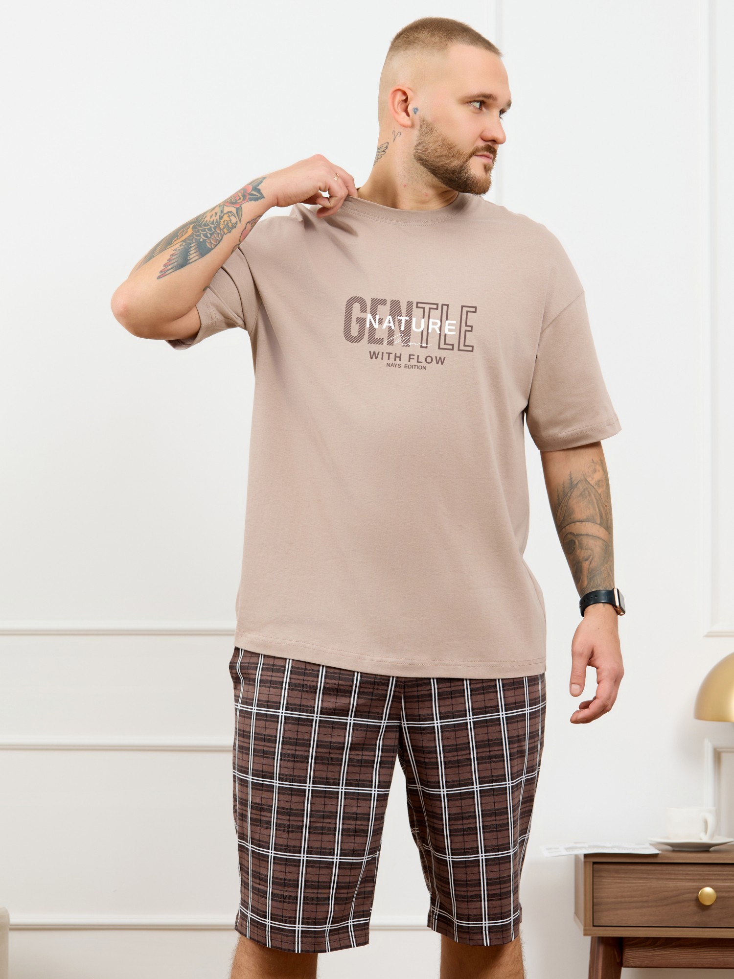 Костю мужской из трикотажного полотна "кулирка", состоящий из футболки и шорт. Футболка классического покроя, с короткими втачными рукавами и приспущенной линией плеч, горловиной овальной формы, обработанной втачной планкой и принтом на детали переда, выполненным в технике шелкографии. Нижние срезы рукавов и изделия обработаны подгибкой. По горловине настрочена отделочная строчка. Шорты длиной до колен, на притачном поясе с эластичной тесьмой внутри, с карманами в боковых швах. Нижние срезы обработаны подгибкой.