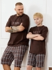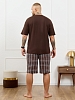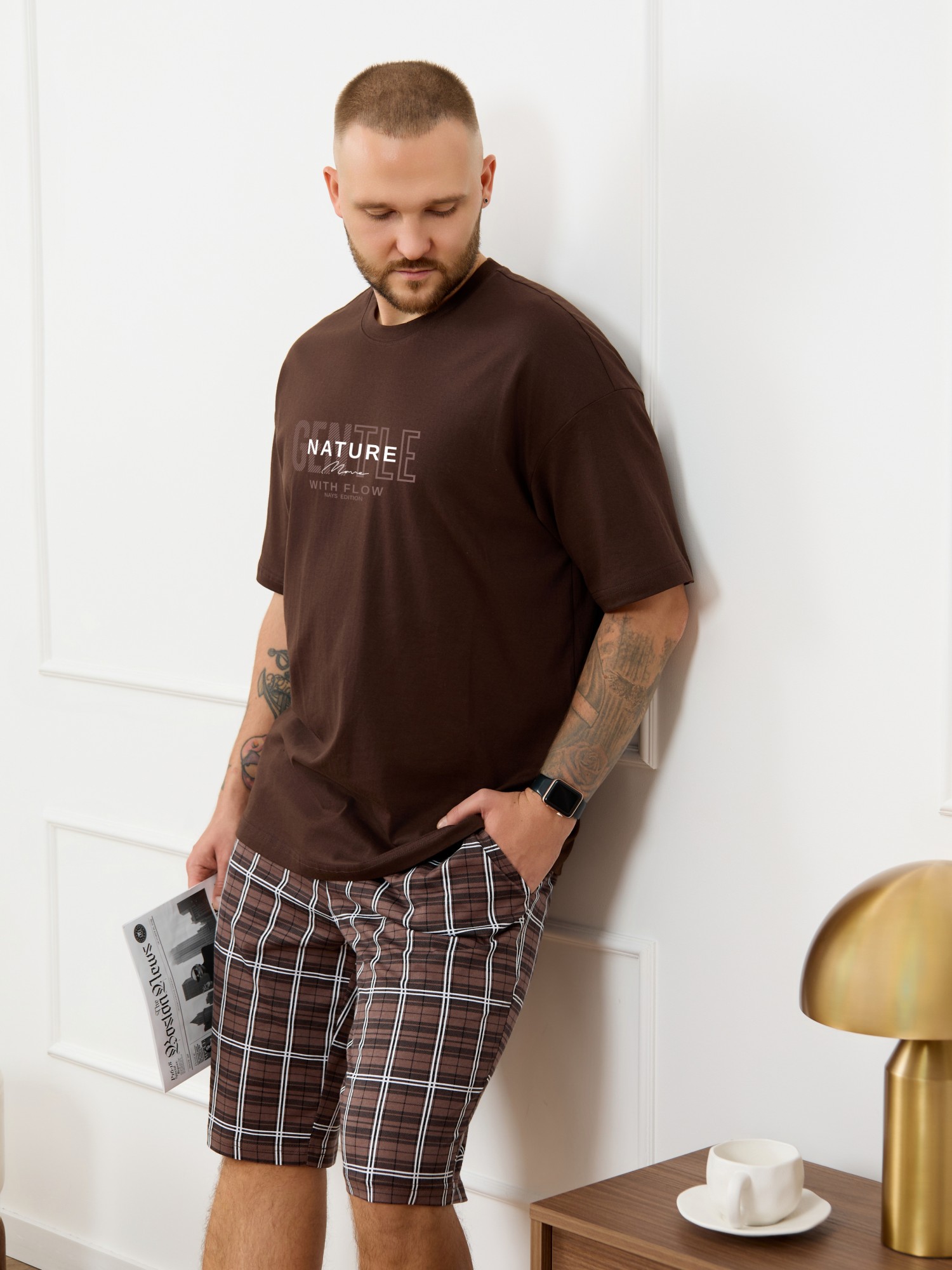 Костю мужской из трикотажного полотна "кулирка", состоящий из футболки и шорт. Футболка классического покроя, с короткими втачными рукавами и приспущенной линией плеч, горловиной овальной формы, обработанной втачной планкой и принтом на детали переда, выполненным в технике шелкографии. Нижние срезы рукавов и изделия обработаны подгибкой. По горловине настрочена отделочная строчка. Шорты длиной до колен, на притачном поясе с эластичной тесьмой внутри, с карманами в боковых швах. Нижние срезы обработаны подгибкой.