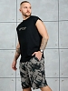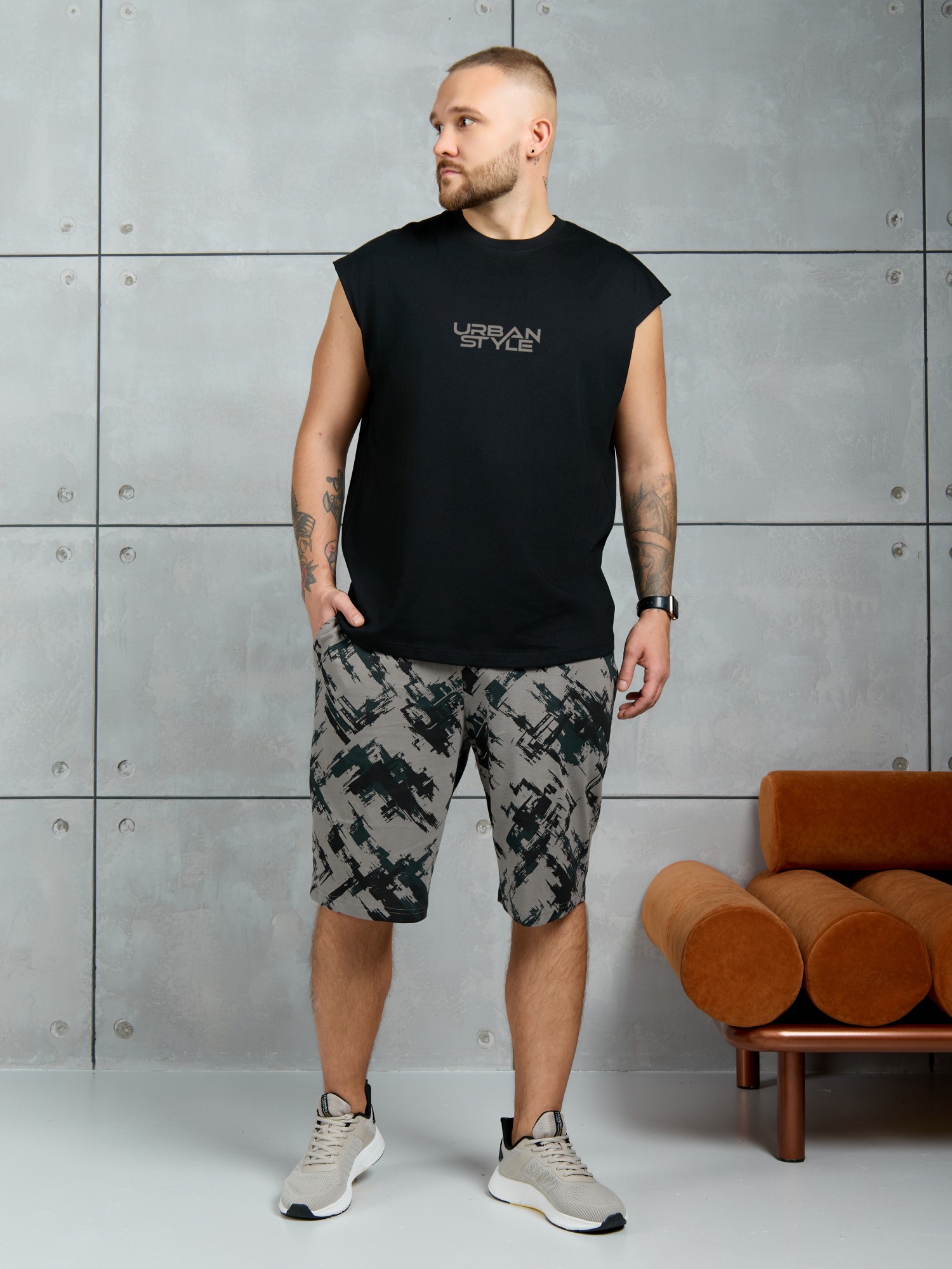 Костюм мужской, состоящий из майки и шорт. Майка однотонная с принтом на груди; модель свободная, со спущенной линией плеч и углубленной проймой. Шорты из полотна с набивным рисунком эксклюзивного дизайна, с боковыми карманами с обтачными входами, на притачном поясе с отстроченной эластичной тесьмой.