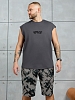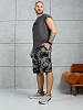 Костюм мужской, состоящий из майки и шорт. Майка однотонная с принтом на груди; модель свободная, со спущенной линией плеч и углубленной проймой. Шорты из полотна с набивным рисунком эксклюзивного дизайна, с боковыми карманами с обтачными входами, на притачном поясе с отстроченной эластичной тесьмой.