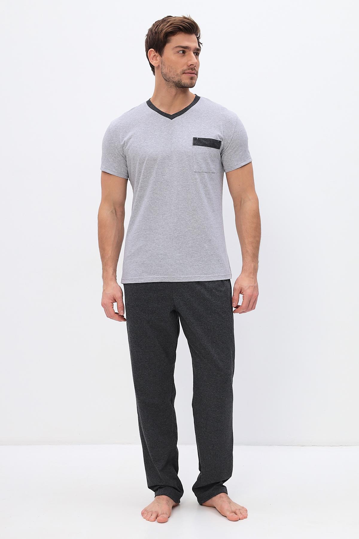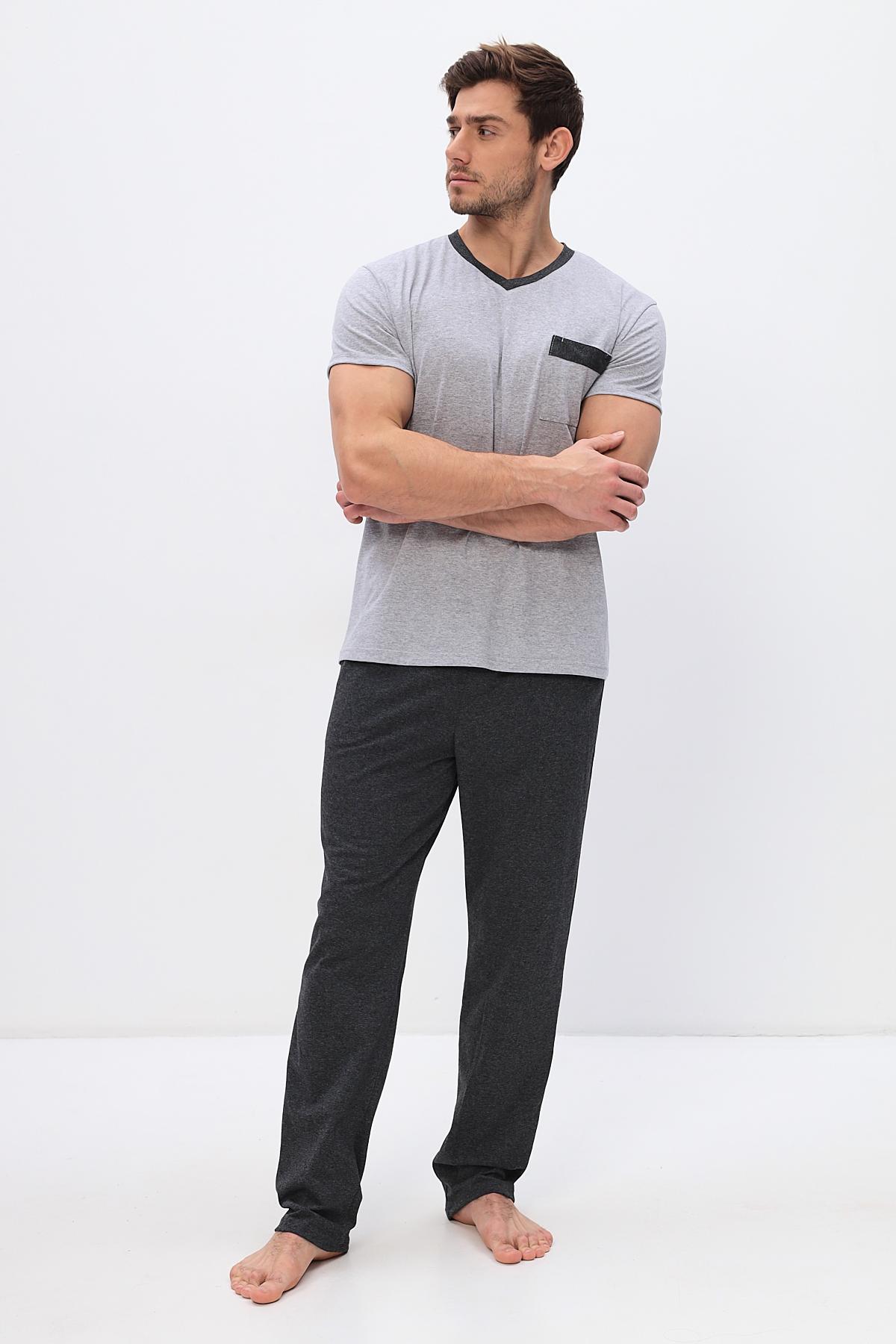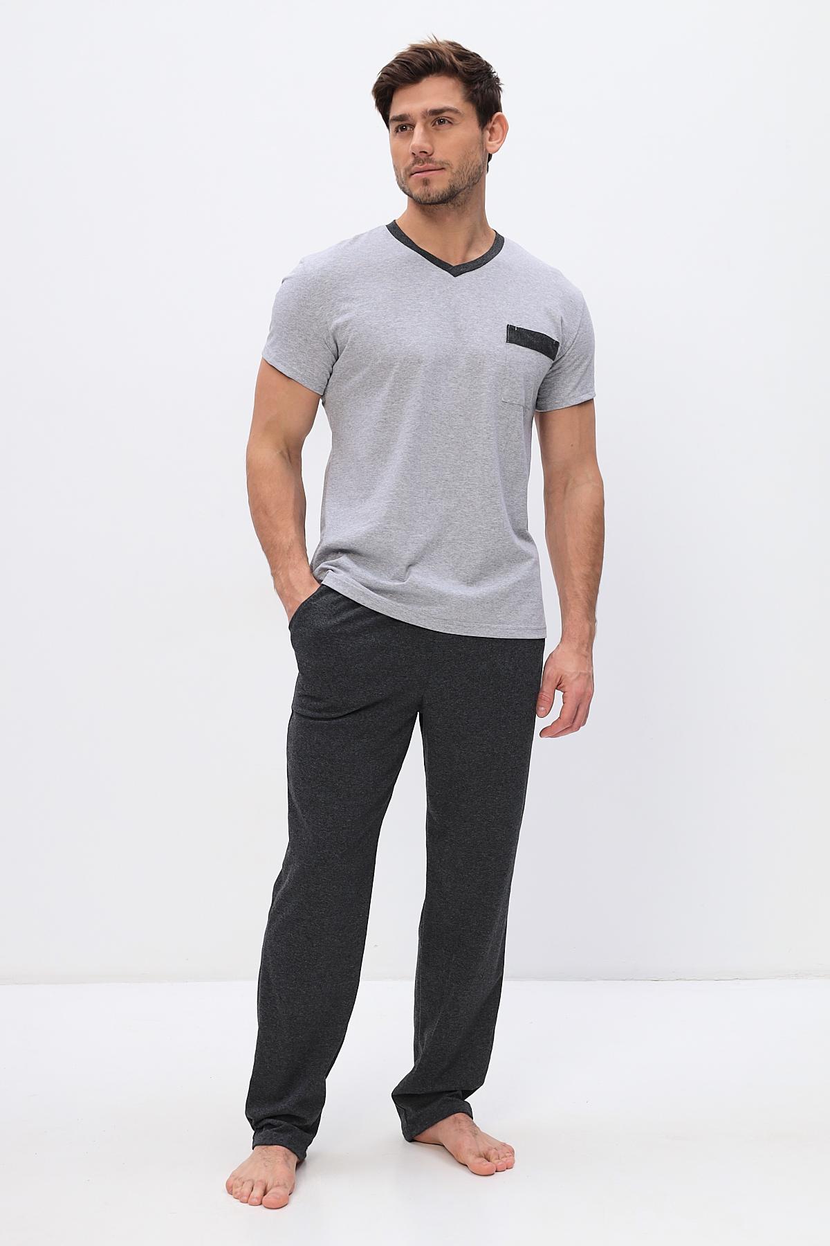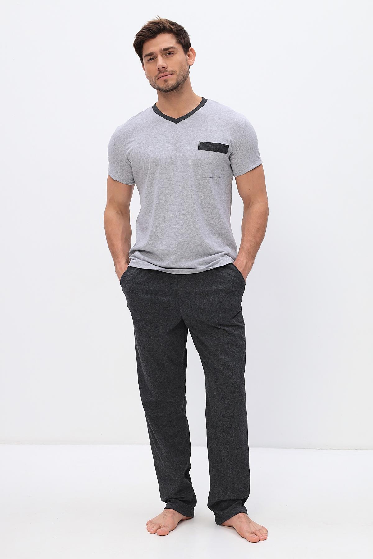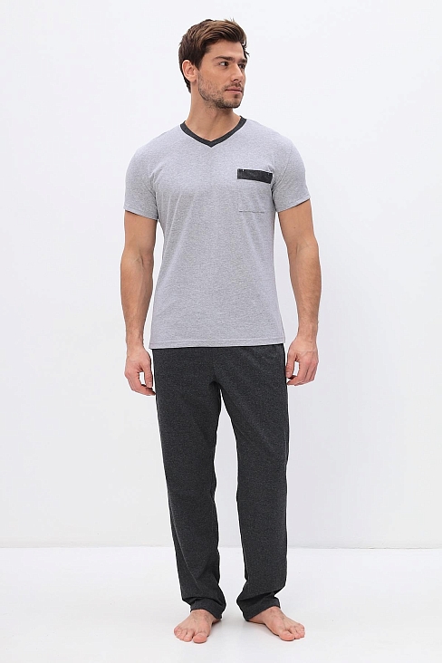 Удобный домашний костюм для мужчин. Состоит из футболки и брюк свободного кроя. В нем отлично отдыхать и спать. Комплект красиво сочетается и аккуратно выглядит. Воротник мысиком и кармашек в тон брюк гармонично дополняют модель комплекта.