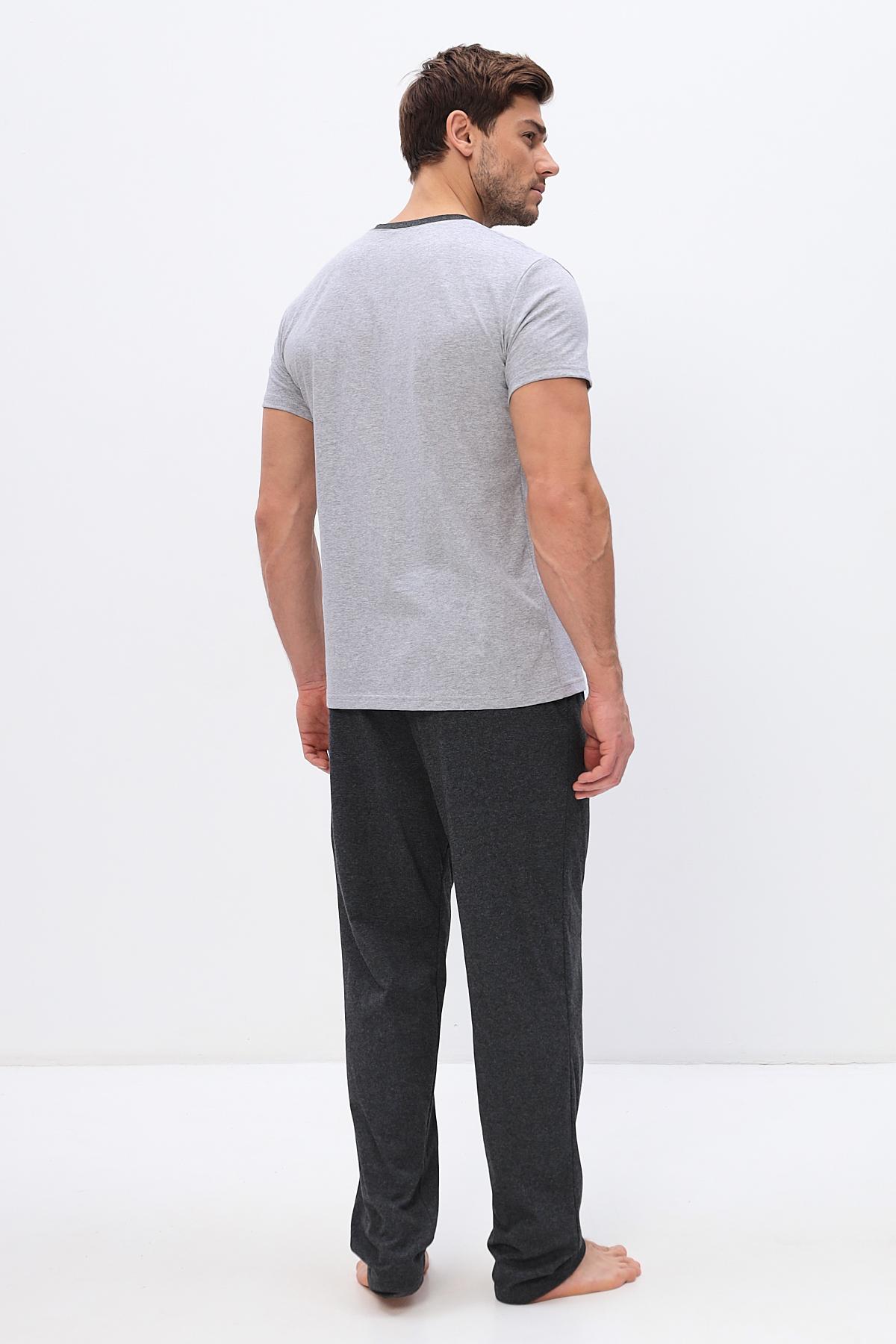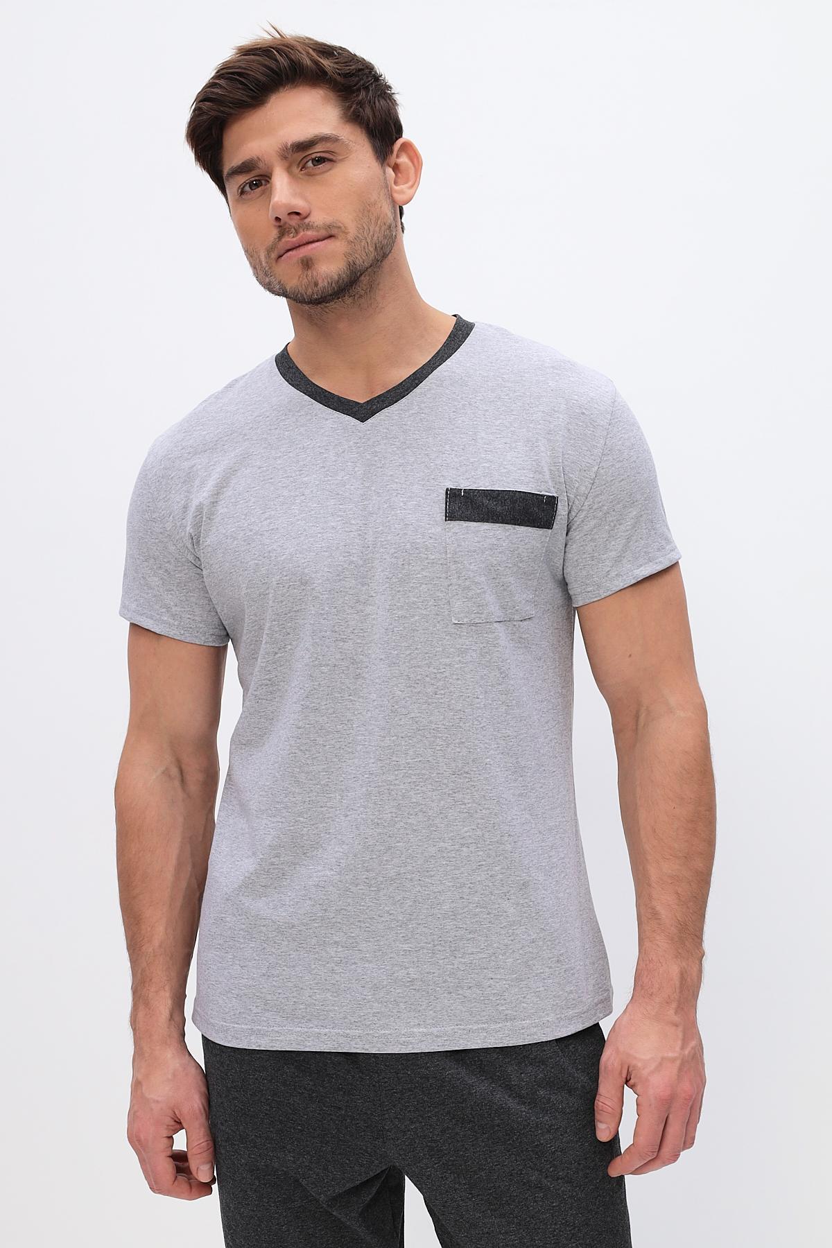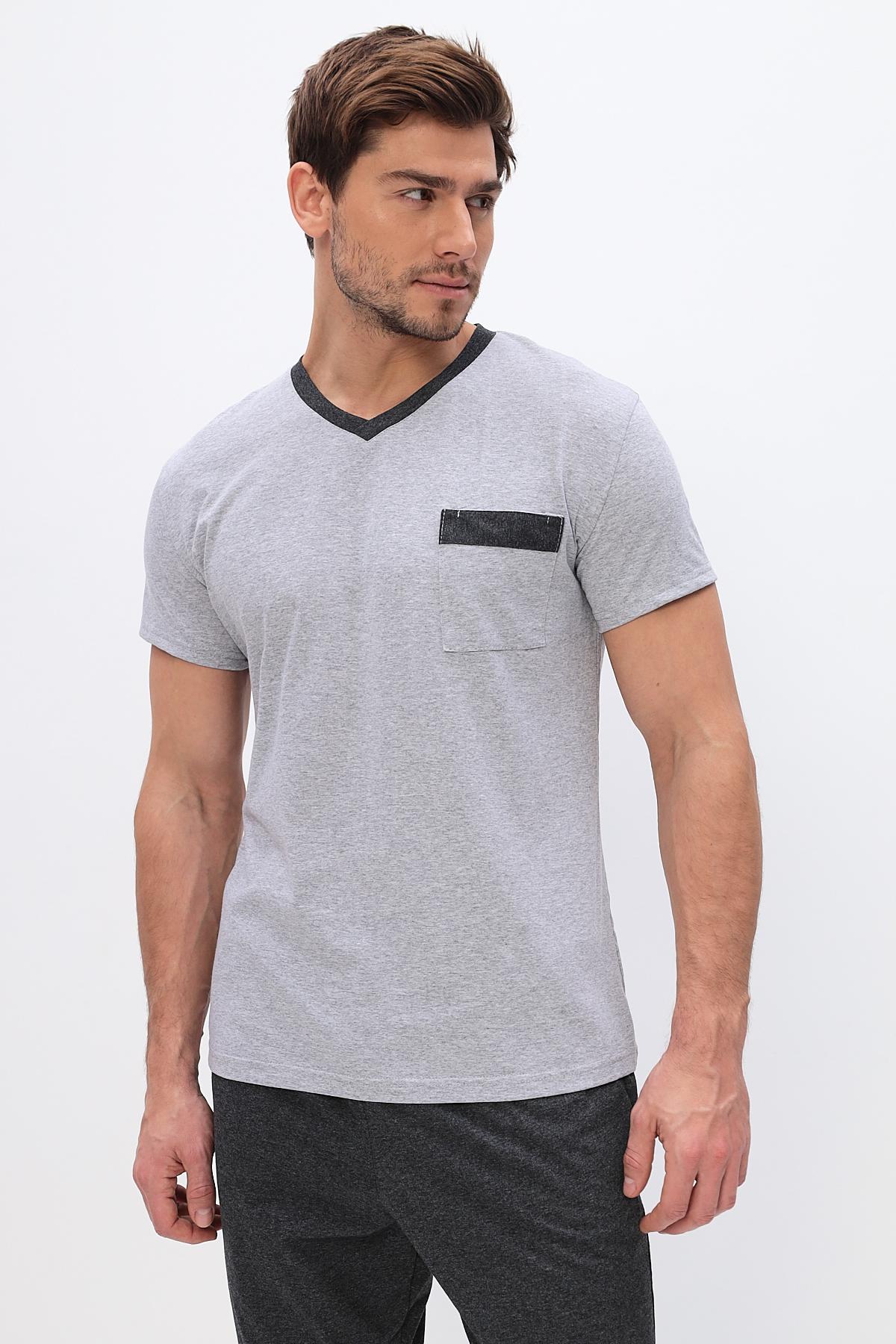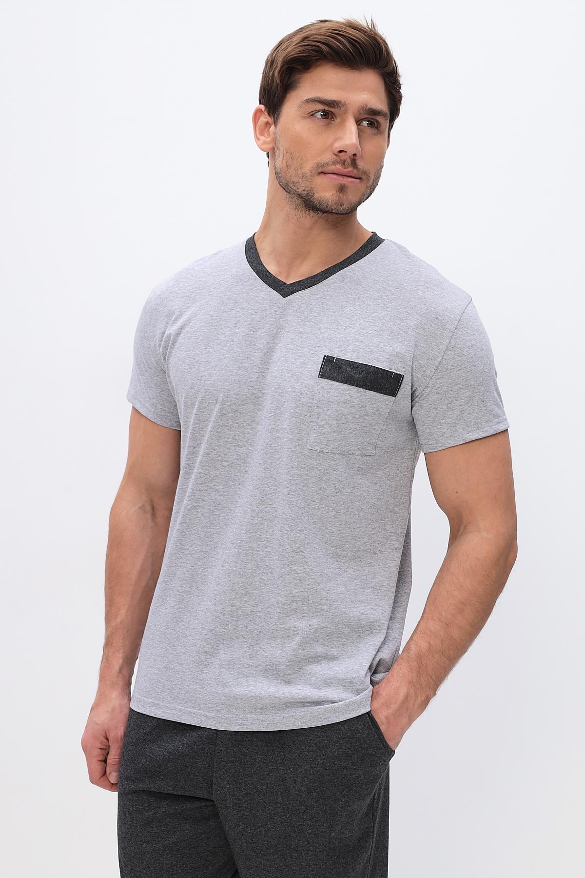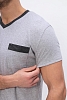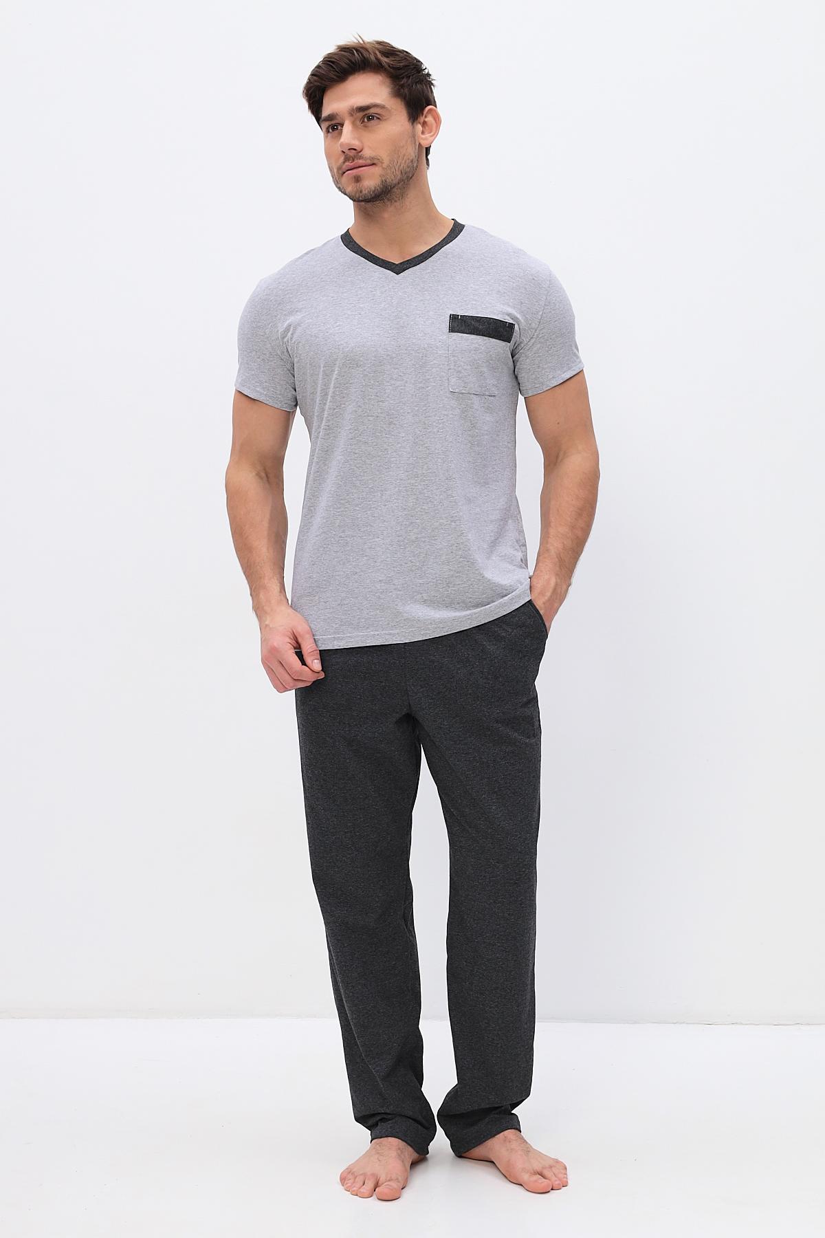 Удобный домашний костюм для мужчин. Состоит из футболки и брюк свободного кроя. В нем отлично отдыхать и спать. Комплект красиво сочетается и аккуратно выглядит. Воротник мысиком и кармашек в тон брюк гармонично дополняют модель комплекта.