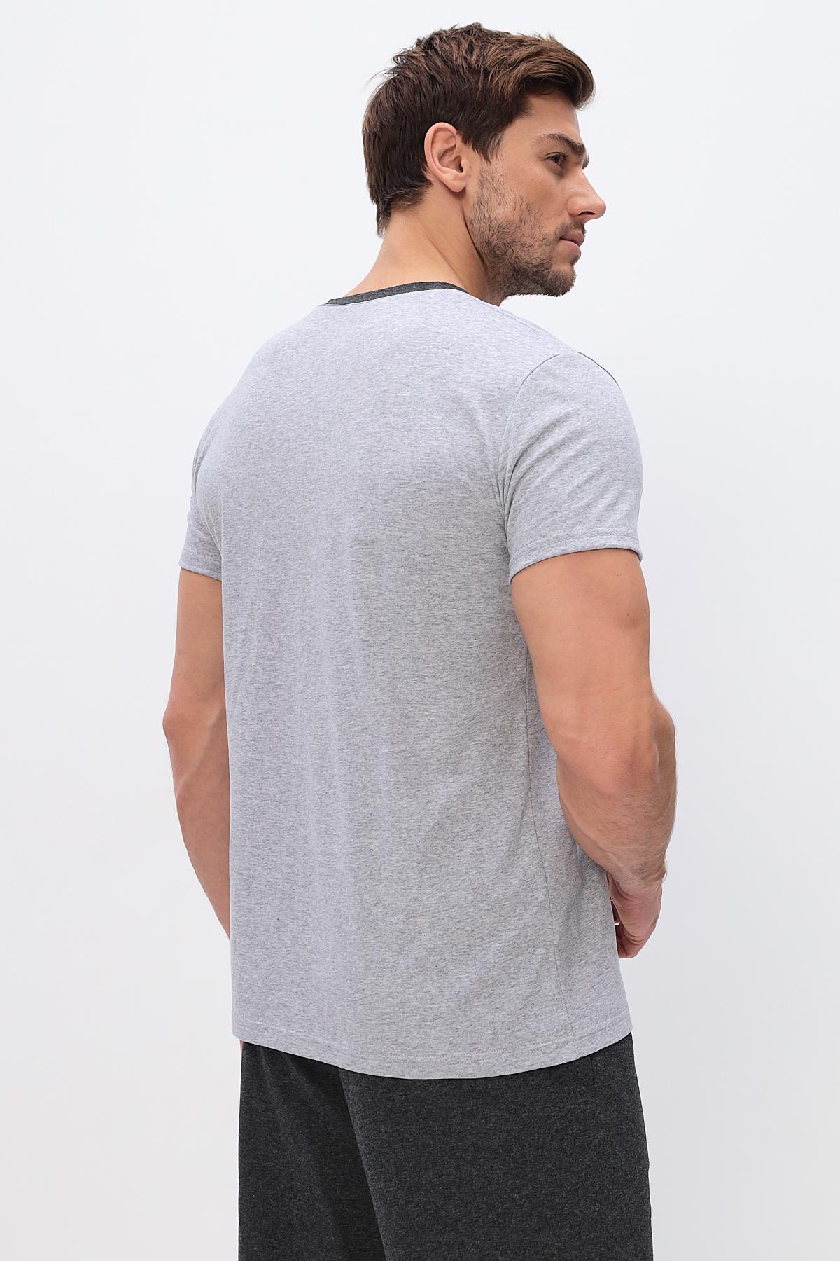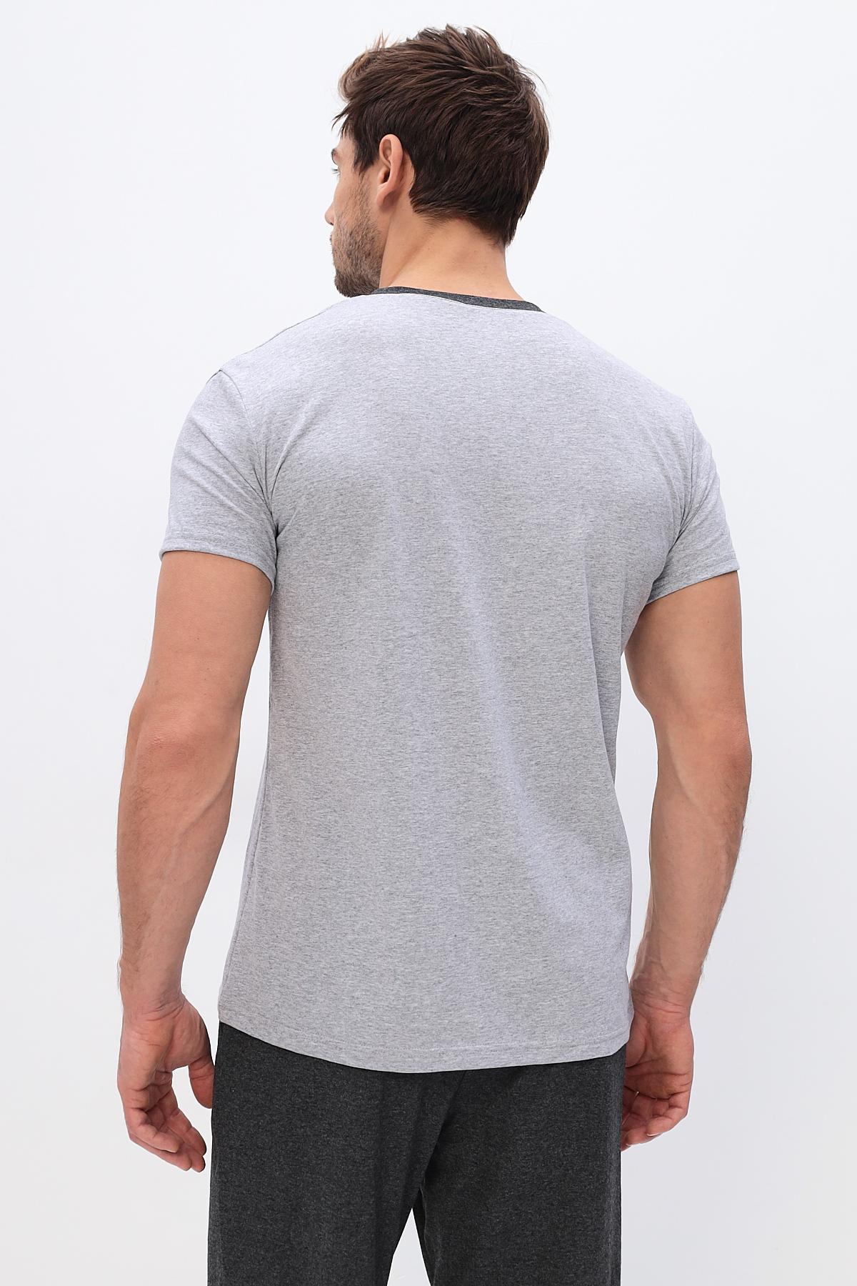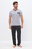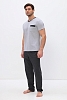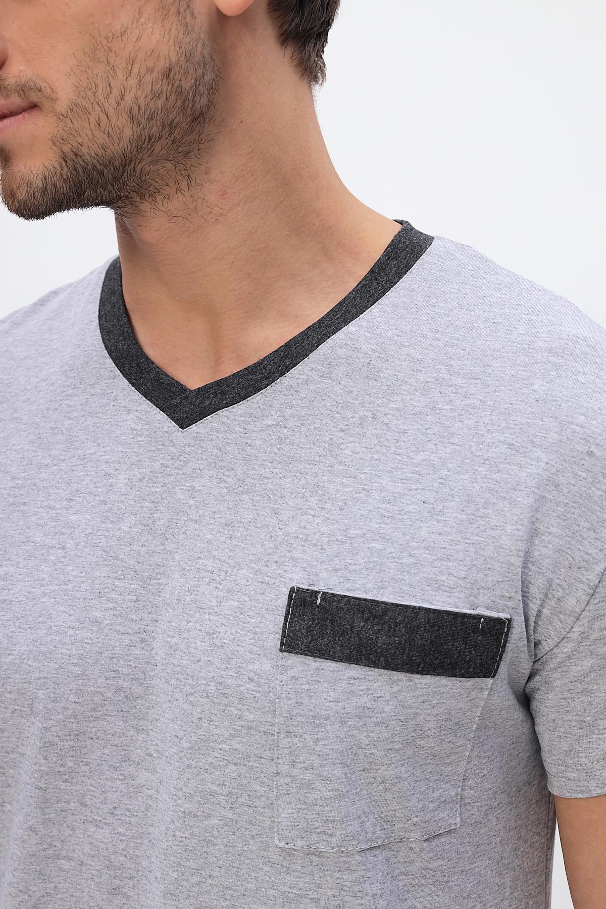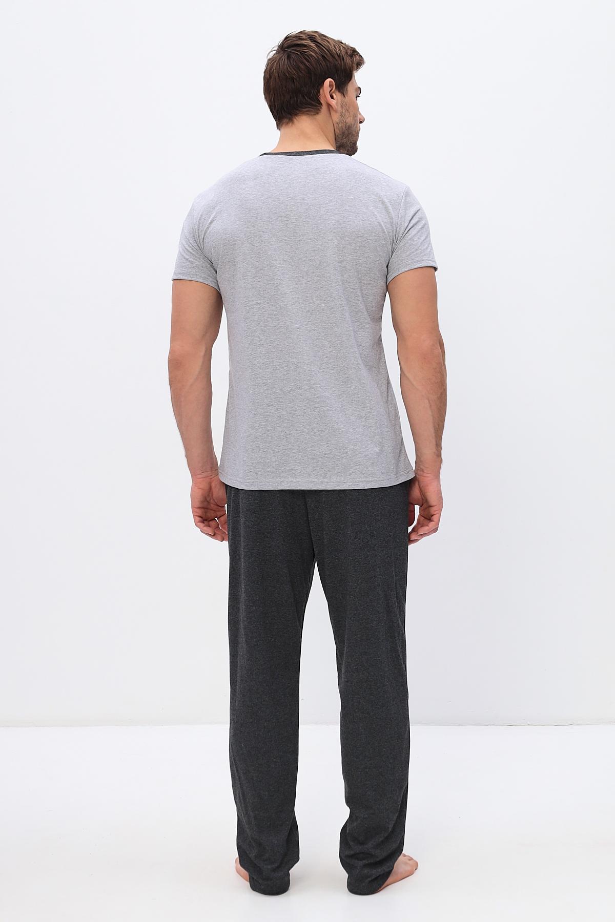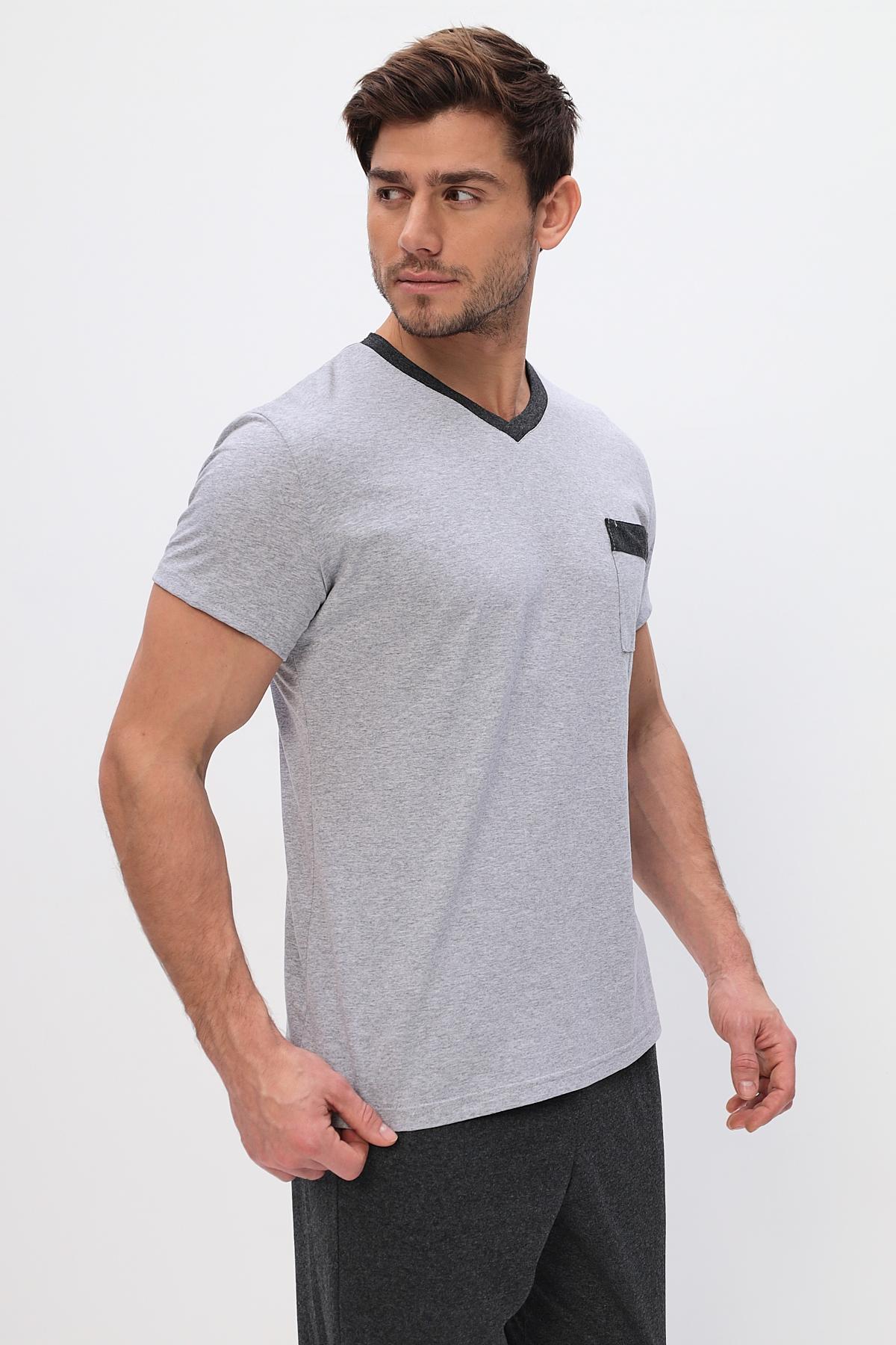 Удобный домашний костюм для мужчин. Состоит из футболки и брюк свободного кроя. В нем отлично отдыхать и спать. Комплект красиво сочетается и аккуратно выглядит. Воротник мысиком и кармашек в тон брюк гармонично дополняют модель комплекта.