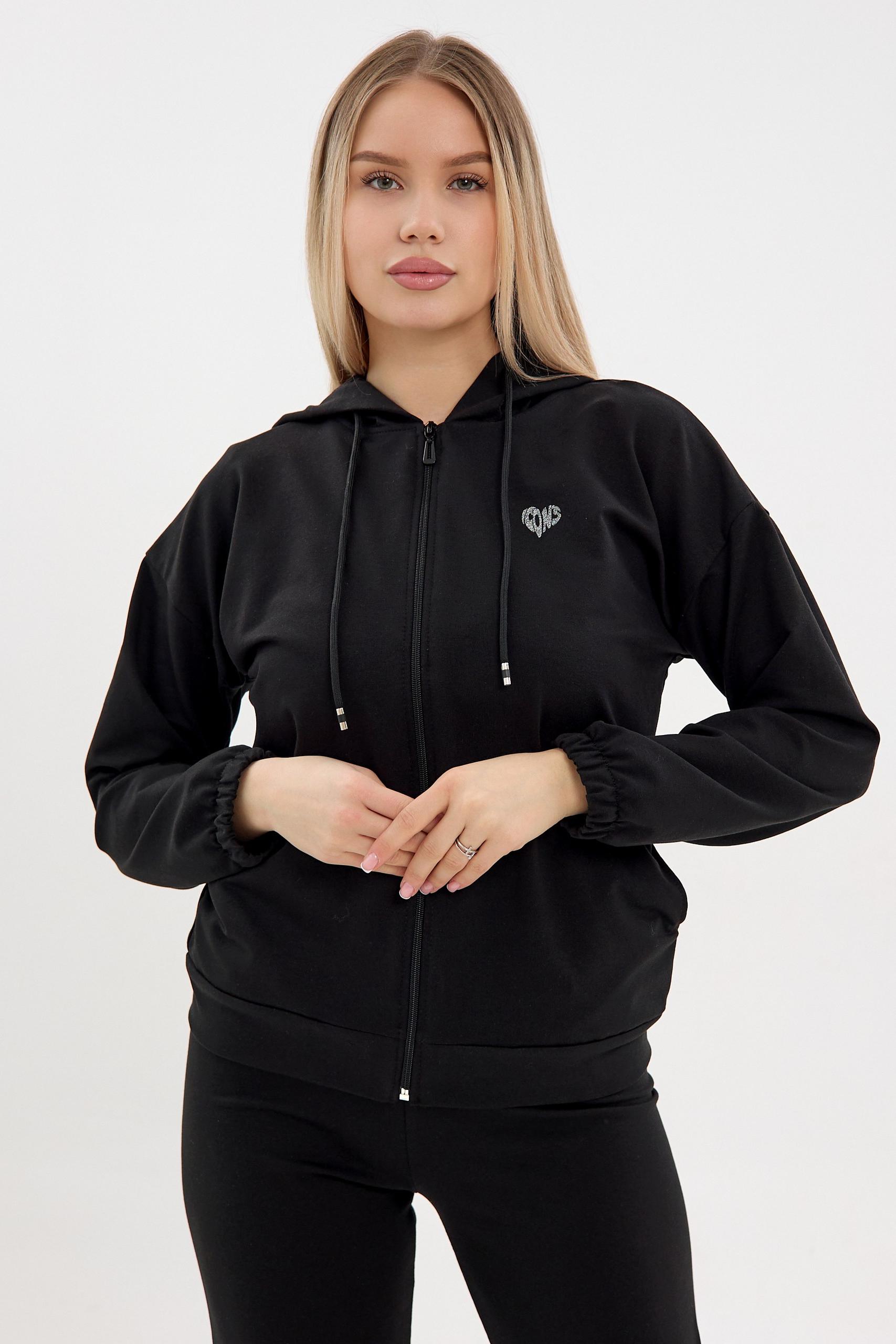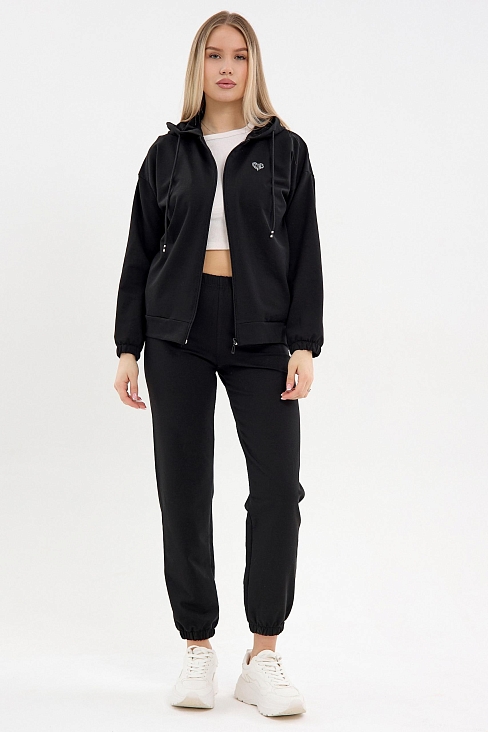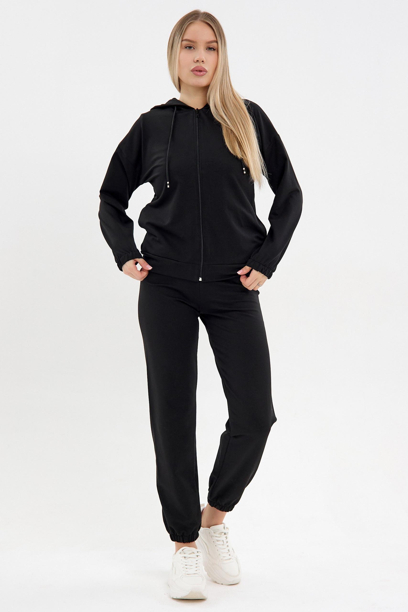Стильный и уютный женский костюм из качественного футера двухнитки. Материал мягкий, дышащий, хорошо сохраняет форму и не теряет вид после стирок. Толстовка с капюшоном на молнии дополнена двумя удобными карманами и небольшим принтом, который добавляет модели индивидуальности. Брюки на мягкой резинке пояса и с резинками по низу штанин обеспечивают идеальную посадку и комфорт в движении. Идеальный выбор для повседневной носки, прогулок и отдыха.