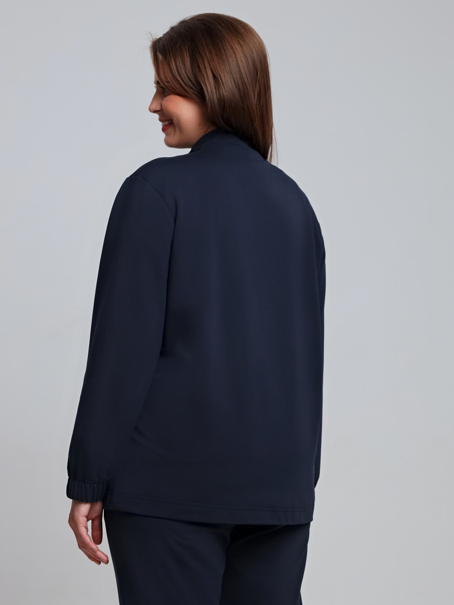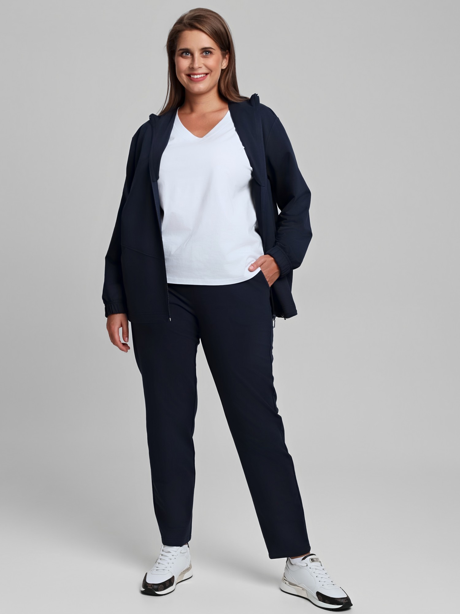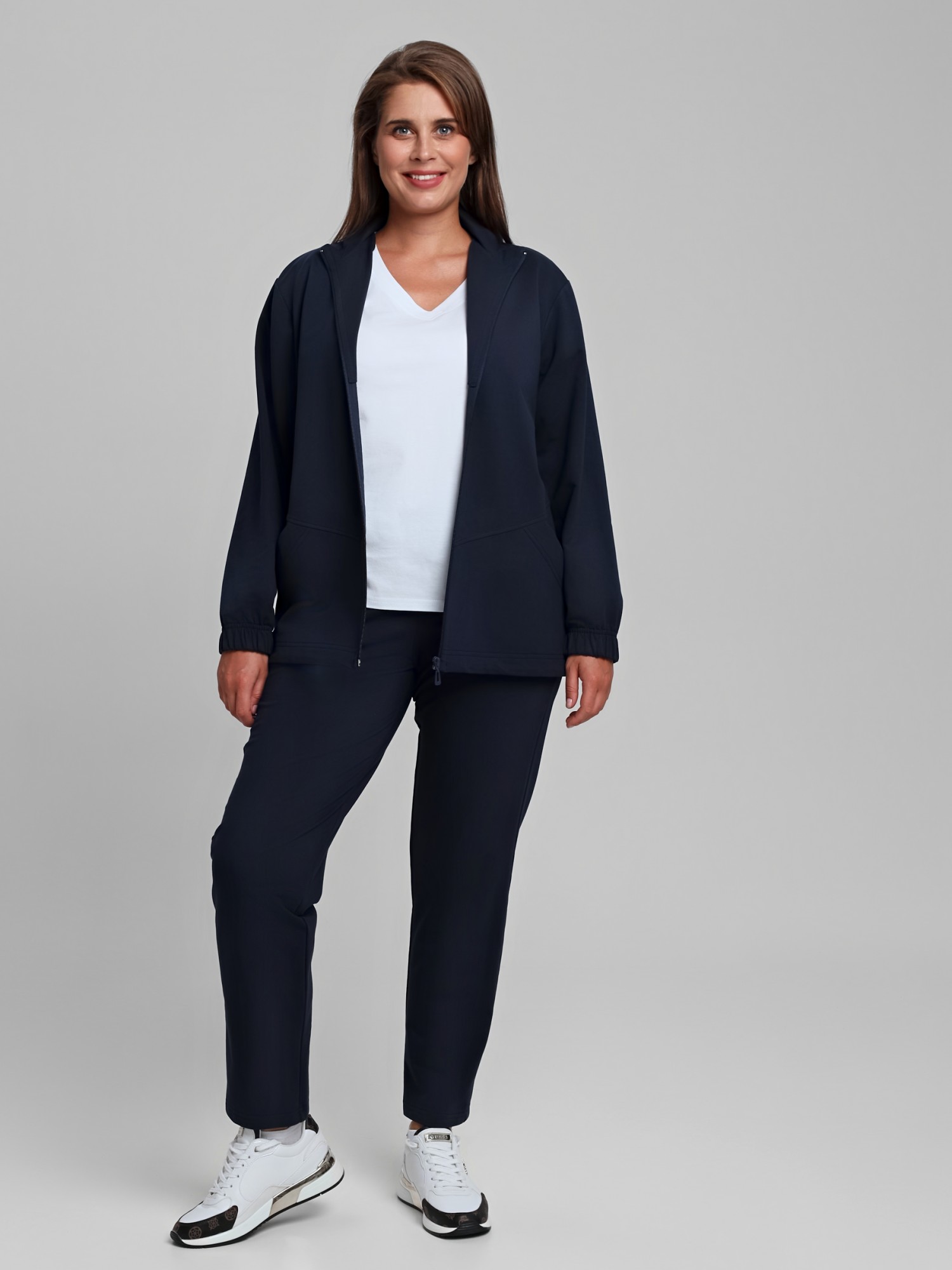 Костюм женский из трикотажного полотна «футер-двунитка» в единой цветовой гамме, состоящий из куртки и брюк. Куртка - прямого силуэта, свободная с длинными втачными рукавами, воротником «стойкой». Полочка состоит из двух частей соединенных по-косой, с накладными карманами и центральной бортовой застежкой на тесьму «молния». Низ рукавов обработан эластичной тесьмой, низ изделия с подгибкой с вложение эластичной тесьмы и регулируется по длине с помощью фиксаторов.Брюки - длинные, классического покроя, на притачном поясе с эластичной тесьмой внутри и карманами в боковых шва, на задних половинах обработаны две вытачки в области линии талии.