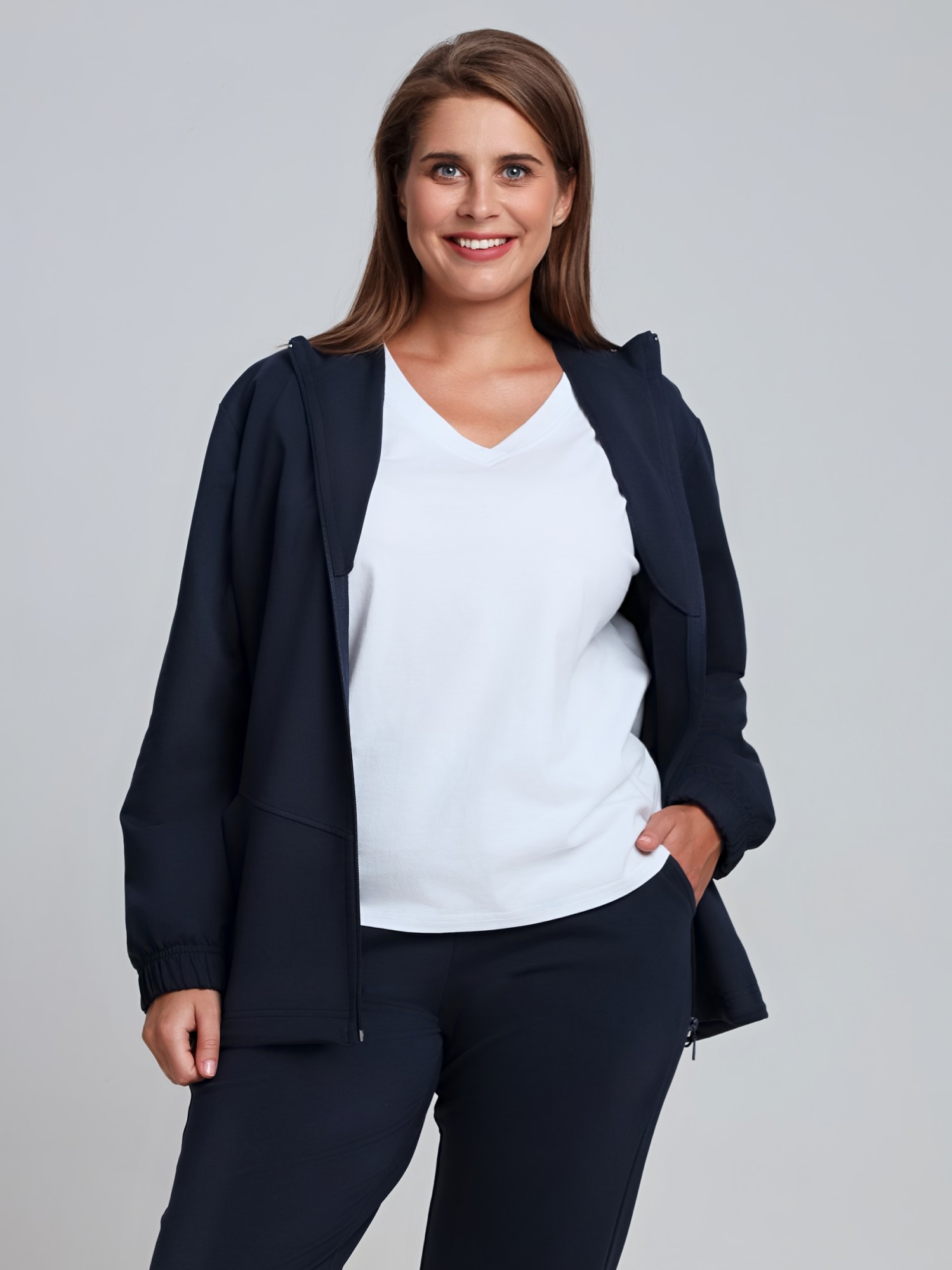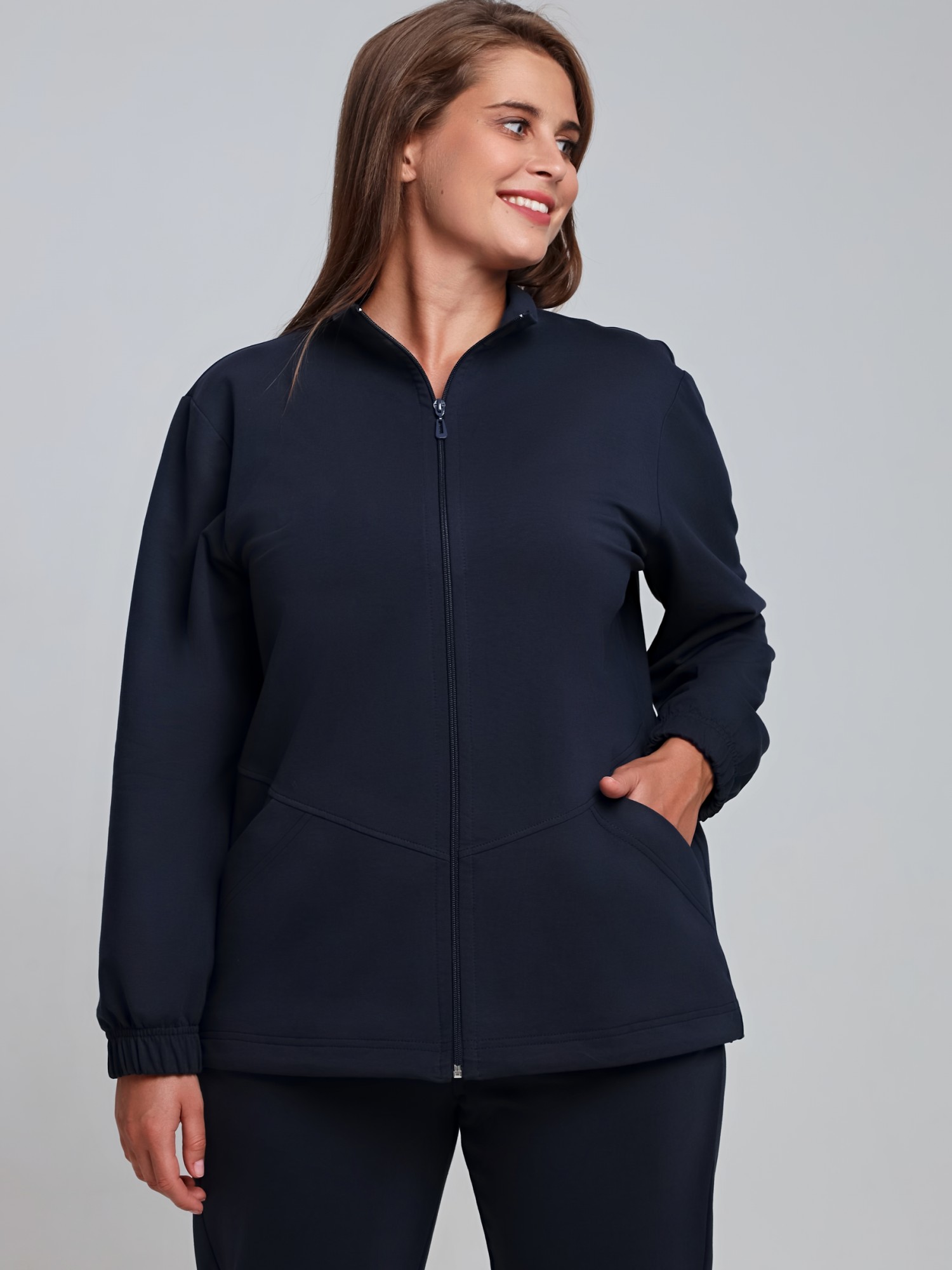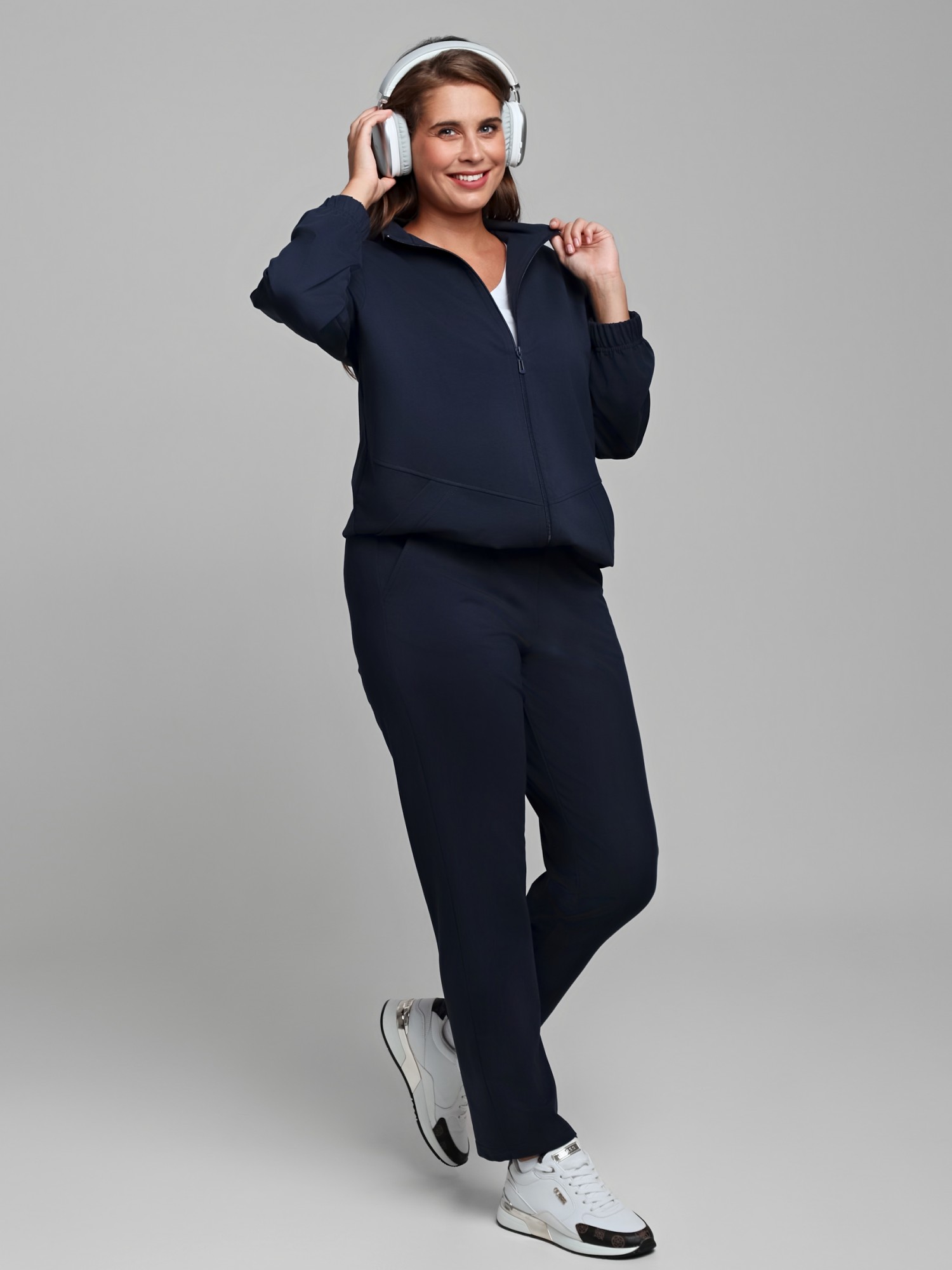 Костюм женский из трикотажного полотна «футер-двунитка» в единой цветовой гамме, состоящий из куртки и брюк. Куртка - прямого силуэта, свободная с длинными втачными рукавами, воротником «стойкой». Полочка состоит из двух частей соединенных по-косой, с накладными карманами и центральной бортовой застежкой на тесьму «молния». Низ рукавов обработан эластичной тесьмой, низ изделия с подгибкой с вложение эластичной тесьмы и регулируется по длине с помощью фиксаторов.Брюки - длинные, классического покроя, на притачном поясе с эластичной тесьмой внутри и карманами в боковых шва, на задних половинах обработаны две вытачки в области линии талии.