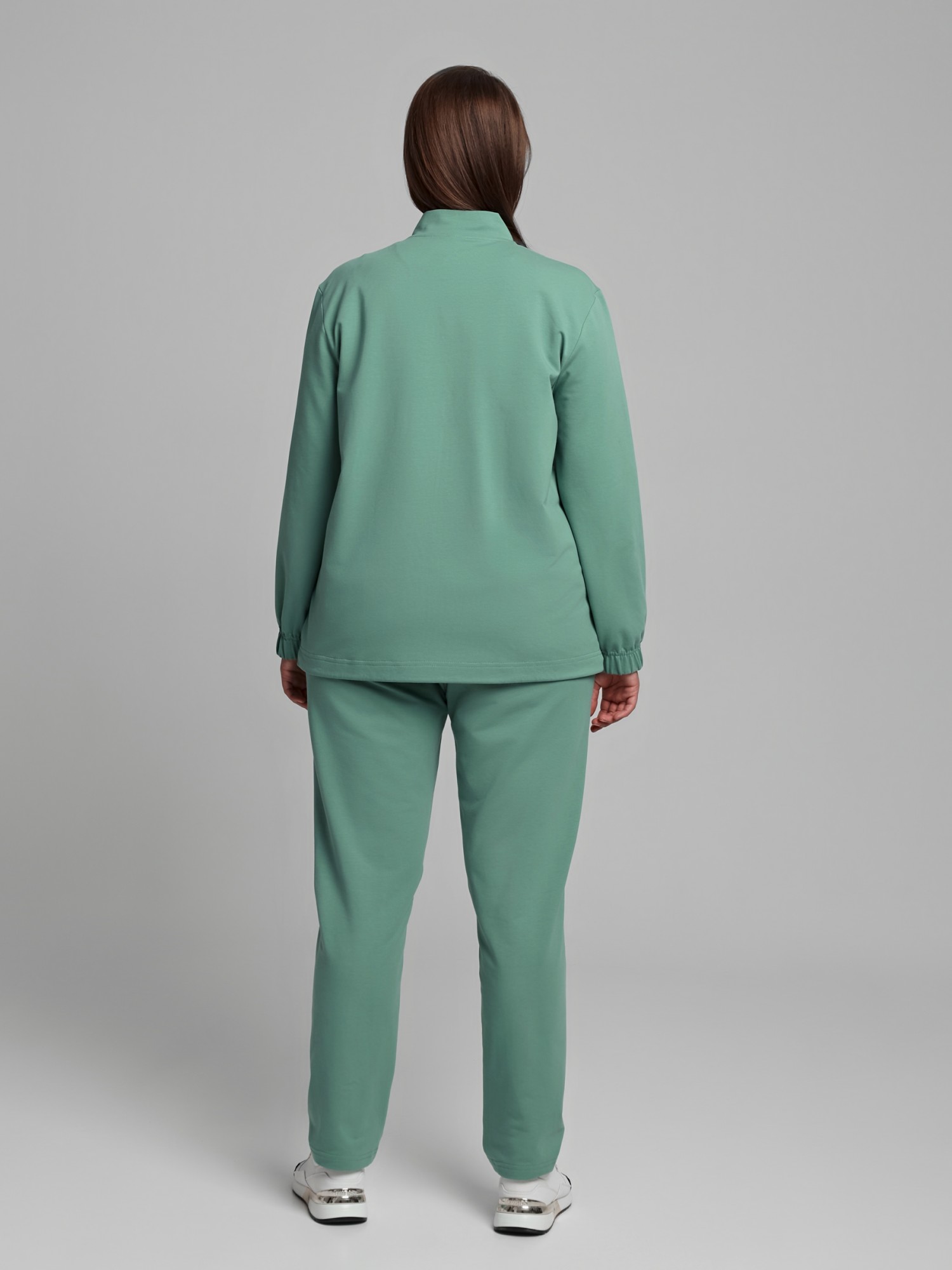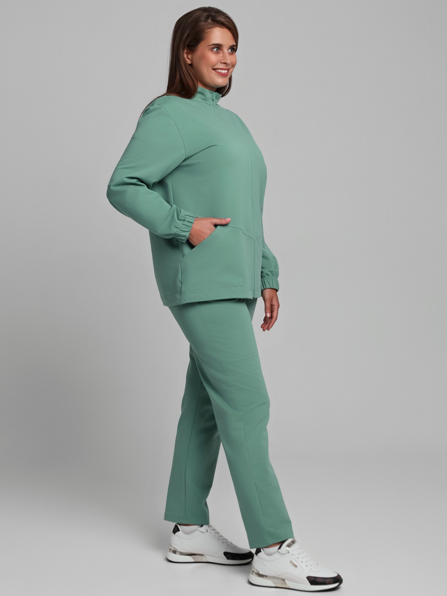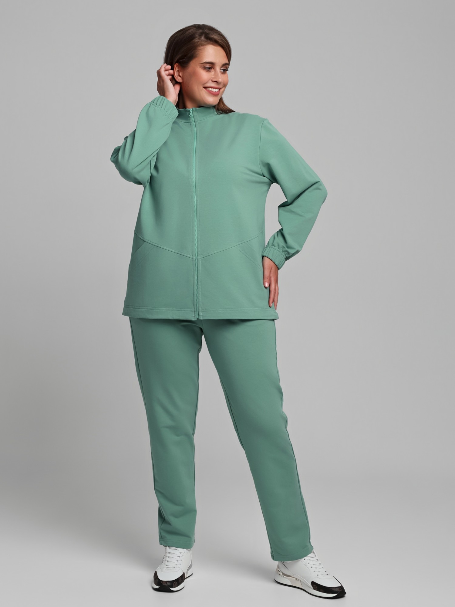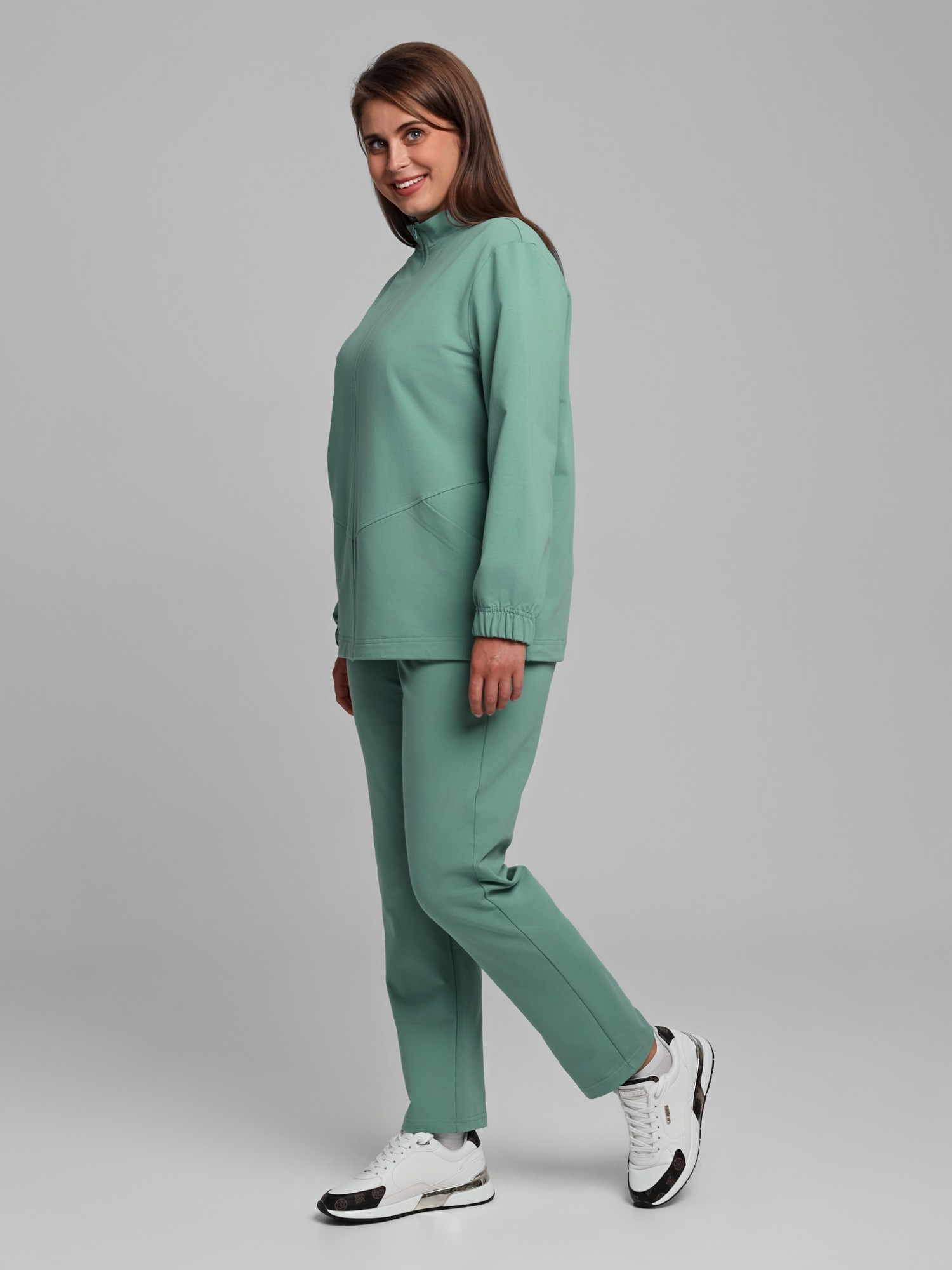 Костюм женский из трикотажного полотна «футер-двунитка» в единой цветовой гамме, состоящий из куртки и брюк. Куртка - прямого силуэта, свободная с длинными втачными рукавами, воротником «стойкой». Полочка состоит из двух частей соединенных по-косой, с накладными карманами и центральной бортовой застежкой на тесьму «молния». Низ рукавов обработан эластичной тесьмой, низ изделия с подгибкой с вложение эластичной тесьмы и регулируется по длине с помощью фиксаторов.Брюки - длинные, классического покроя, на притачном поясе с эластичной тесьмой внутри и карманами в боковых шва, на задних половинах обработаны две вытачки в области линии талии.