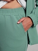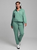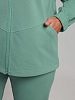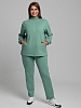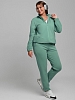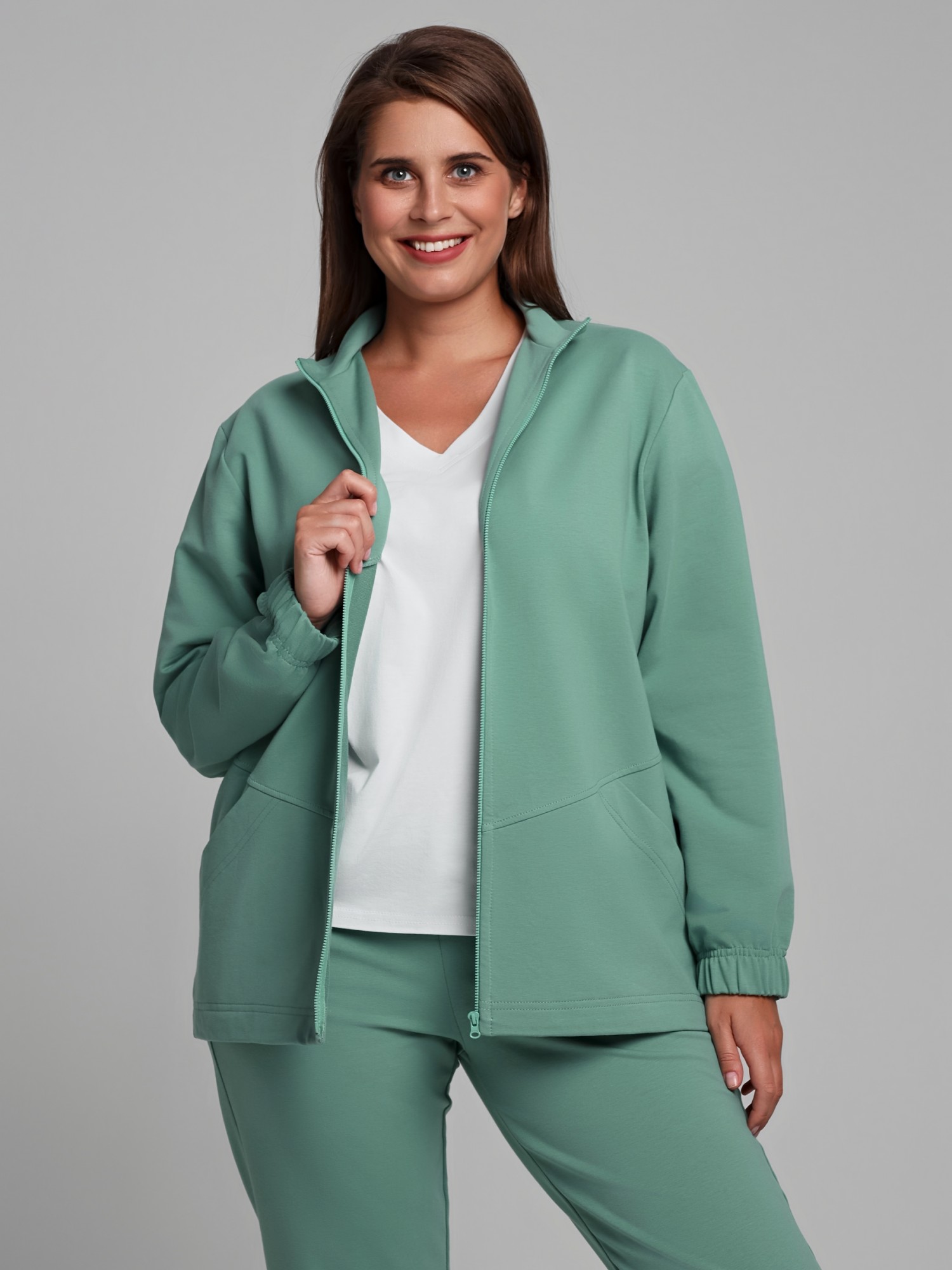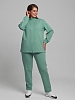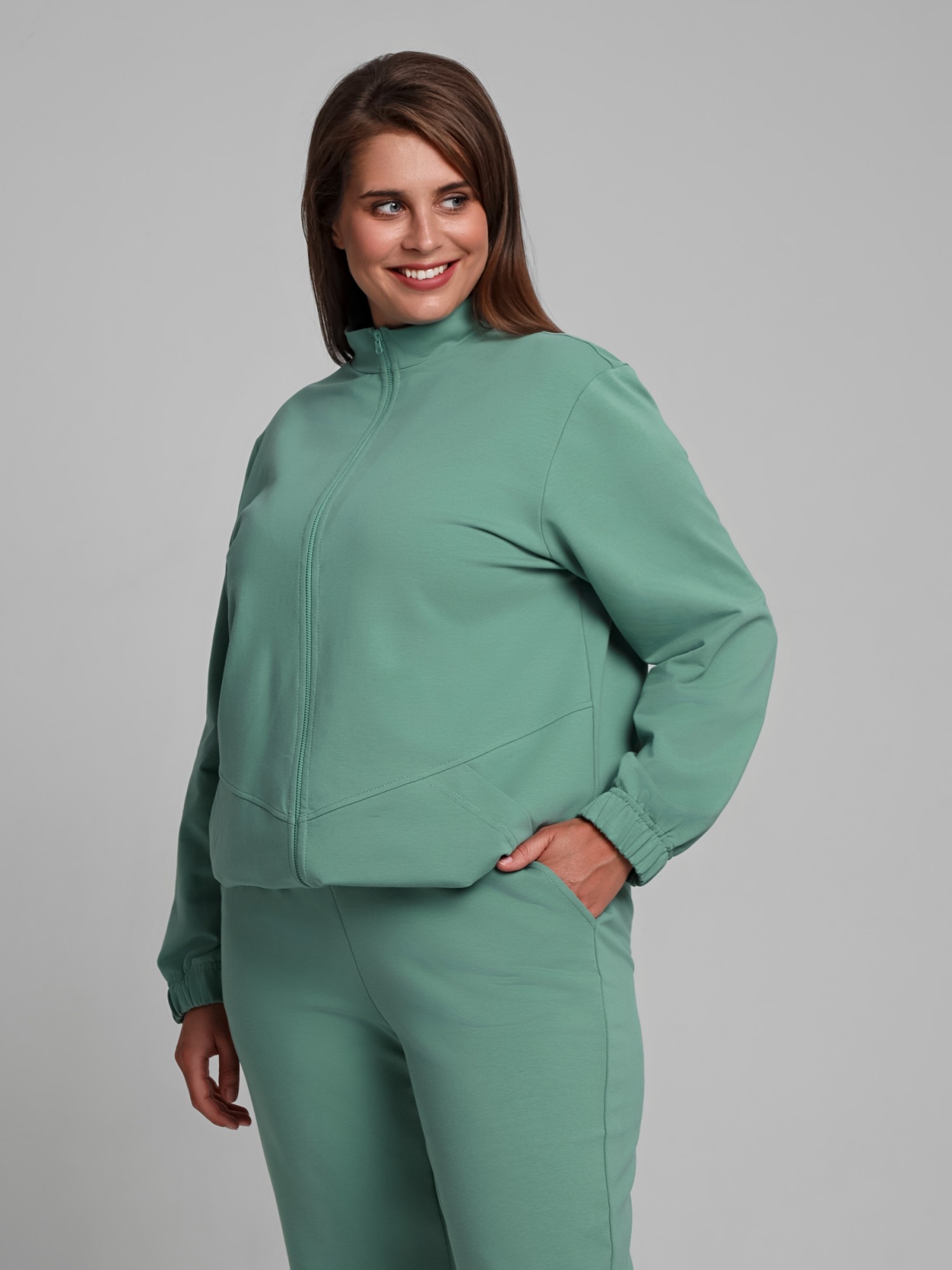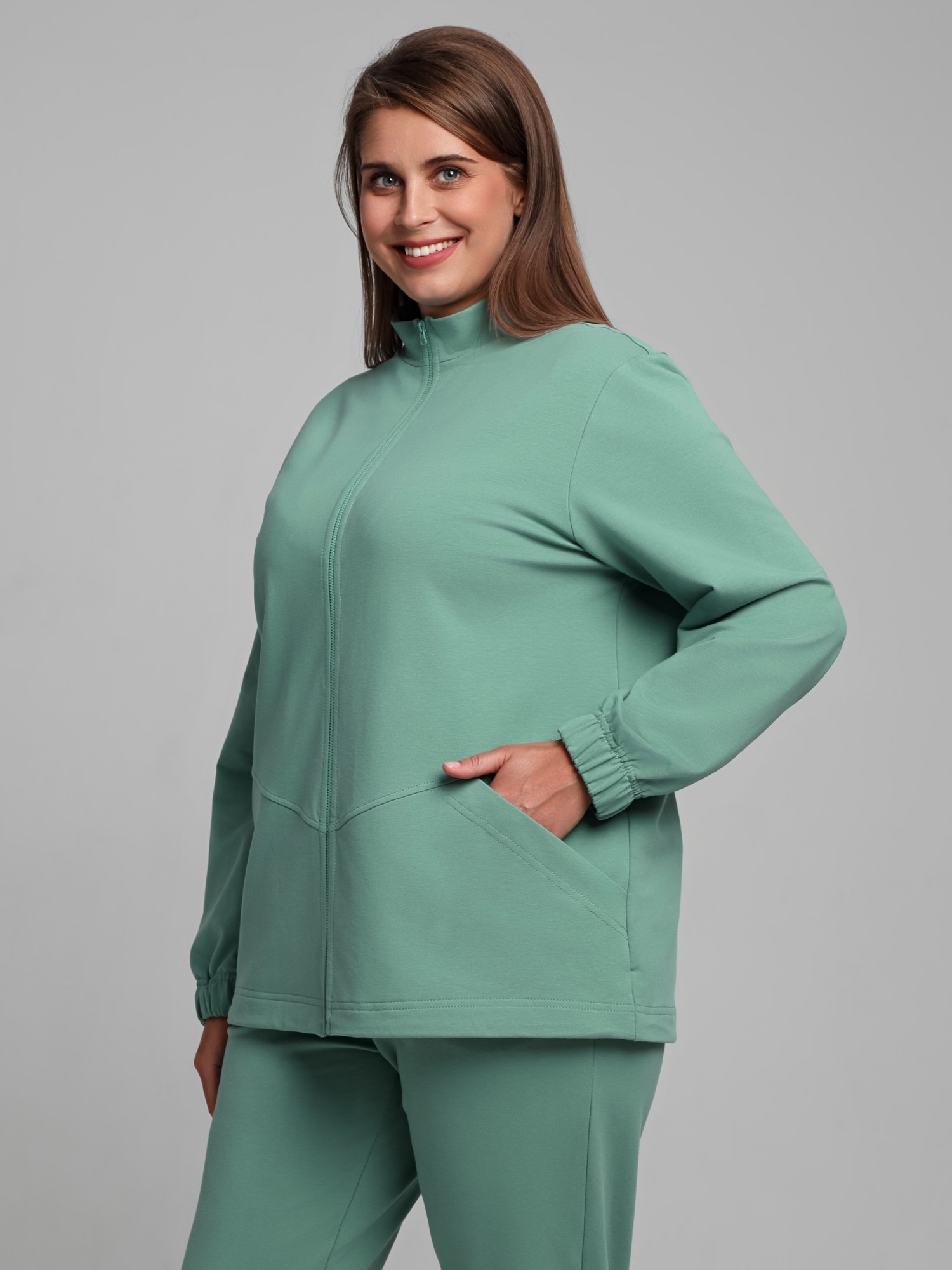 Костюм женский из трикотажного полотна «футер-двунитка» в единой цветовой гамме, состоящий из куртки и брюк. Куртка - прямого силуэта, свободная с длинными втачными рукавами, воротником «стойкой». Полочка состоит из двух частей соединенных по-косой, с накладными карманами и центральной бортовой застежкой на тесьму «молния». Низ рукавов обработан эластичной тесьмой, низ изделия с подгибкой с вложение эластичной тесьмы и регулируется по длине с помощью фиксаторов.Брюки - длинные, классического покроя, на притачном поясе с эластичной тесьмой внутри и карманами в боковых шва, на задних половинах обработаны две вытачки в области линии талии.