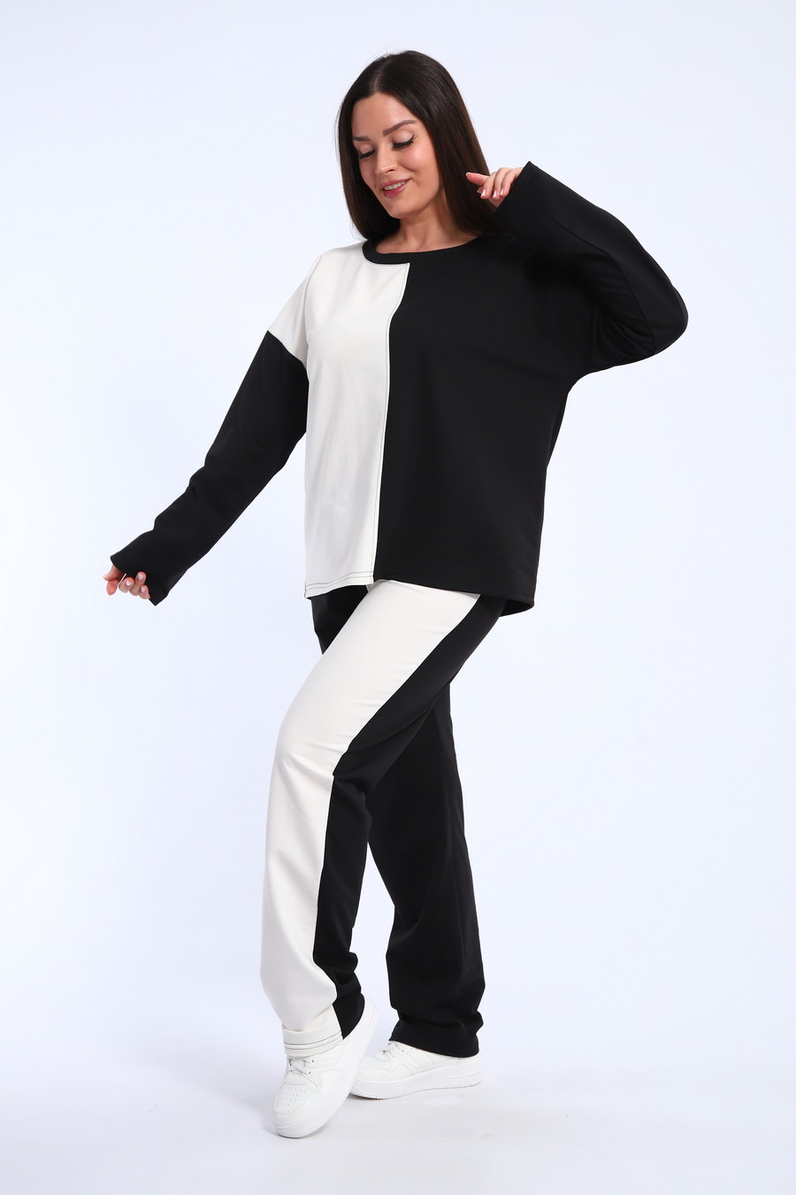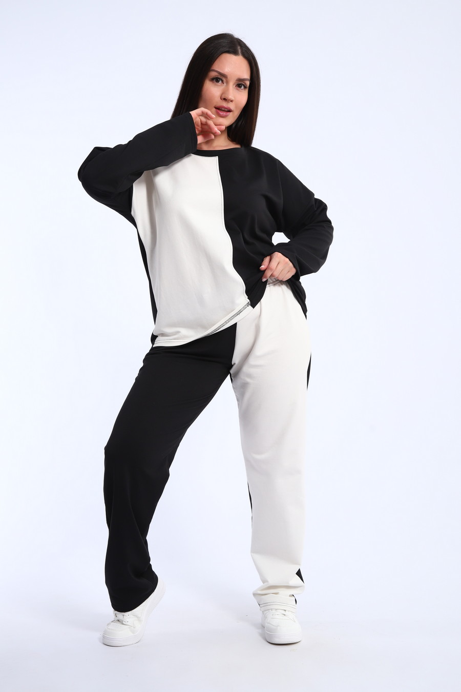 Костюм женский из футера 2-х нитка Дуэт 2 черно-белый состоит из толстовки и свободных брюк. Женский спортивный костюм идеально впишется в повседневный гардероб.