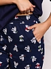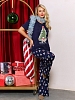Костюм женский из трикотажного полотна "кулирка" в комбинации двух видов: гладкокрашеного и набивного с тематическим рисунком, состоящий из футболки и брюк. Футболка из гладкокрашеного полотна, классического покроя, с коротким втачными рукавами, горловиной овальной формы, обработанной втачной планкой и отделочной строчкой. В центре переда - принт, выполненгный в технике шелкографии. Брюки из полотна с набивным рисунком длинные, прямые, на притачном поясе с эластичной тесьмой внутри и карманами в боковыых швах.