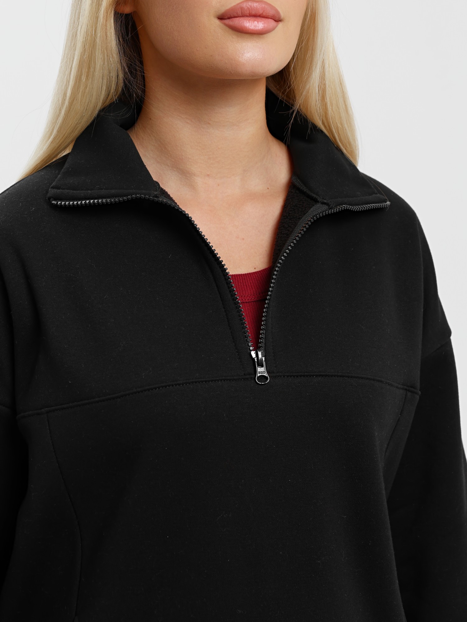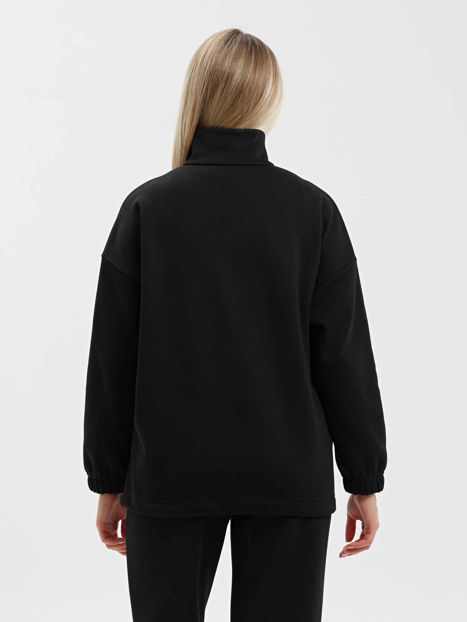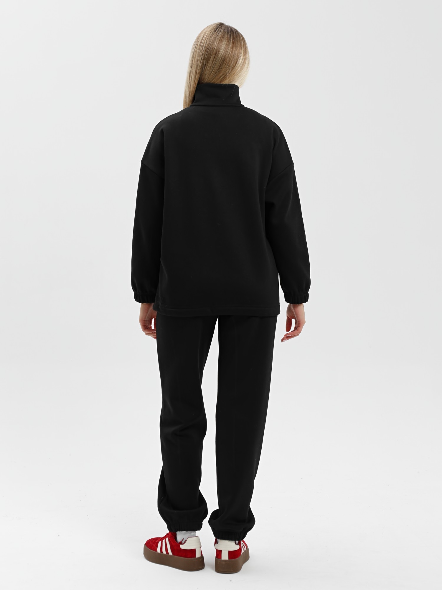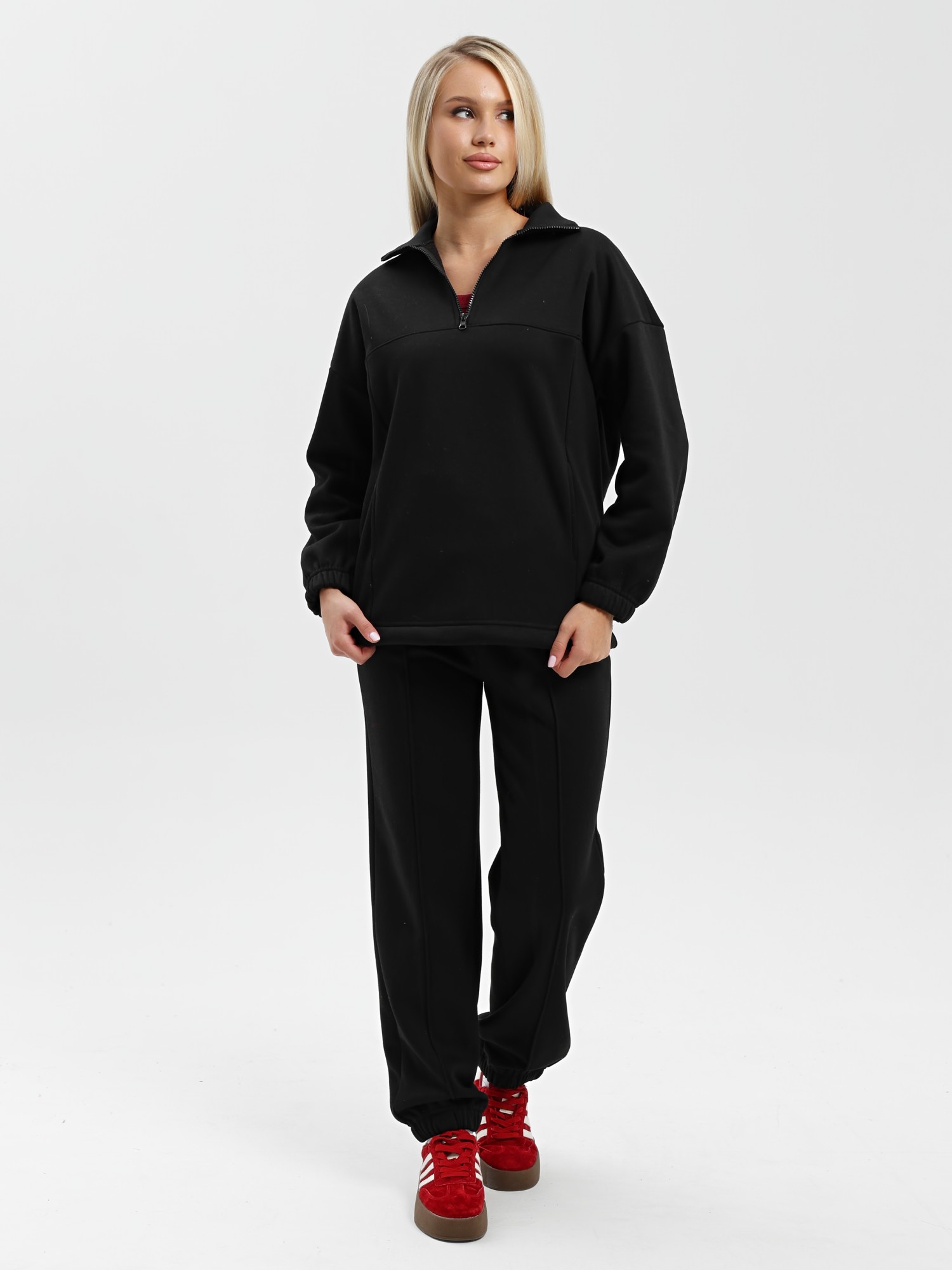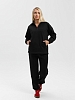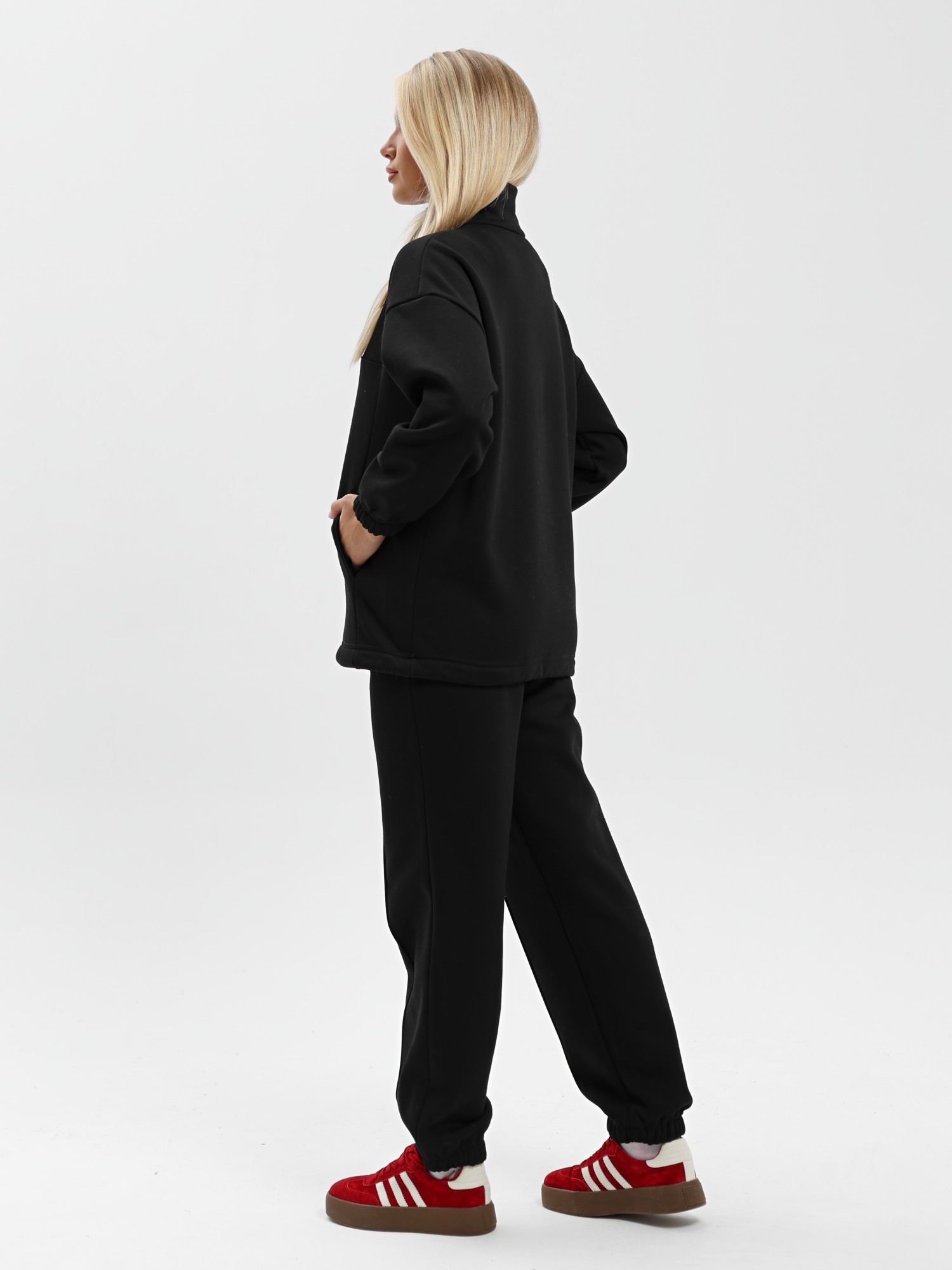 Костюм молодежный из трикотажного гладкокрашенного полотна «еврофлис», Джемпер - свободного покроя, с длинными втачными рукавами, нижние срезы которых обработаны эластичной тесьмой, воротником-стойкой и карманами в рельефных швах. Полочка - с отрезной кокеткой из двух частей, с застежкой "молния", обработанной в соединительном шве. Низ изделия с подгибкой и регулируется по ширине с помощью фиксатора.Брюки – длинные, полуприлегающего силуэта, на поясе с эластичной тесьмой внутри и карманами в боковых швах. Передние половины застрочены по центральным линиям.