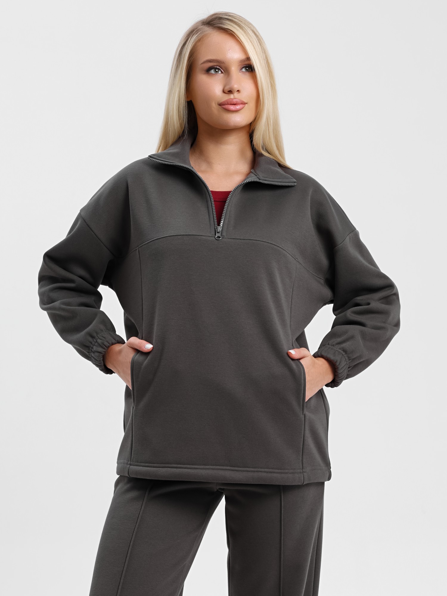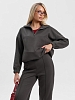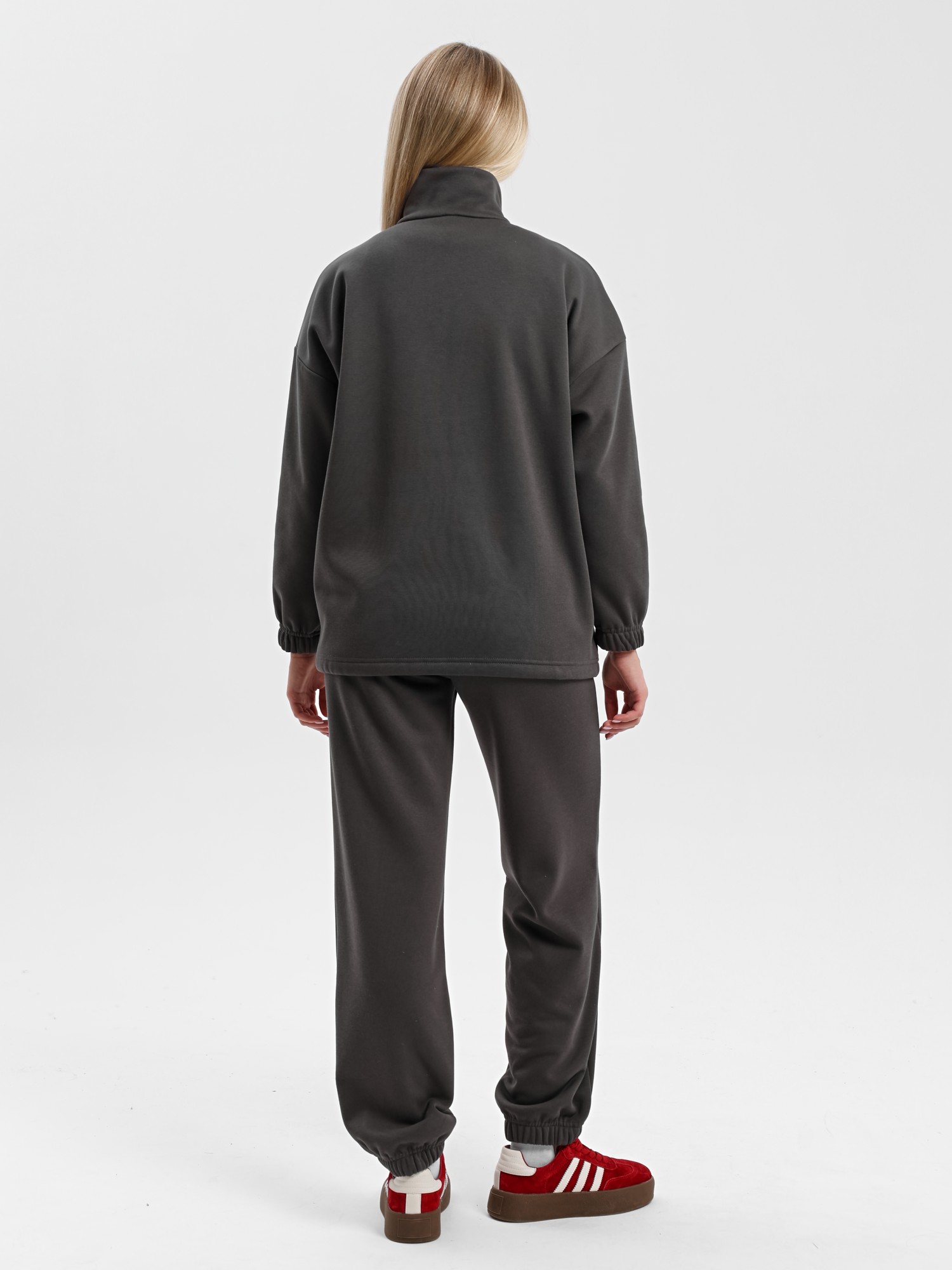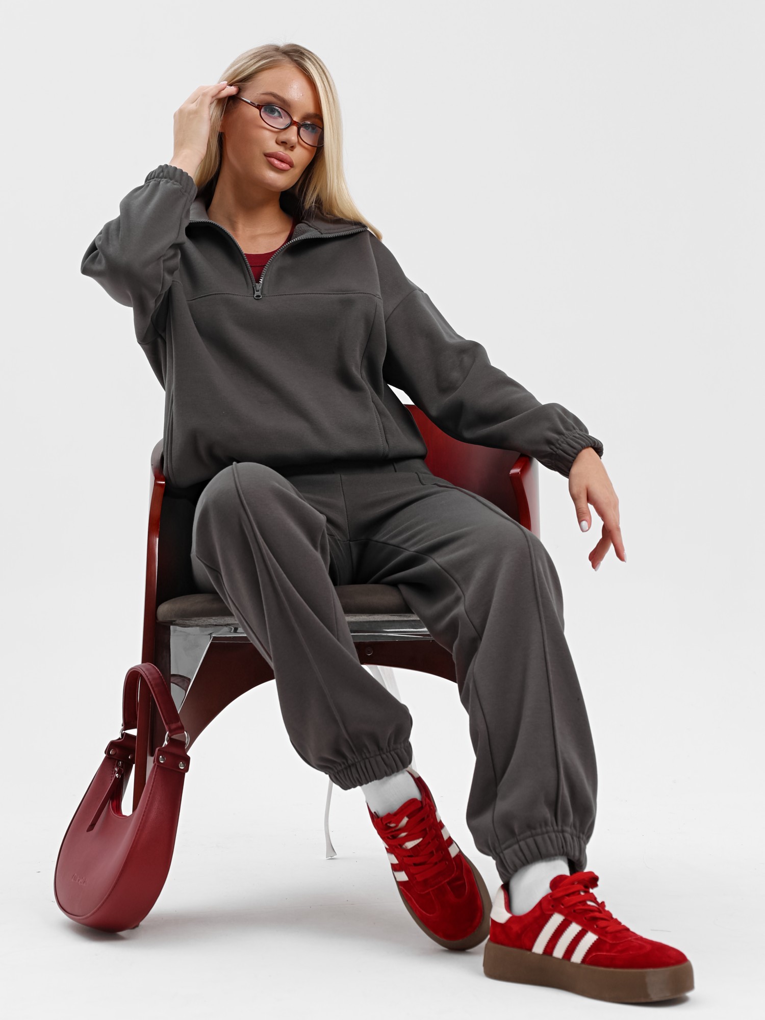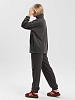 Костюм молодежный из трикотажного гладкокрашенного полотна «еврофлис», Джемпер - свободного покроя, с длинными втачными рукавами, нижние срезы которых обработаны эластичной тесьмой, воротником-стойкой и карманами в рельефных швах. Полочка - с отрезной кокеткой из двух частей, с застежкой "молния", обработанной в соединительном шве. Низ изделия с подгибкой и регулируется по ширине с помощью фиксатора.Брюки – длинные, полуприлегающего силуэта, на поясе с эластичной тесьмой внутри и карманами в боковых швах. Передние половины застрочены по центральным линиям.