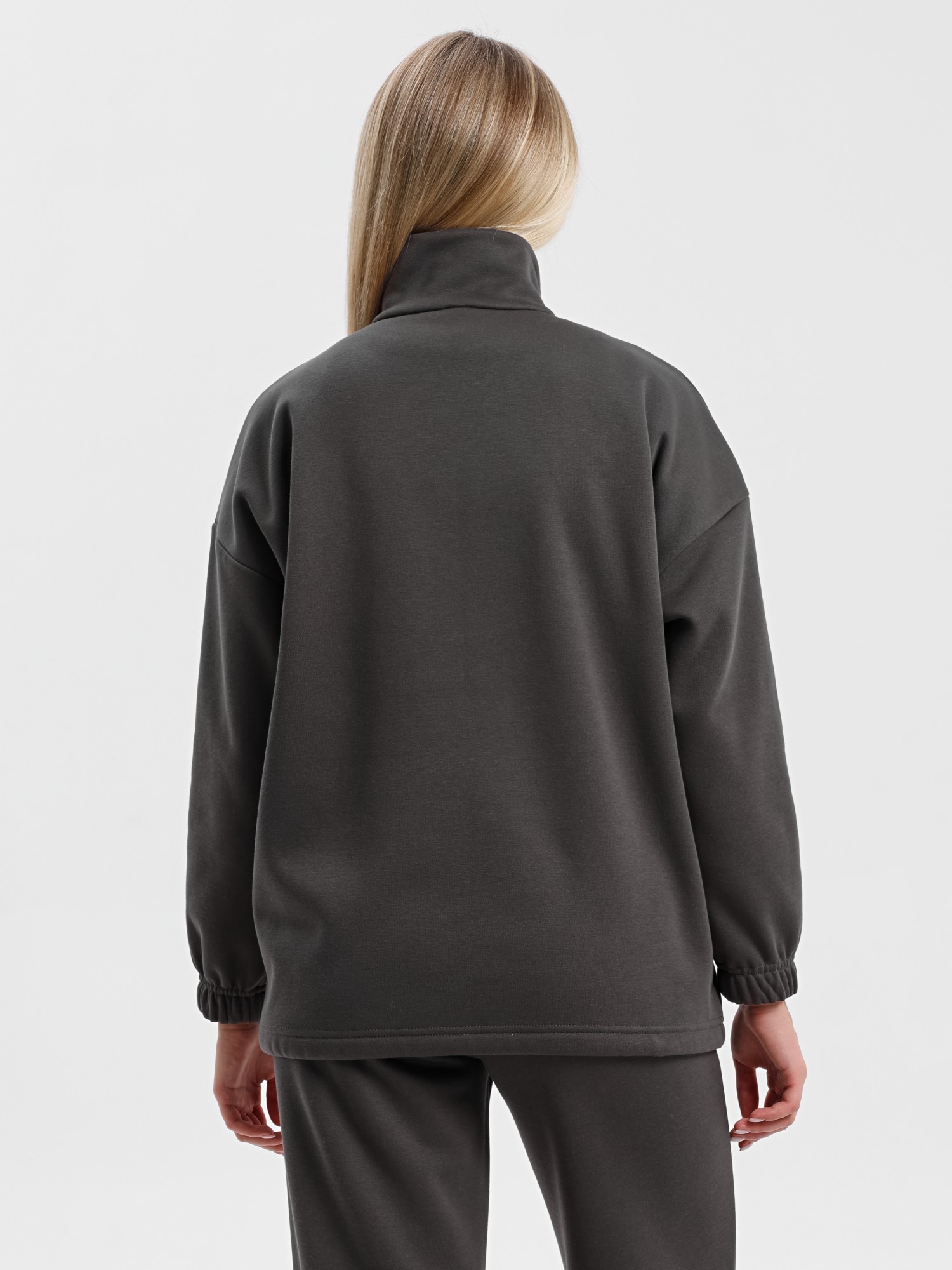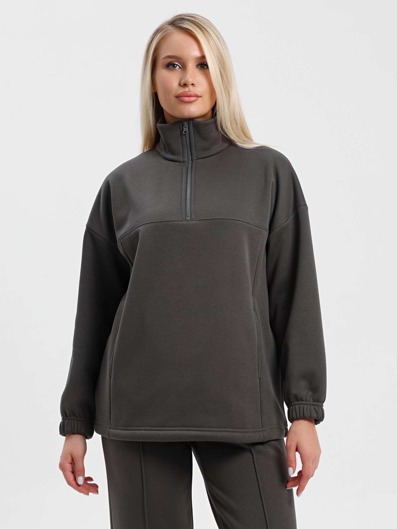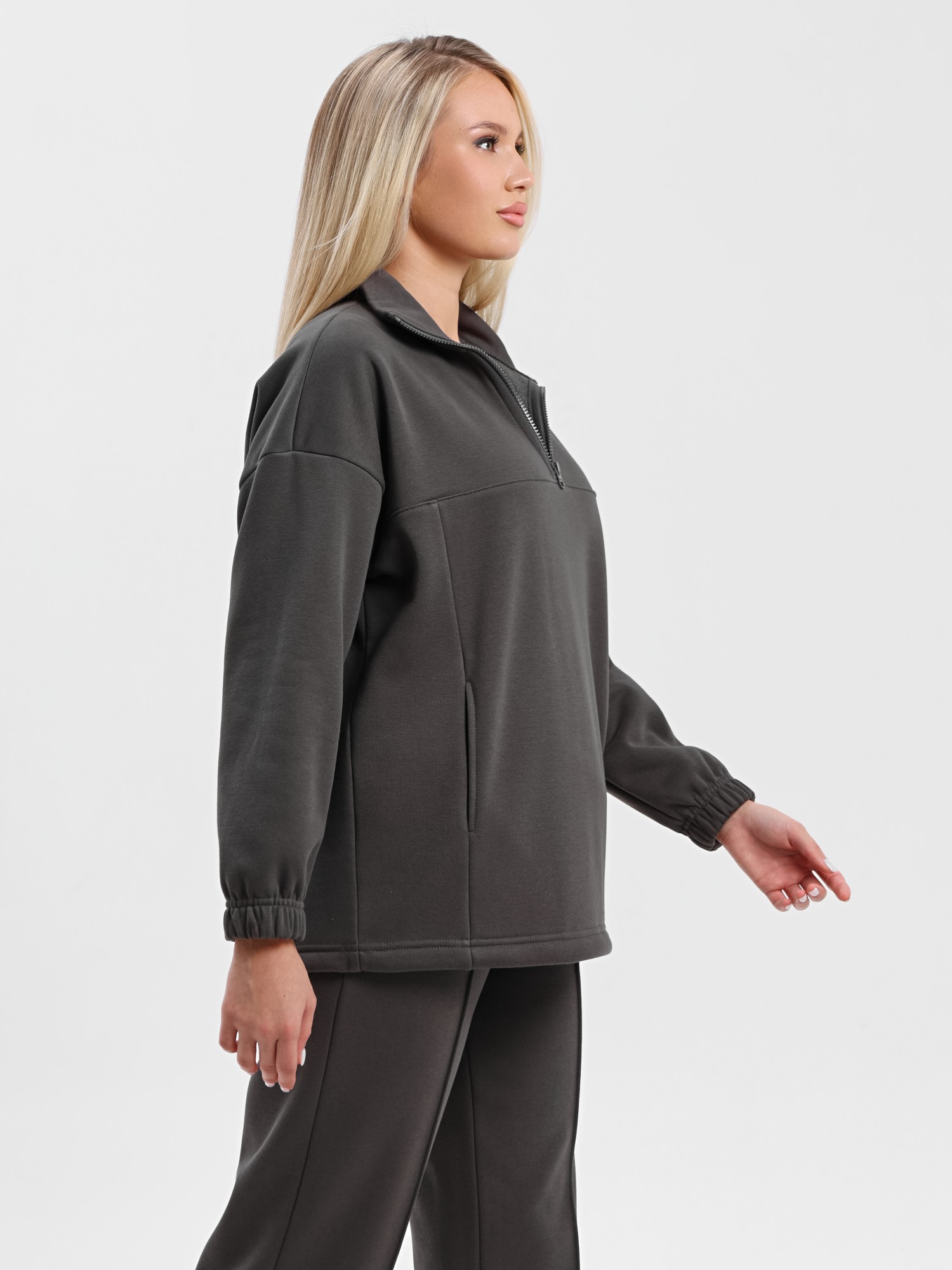 Костюм молодежный из трикотажного гладкокрашенного полотна «еврофлис», Джемпер - свободного покроя, с длинными втачными рукавами, нижние срезы которых обработаны эластичной тесьмой, воротником-стойкой и карманами в рельефных швах. Полочка - с отрезной кокеткой из двух частей, с застежкой "молния", обработанной в соединительном шве. Низ изделия с подгибкой и регулируется по ширине с помощью фиксатора.Брюки – длинные, полуприлегающего силуэта, на поясе с эластичной тесьмой внутри и карманами в боковых швах. Передние половины застрочены по центральным линиям.