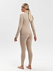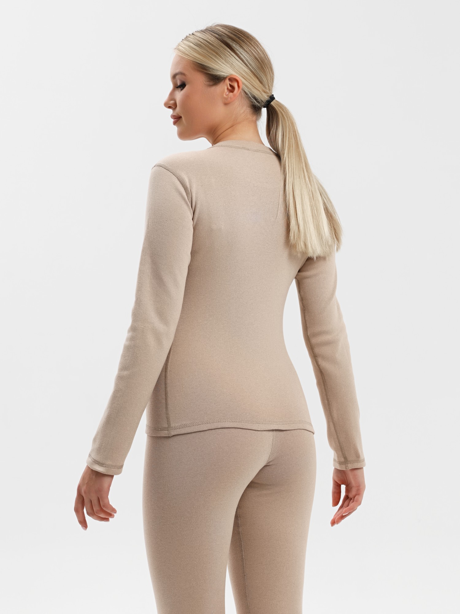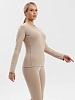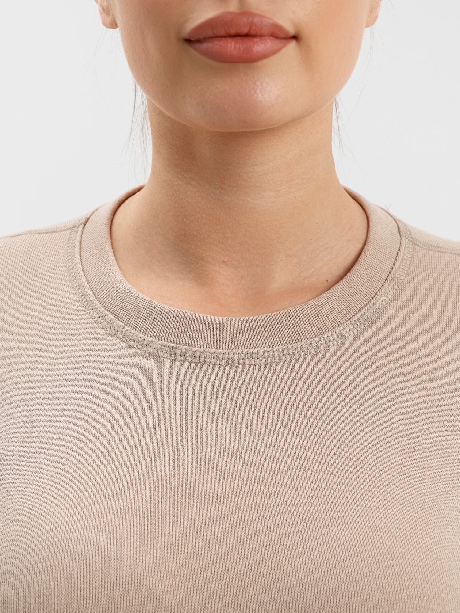 Футболка – прилегающего силуэта, с длинными втачными рукавами, горловиной овальной формы, обработанной втачной планкой из основного материала. Подгибка низа изделия и рукавов, шва втачивания планки в горловину обработаны пяти ниточной строчкой в цвет основного материала.
