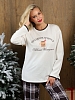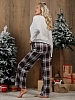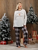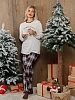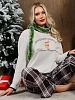 Костюм женский из трикотажного полотна "кулирка" в комбинации двух видов: гладкокрашенного и с рисунком в крупную клетку, сочетающихся между собой по цвету, состоящий из джемпера и брюк. Джемпер - из гладкокрашеного полотна, свободного покроя, с длинными втачными рукавами и приспущенными плечами, с горловиной овальной формы и тематическим принтом, выполненным в технике шелкографии. Горловина, нижние срезы рукавов и низ изделия обработаны подгибкой с отделочным широким кантом контрастного цвета. Брюки - из полотна в клетку, свободного покроя, прямые, на притачном поясе с эластичной тесьмой внутри, с карманами в боковых швах. Нижние срезы обработаны подгибкой.