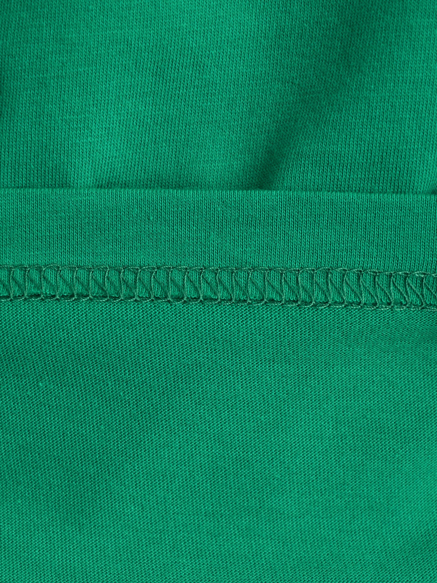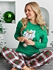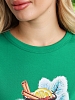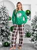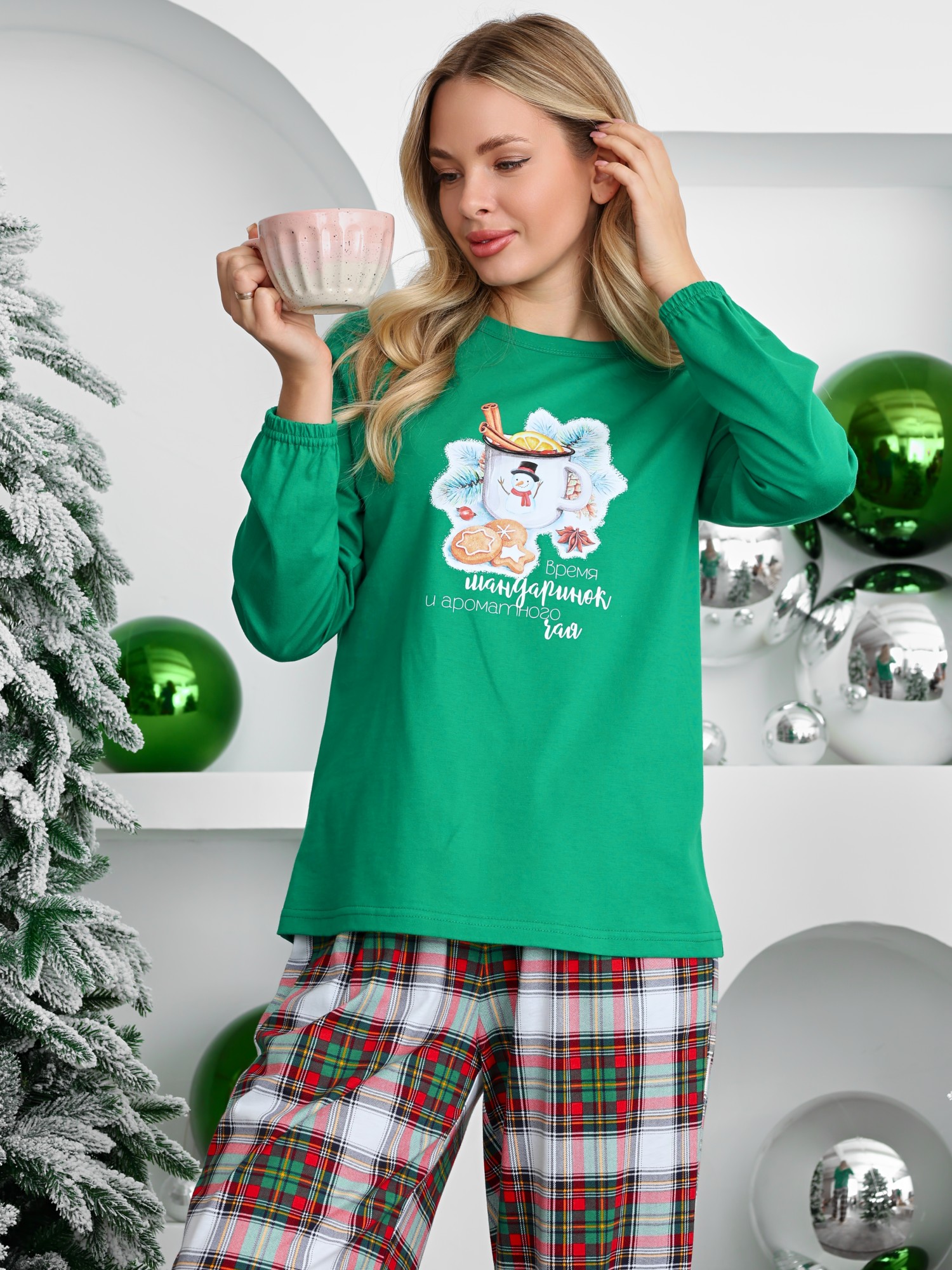 Костюм молодежный из трикотажного полотна «кулирка» в комбинации двух видов: с набивным рисунком и гладкокрашенного в единой цветовой гамме, состоящий из лонгслива и брюк. Лонгслив - из гладкокрашенного полотна, классического покроя, с длинными втачными рукавами по нижнему срезу с эластичной тесьмой, горловиной овальной формы и принтом на полочке, выполненным в технике «шелкографии». Горловина окантована основным материалом.Брюки - из полотна с набивным рисунком, длинные, с карманами в боковых швах. Притачной пояс и низ брюк с эластичной тесьмой.