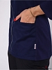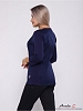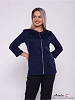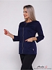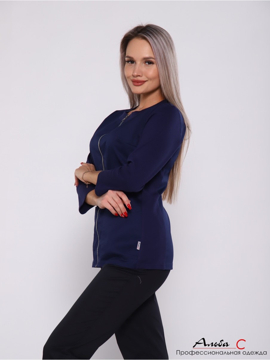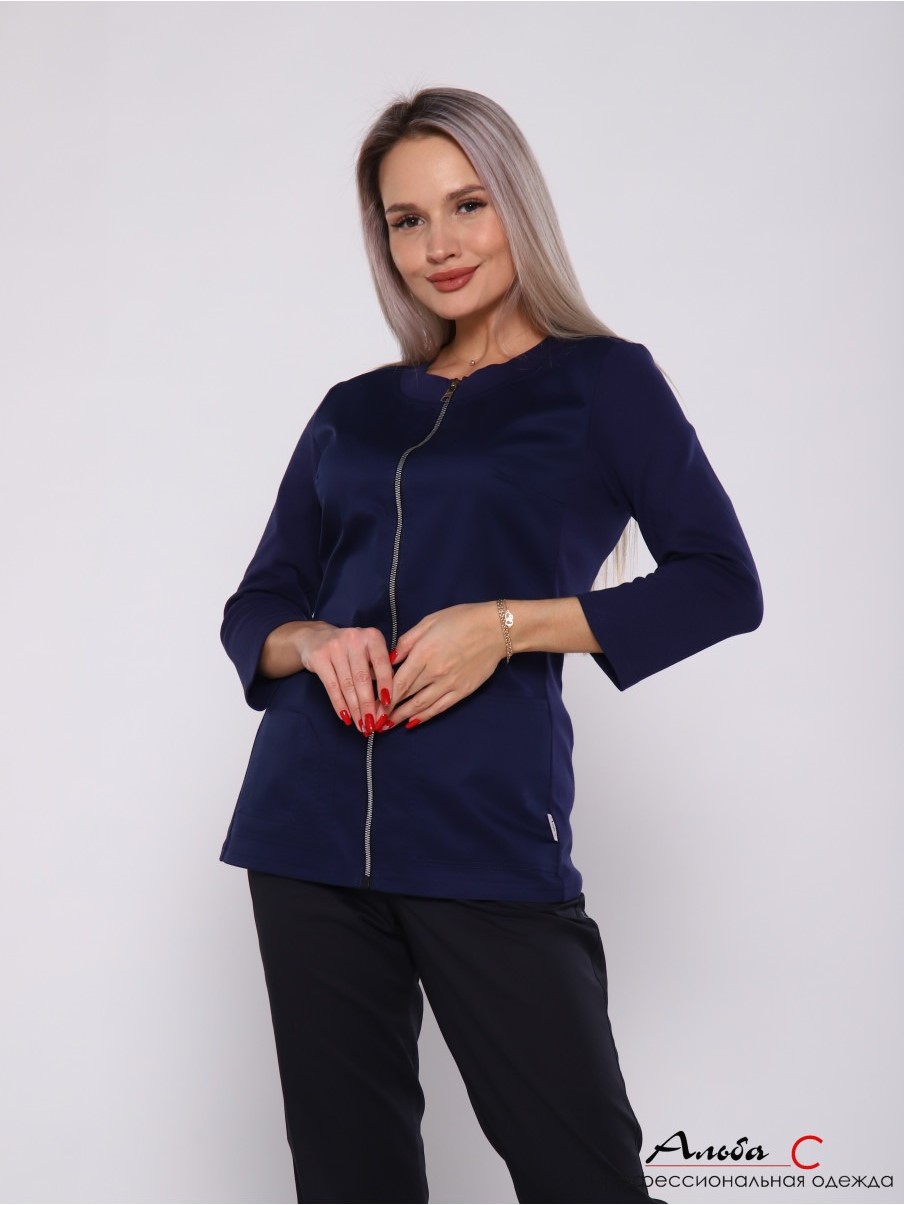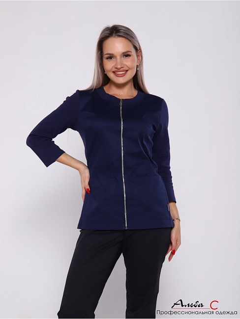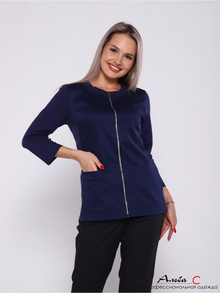 Куртка женская полуприлегающего силуэта К109.0 с центральной бортовой застежкой на молнию. Изделие без воротника с притачной обтачкой по горловине. На полочках расположены 2 больших боковых кармана, втачанных в рельефы, и 1 малый боковой карман с фирменным знаком по нижнему краю и 1 нагрудный карман со скошенными углами и притачной обтачкой. Спинка со средним швом. Рукава 3/4. Изделие комбинированное: обтачка горловины, бочки, рукава выполнены из трикотажа. Все швы обработаны двойной отделочной строчкой.