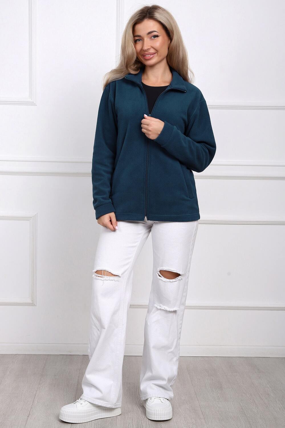 Куртка женская из флиса. Силуэт прямой. Длинна до середины бедра. Воротник стойка. Карман листочка. Рукав втачной, на манжете. Линия плеч чуть спущена. Застежка на тесьму молнию. Отделкой служат отделочные строчки с застилом.