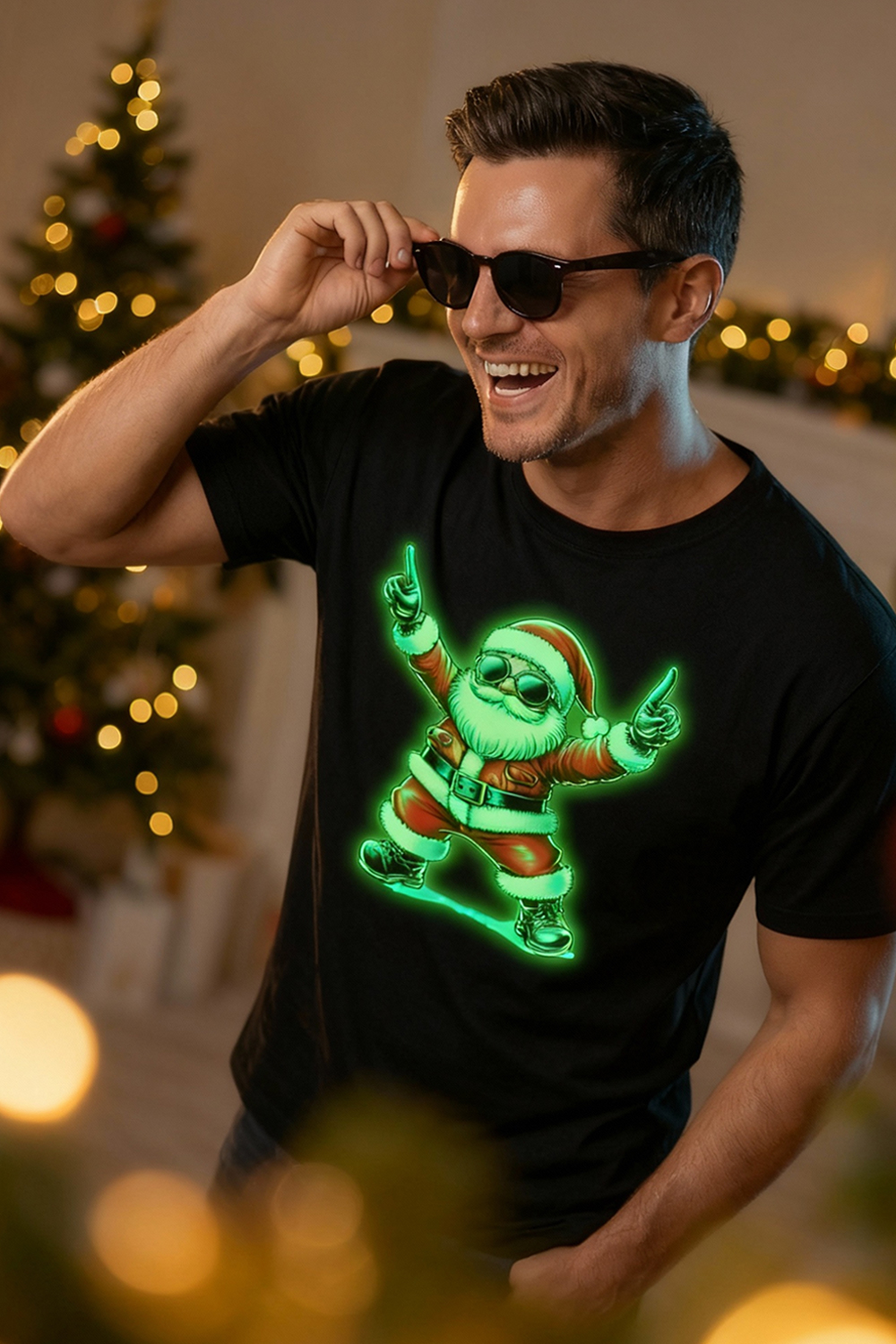 Представьте: Новый год, вечеринка в разгаре, а вы в стильной футболке с Сантой, который не просто раздает подарки, а зажигает на полную!