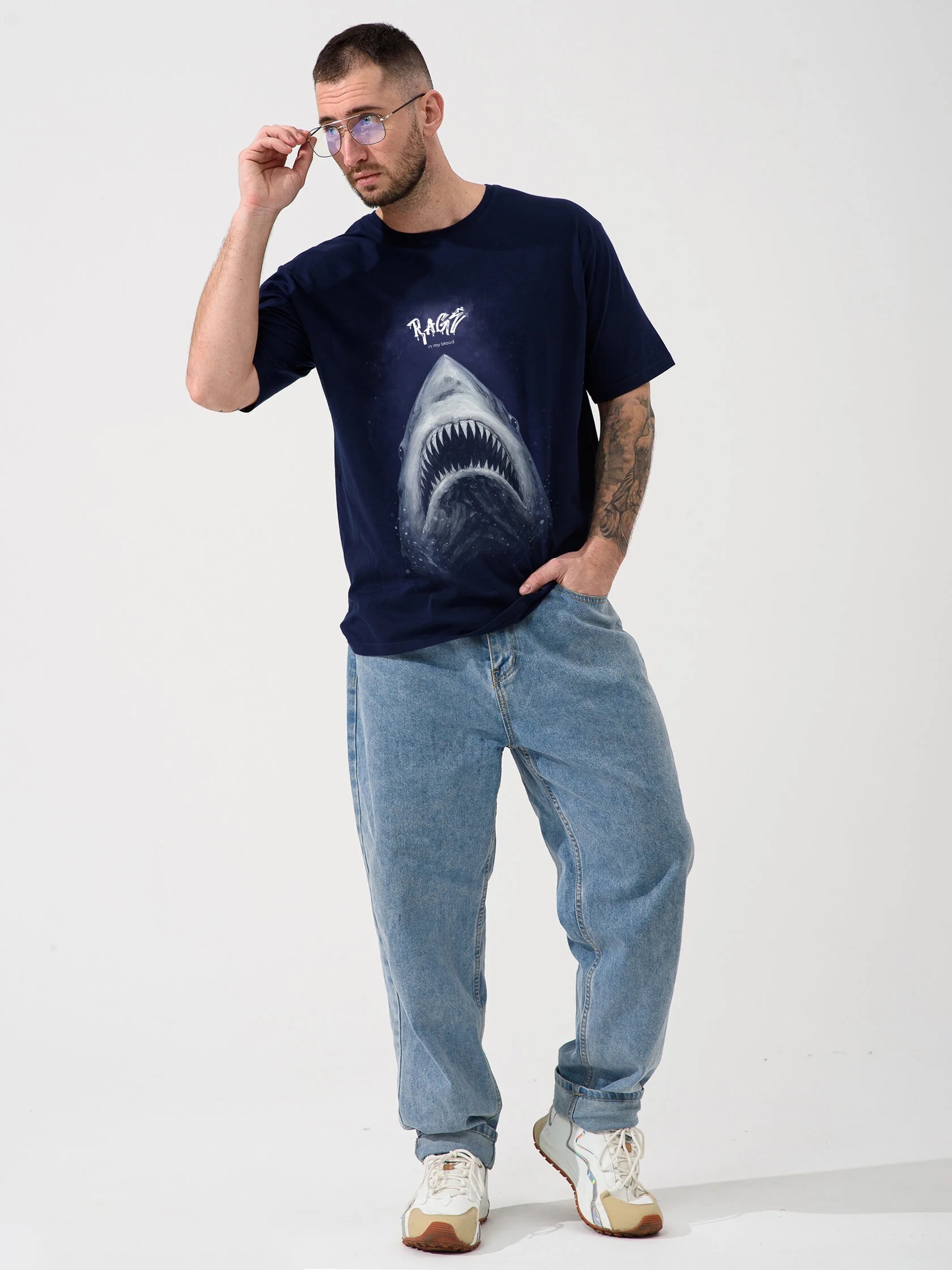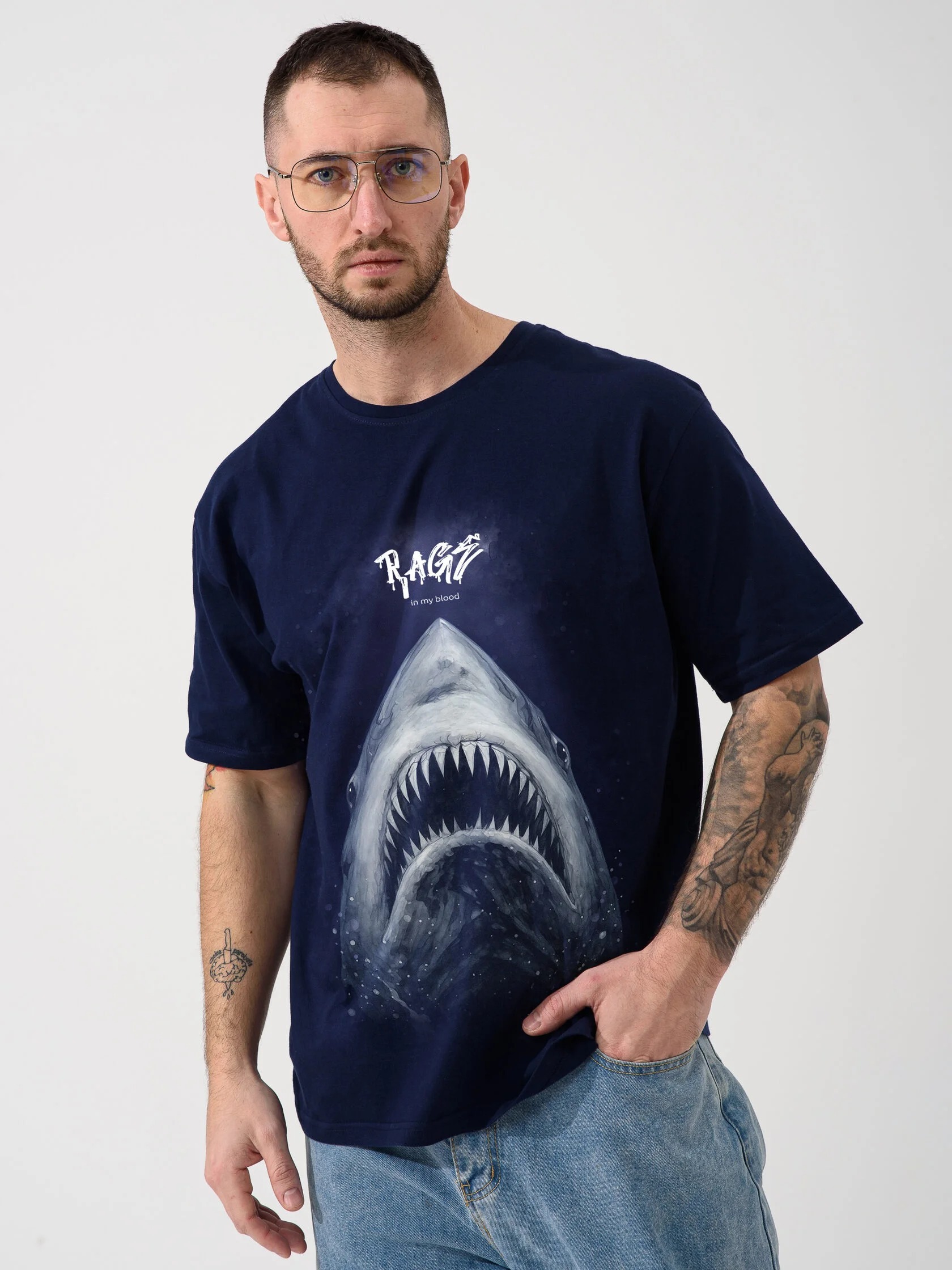 Мужская футболка "Акула" 2437-К / Синий из кулирного хлопкового полотна. Мужская футболка с короткими рукавами, с принтом на груди.