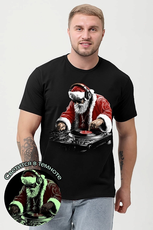 Особенность: принт светится в темноте! В ультрафиолетовом свете или полной темноте Санта засияет зелёным свечением — идеально для новогодних вечеринок, концертов или просто для wow-эффекта. Футболка из мягкого хлопкового трикотажа , oversize-крой для комфорта, круглый вырез.