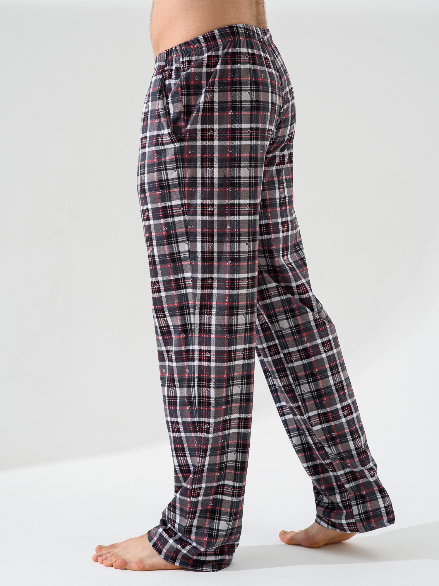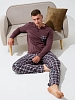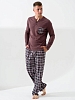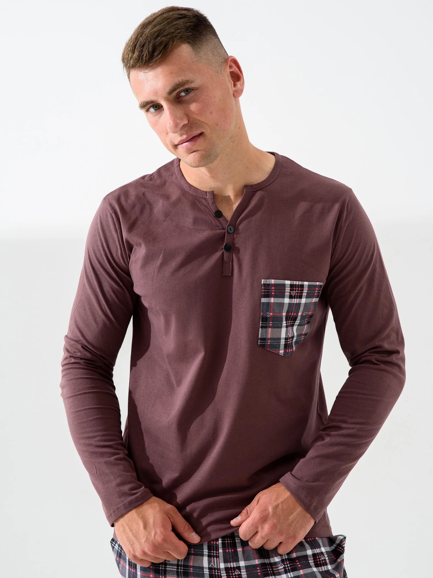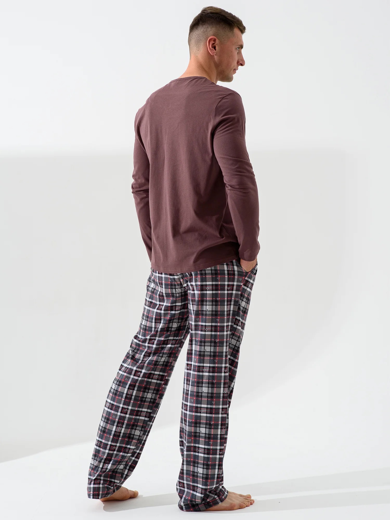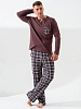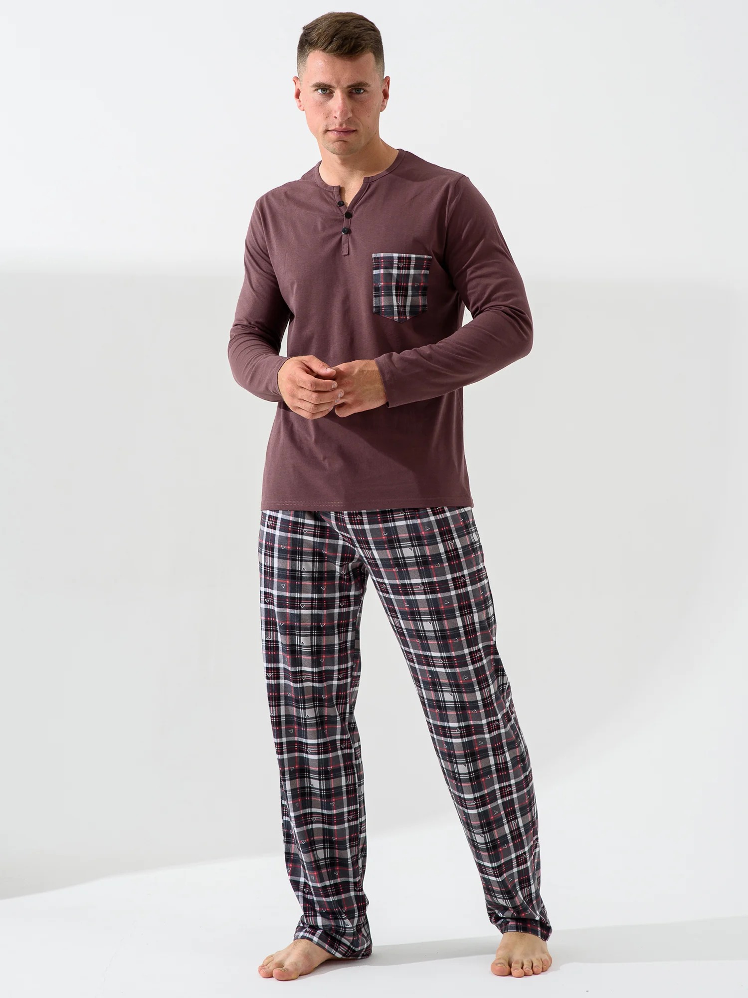 Пижама мужская "Горец" 1097-К состоит из футболки и брюк. Футболка с длинным втачным рукавом. Круглый вырез горловины на полочке и имитация планок окантованы бейкой с застежкой на петли и пуговицы. На полочке нагрудной карман. Футболка выполнена из гладкокрашеного полотна. Брюки прямого силуэта с боковыми карманами в швах с цельнокроеным поясом на резинке.