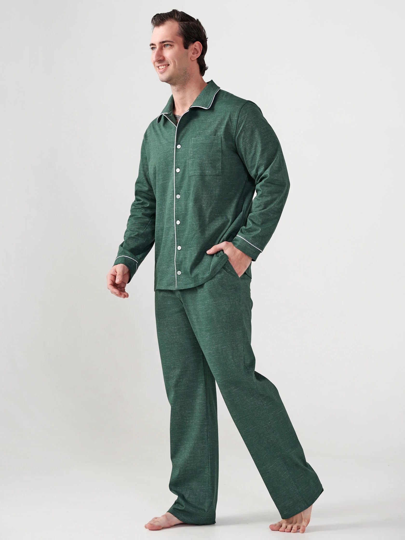 Пижама мужская "Лен" (классическая) 2417-К / Зеленый состоит из пижамной куртки и брюк.