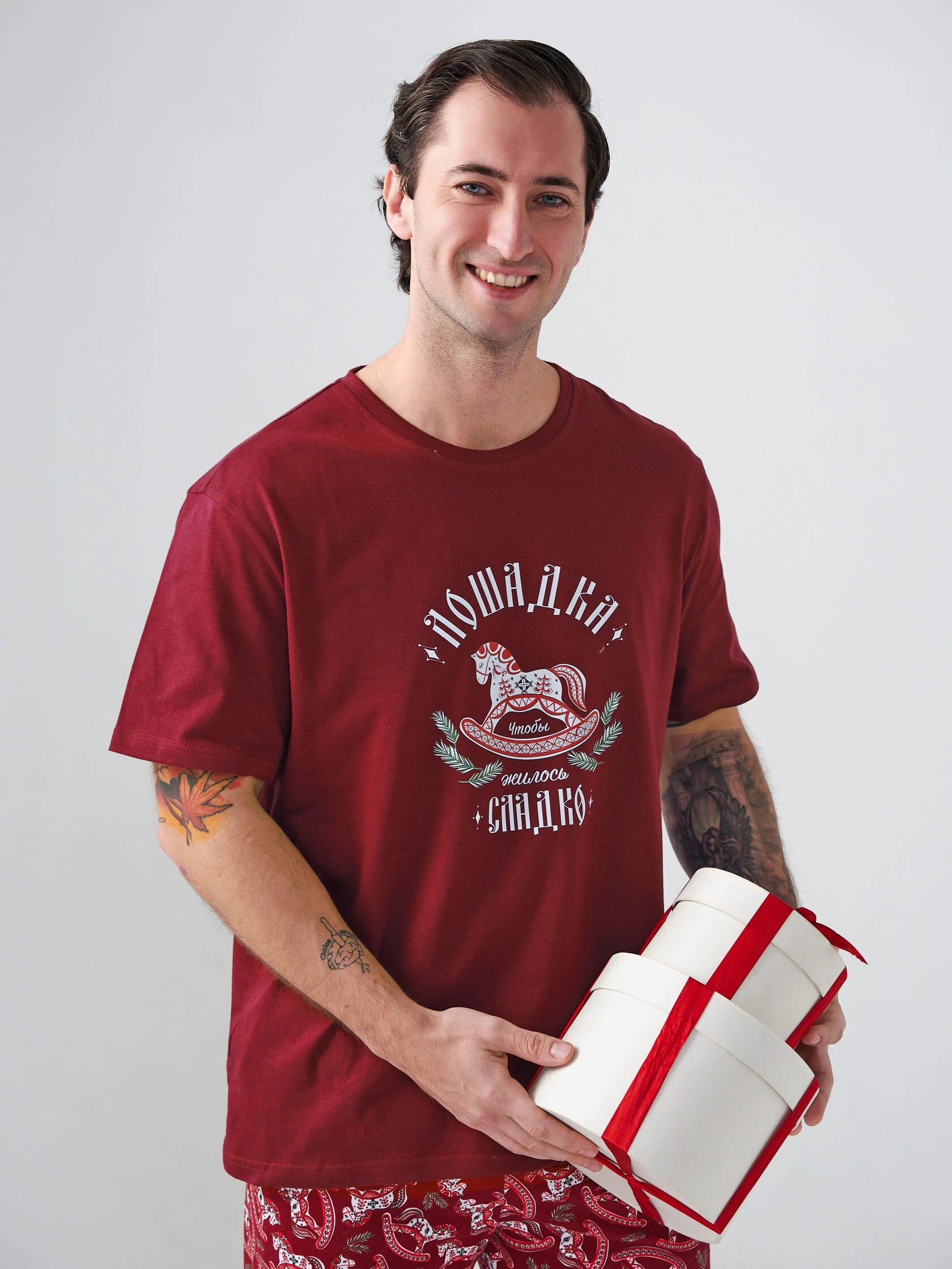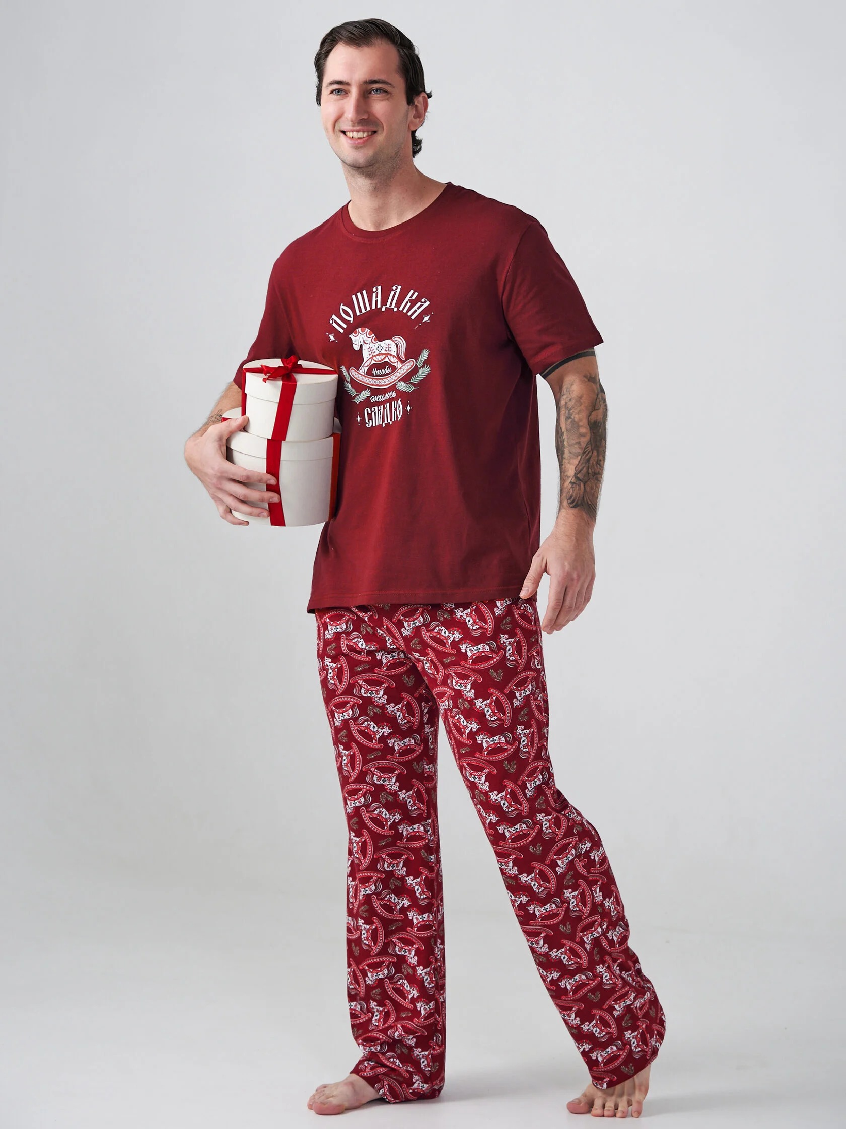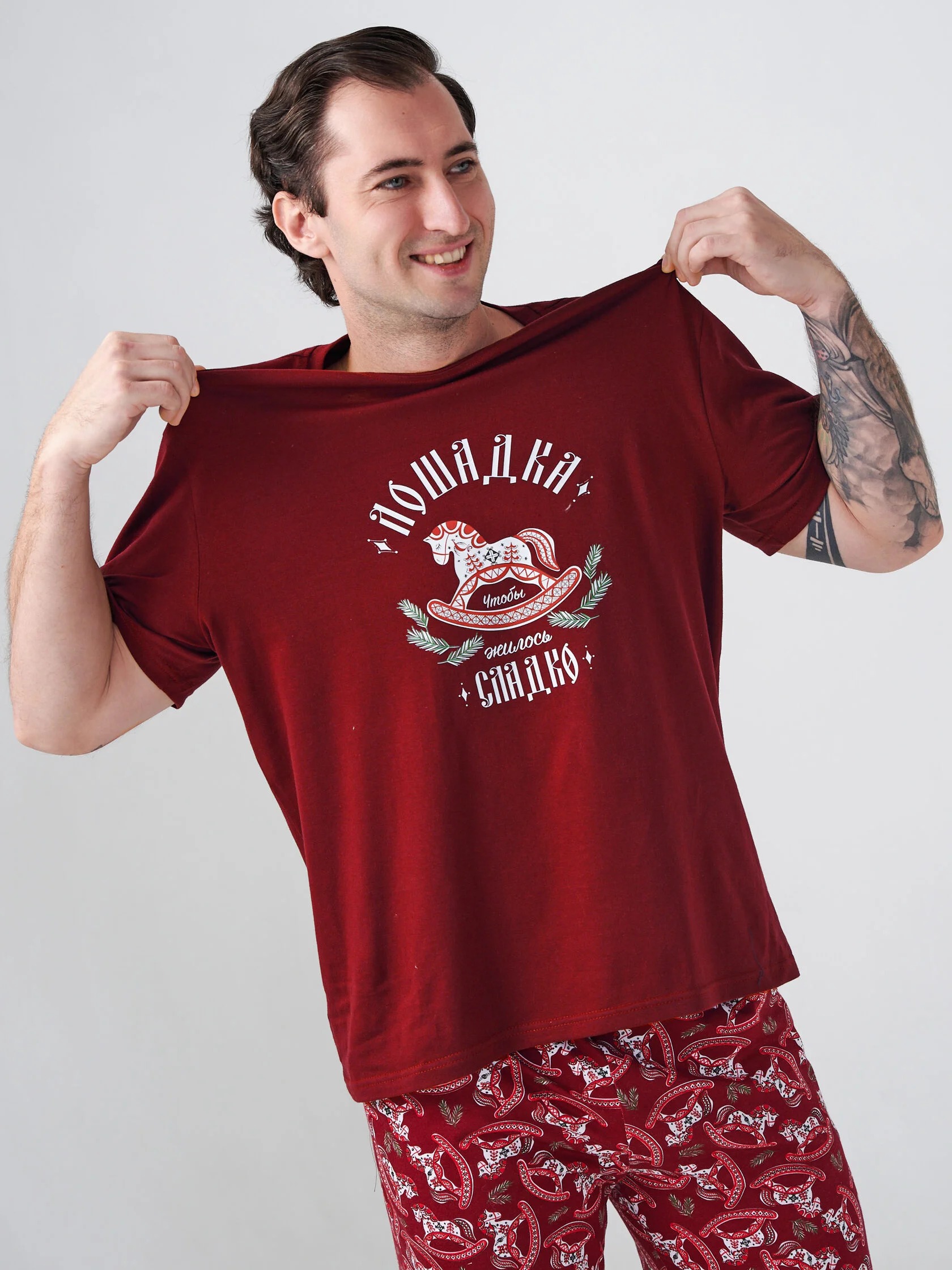 Мужская пижама "Лошадка" 2415-К / Бордовый представляет собой стильный домашний комплект, состоящий из футболки и длинных брюк. Модель выполнена из натурального хлопка, что обеспечивает максимальный комфорт при носке.