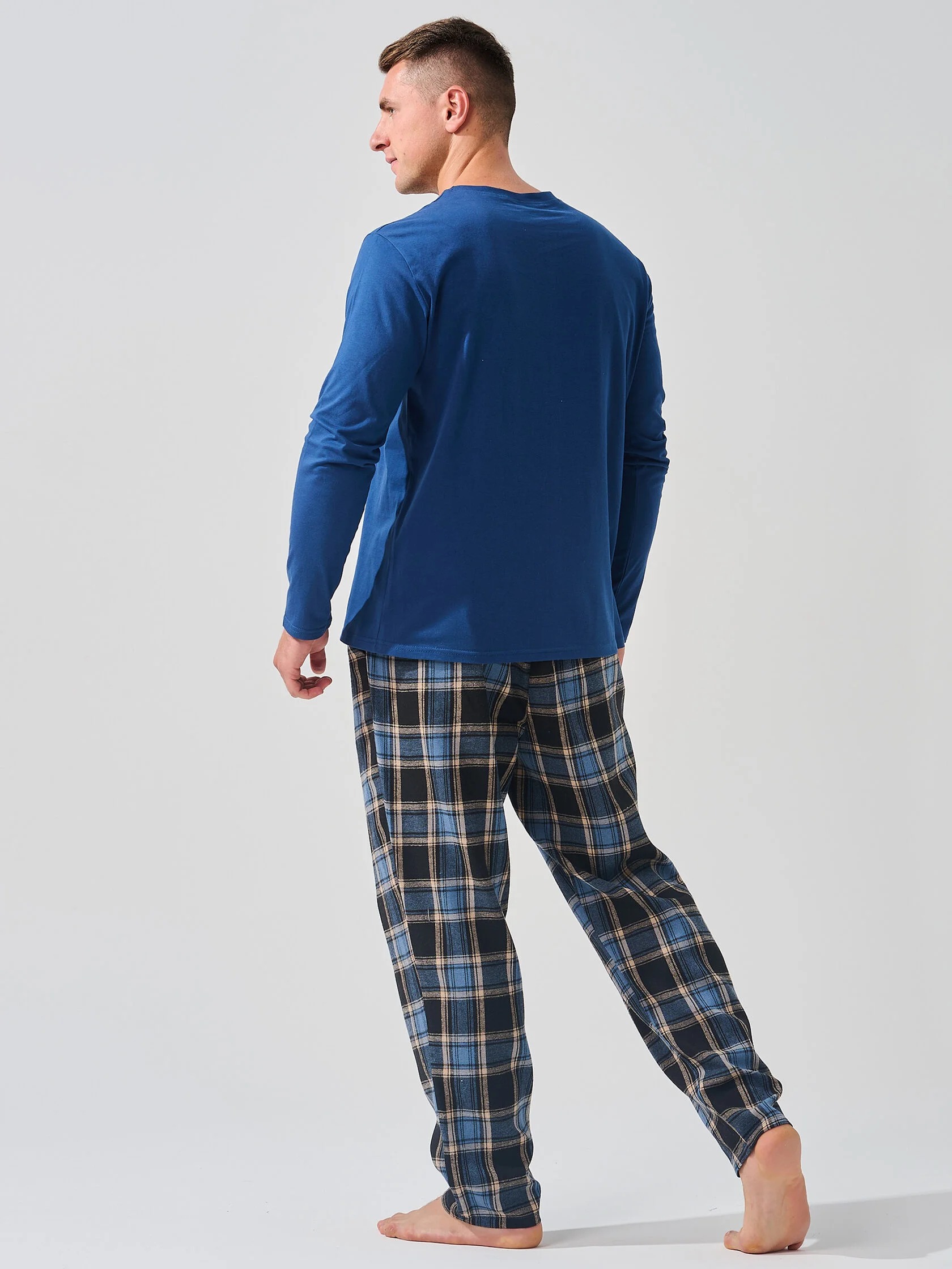 Мужская пижама "Мост" 2397-К/Ф состоит из лонгслива и свободных брюк. Мужской костюм отшивается из комбинированных тканей - верх из кулирки, брюки из фланели.