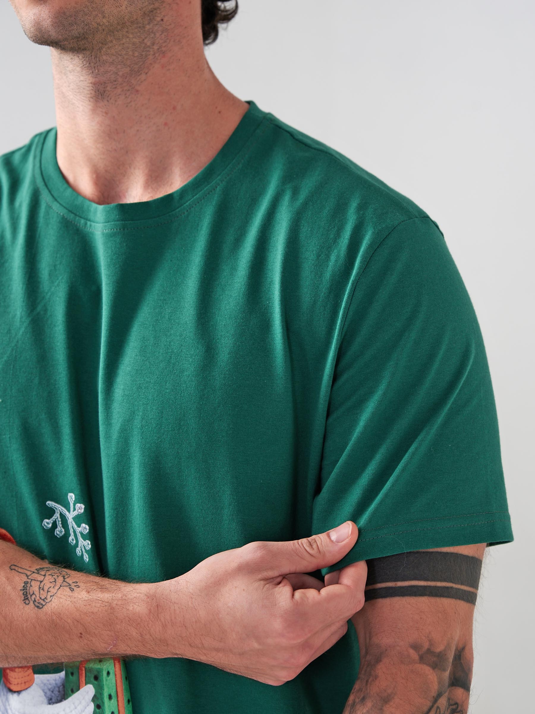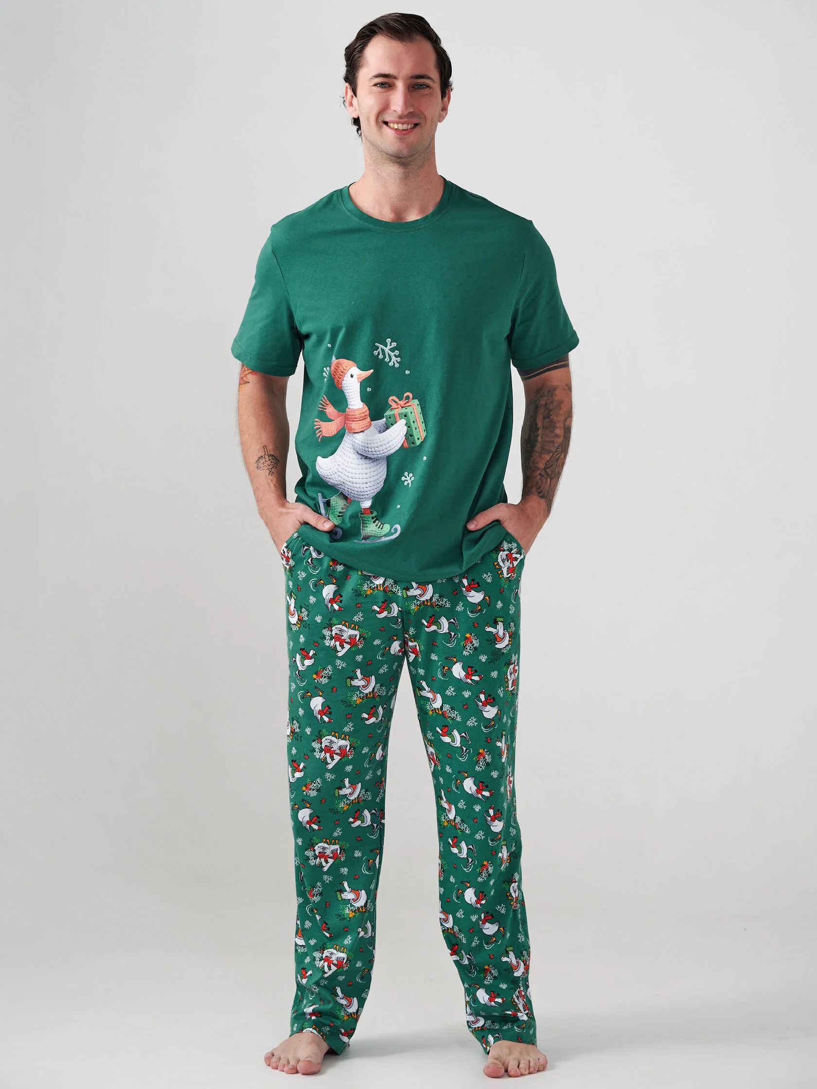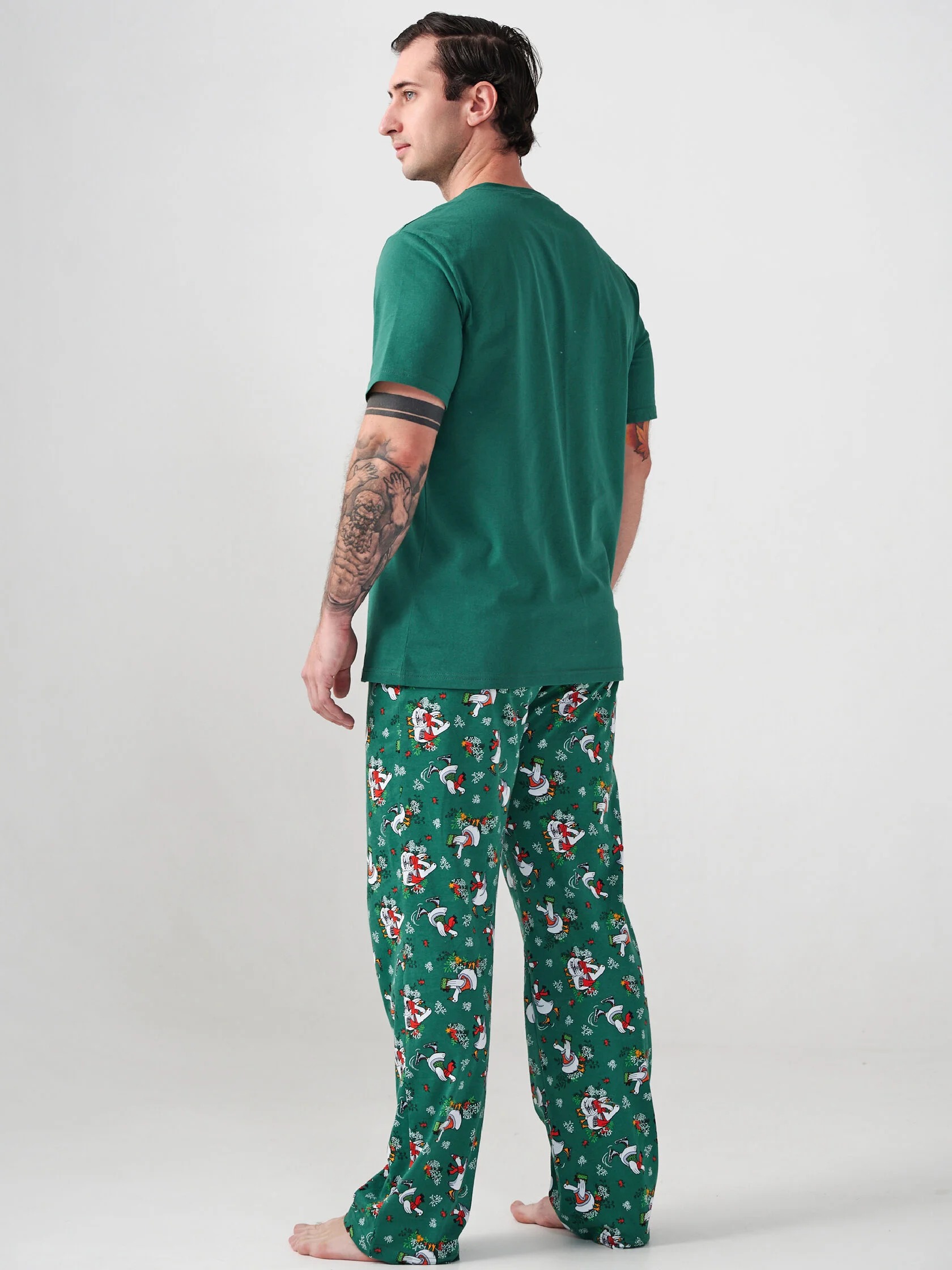 Мужская пижама "Зимние забавы" 2410-К / Зеленый представляет собой стильный домашний комплект, состоящий из футболки и длинных брюк. Модель выполнена из натурального хлопка, что обеспечивает максимальный комфорт при носке.